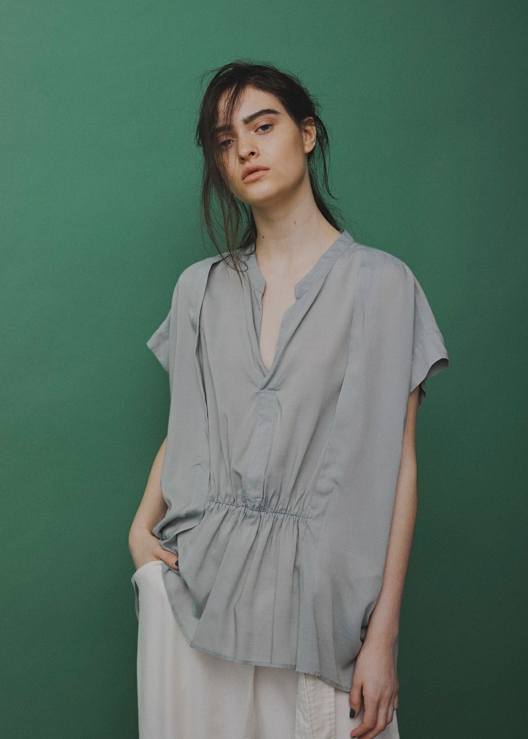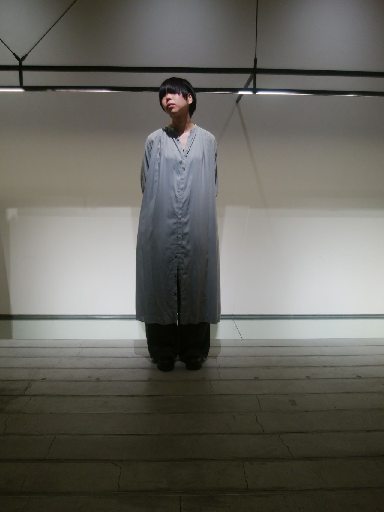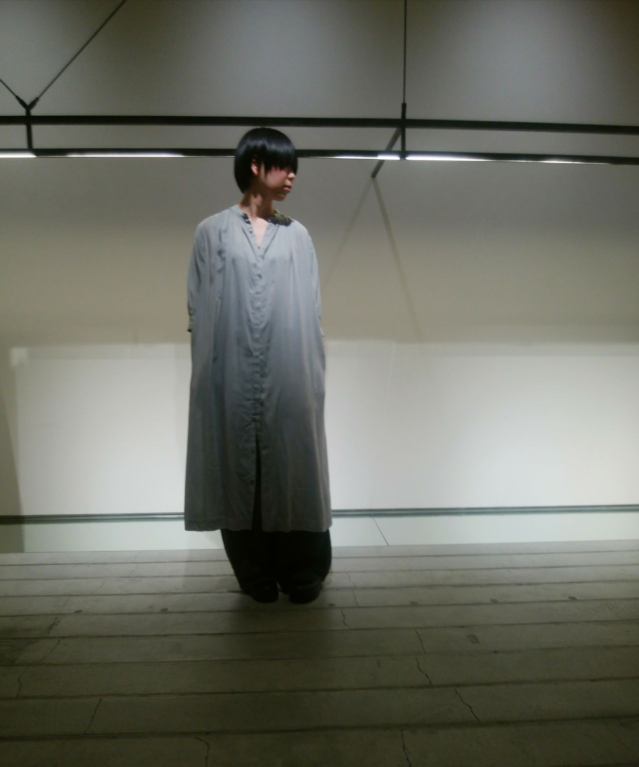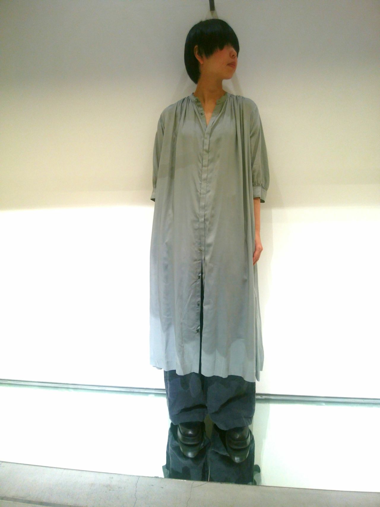 淡い綺麗なグリーンのロングワンピースを主役に、ボトムにはボリューム感のあるワイドパンツを合わせました。