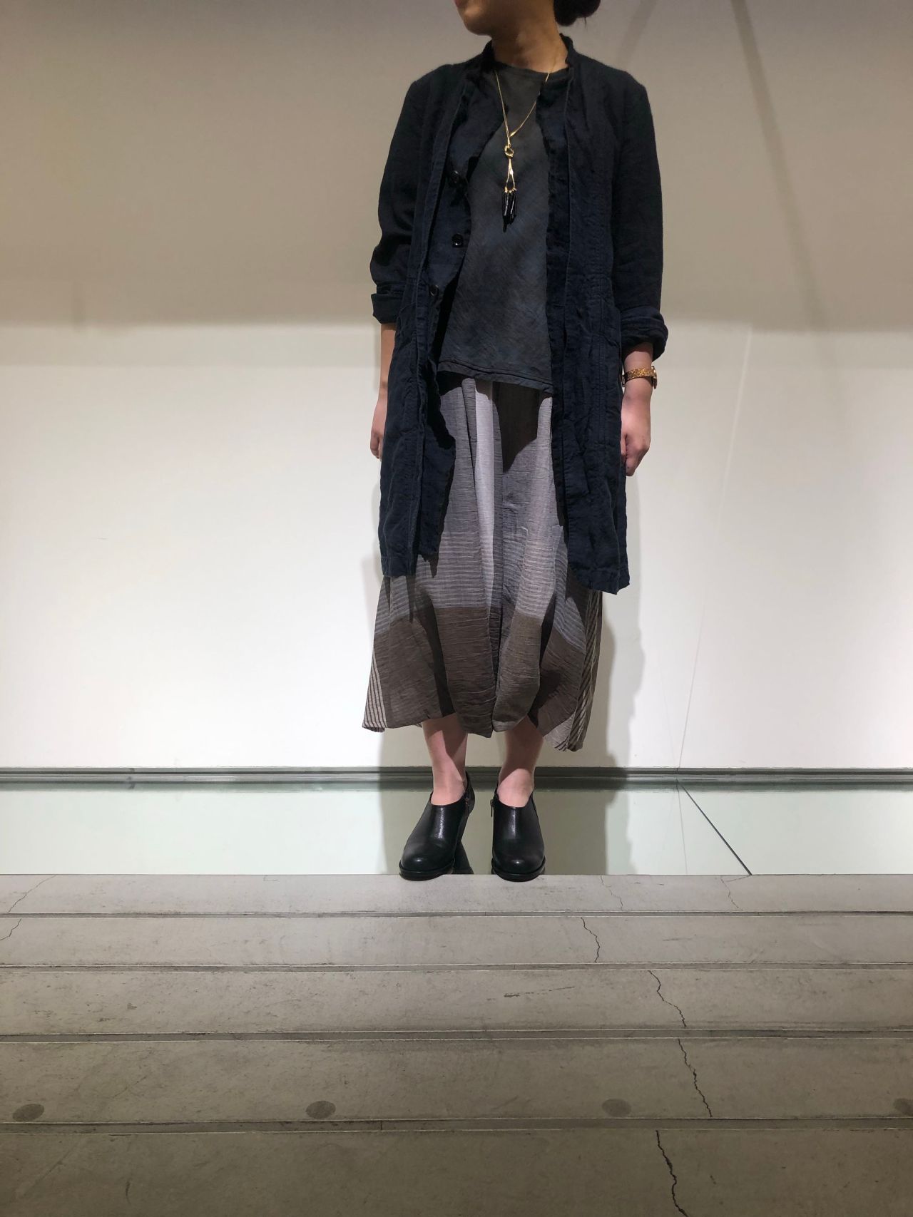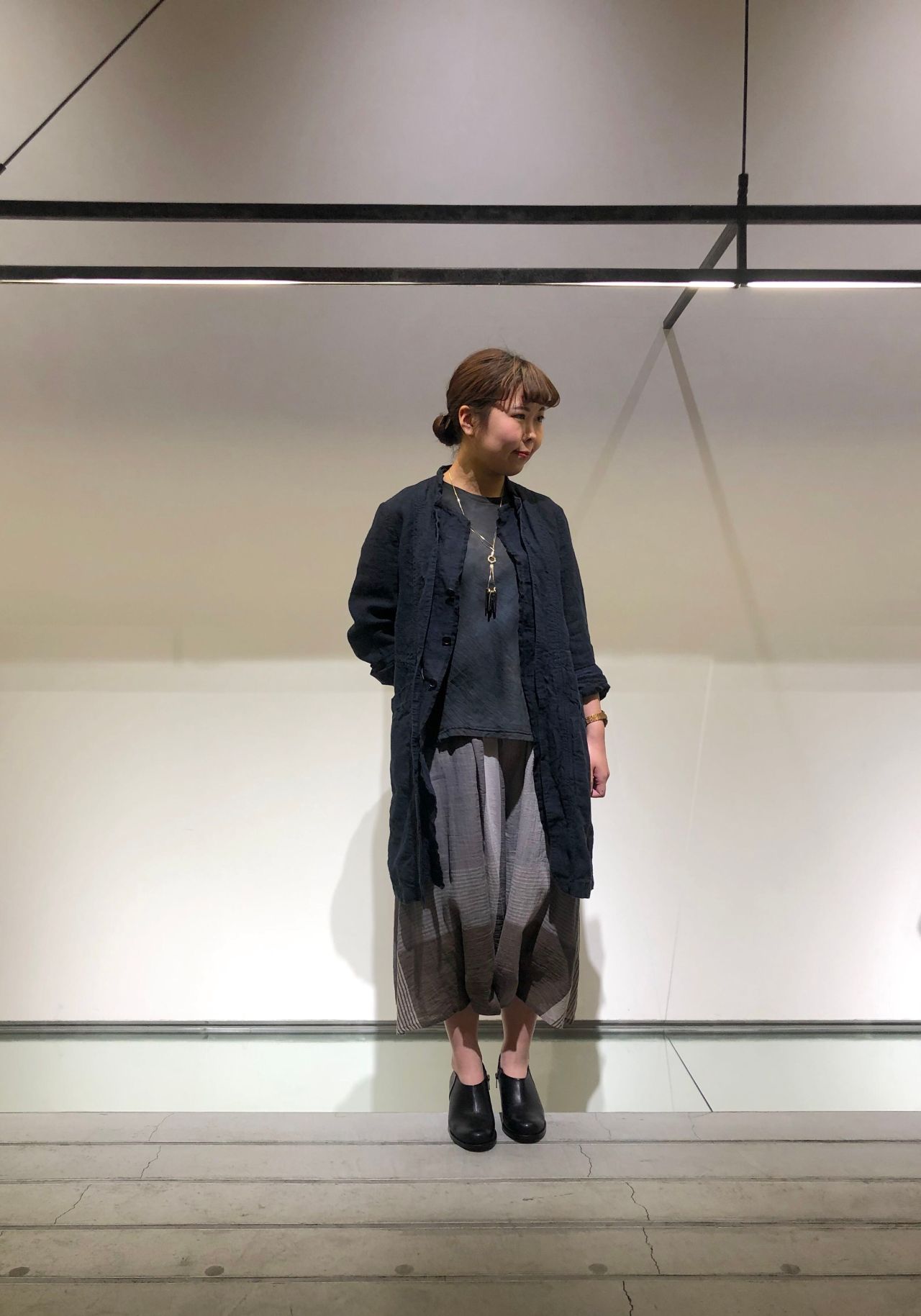 すっきりとしたシルエットのリネンコートを合わせて落ち着いた印象に。