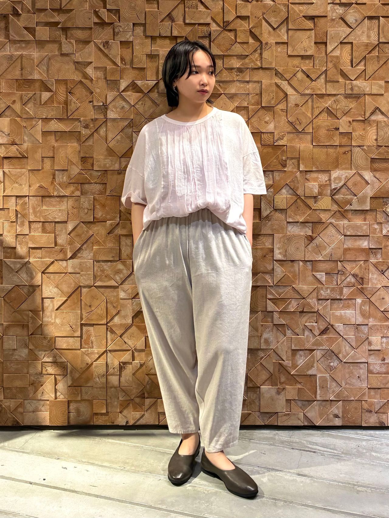 定番のTシャツよりもフェミニンさが引き立って優しい印象に。