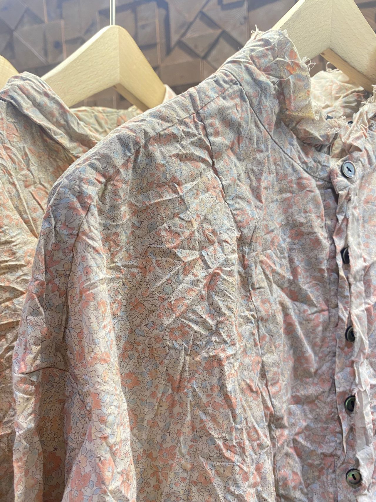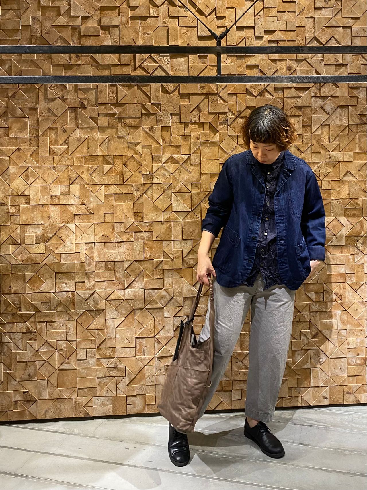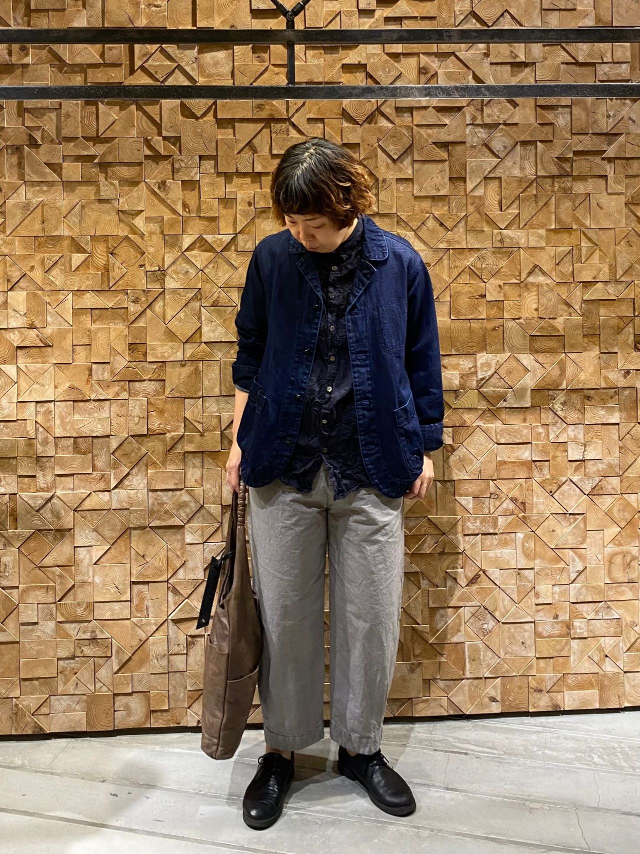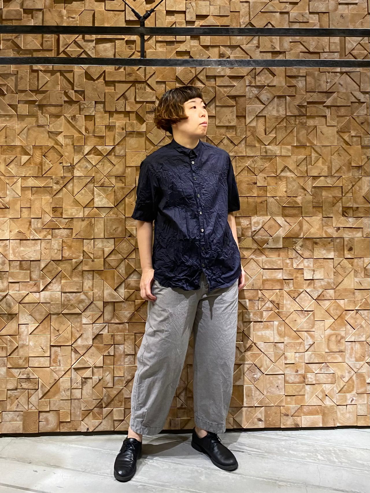 プリントの上から製品染めを施しているため、スタッフ着用のネイビーカラーは色と柄がとても馴染んでおりクリーピングタイムモチーフの総柄をほんのり感じることが出来ます。