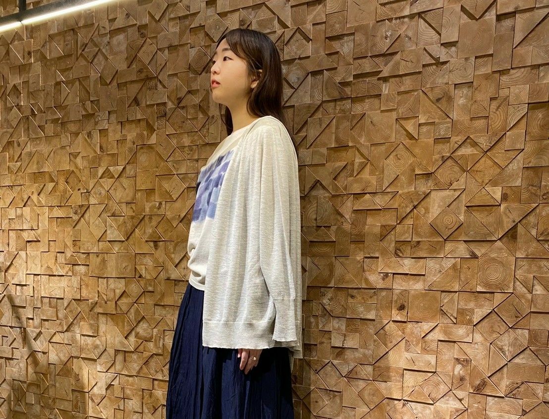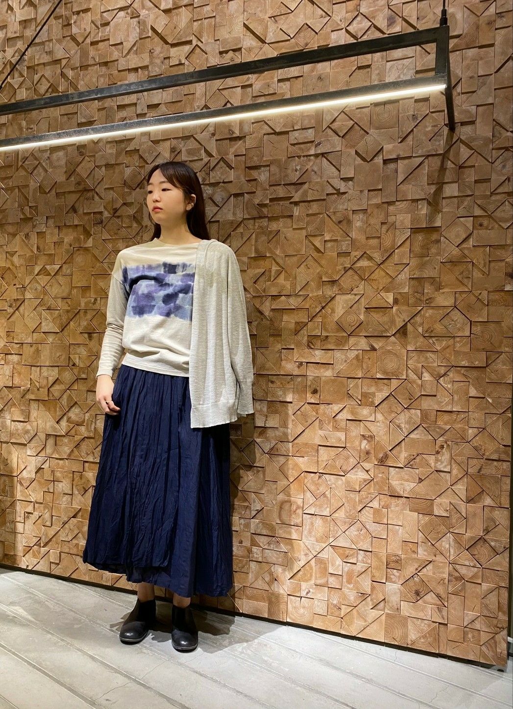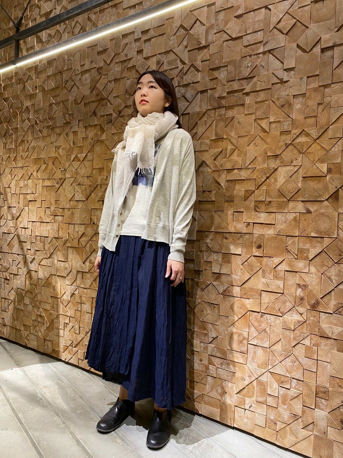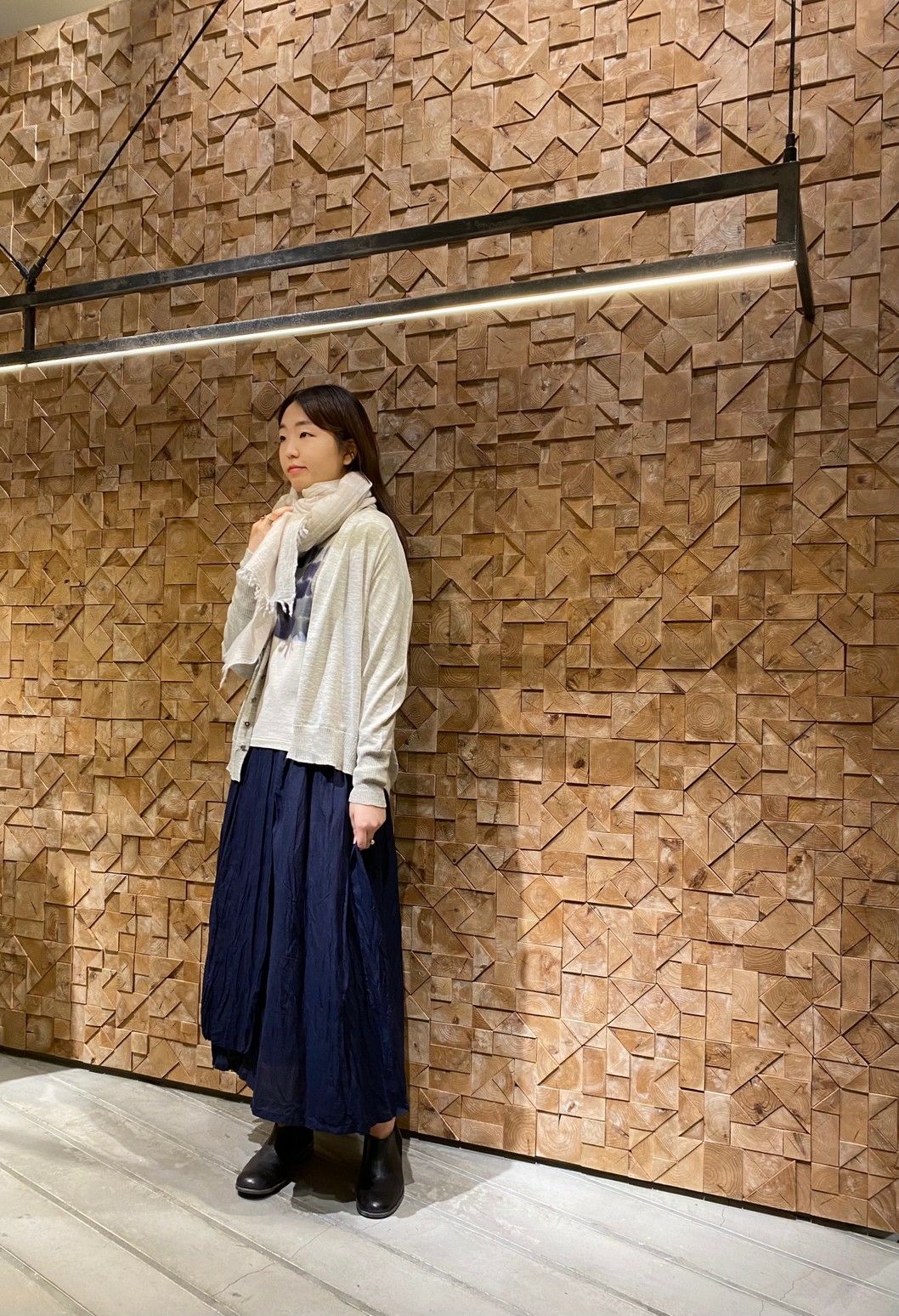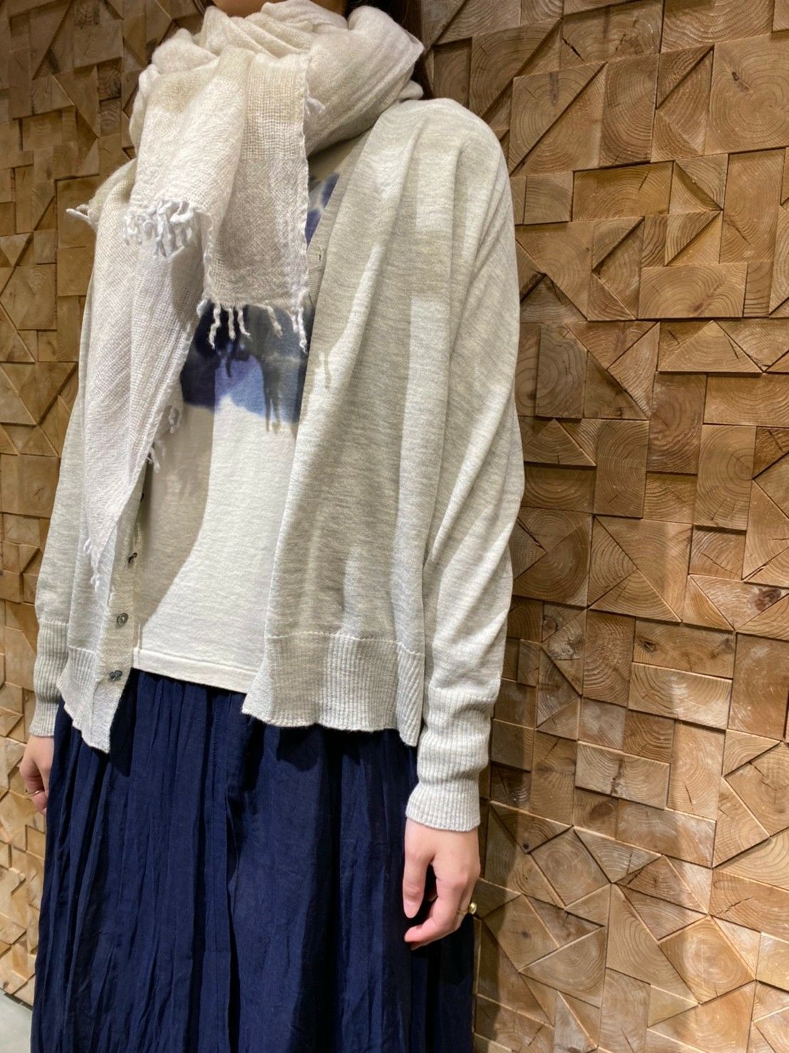 今回は折り紙染めが特徴のカットソーに合わせてみました。カシミヤの素材感が全体を優しい雰囲気にまとめてくれます。肩にサラッと掛けるだけでも包み込んでくれるような暖かさと着心地はカシミヤならではです。