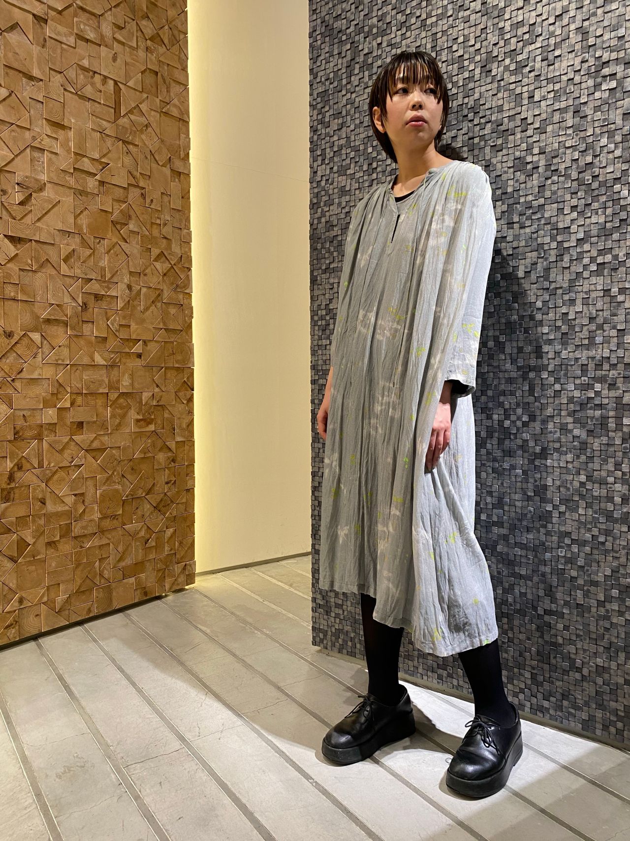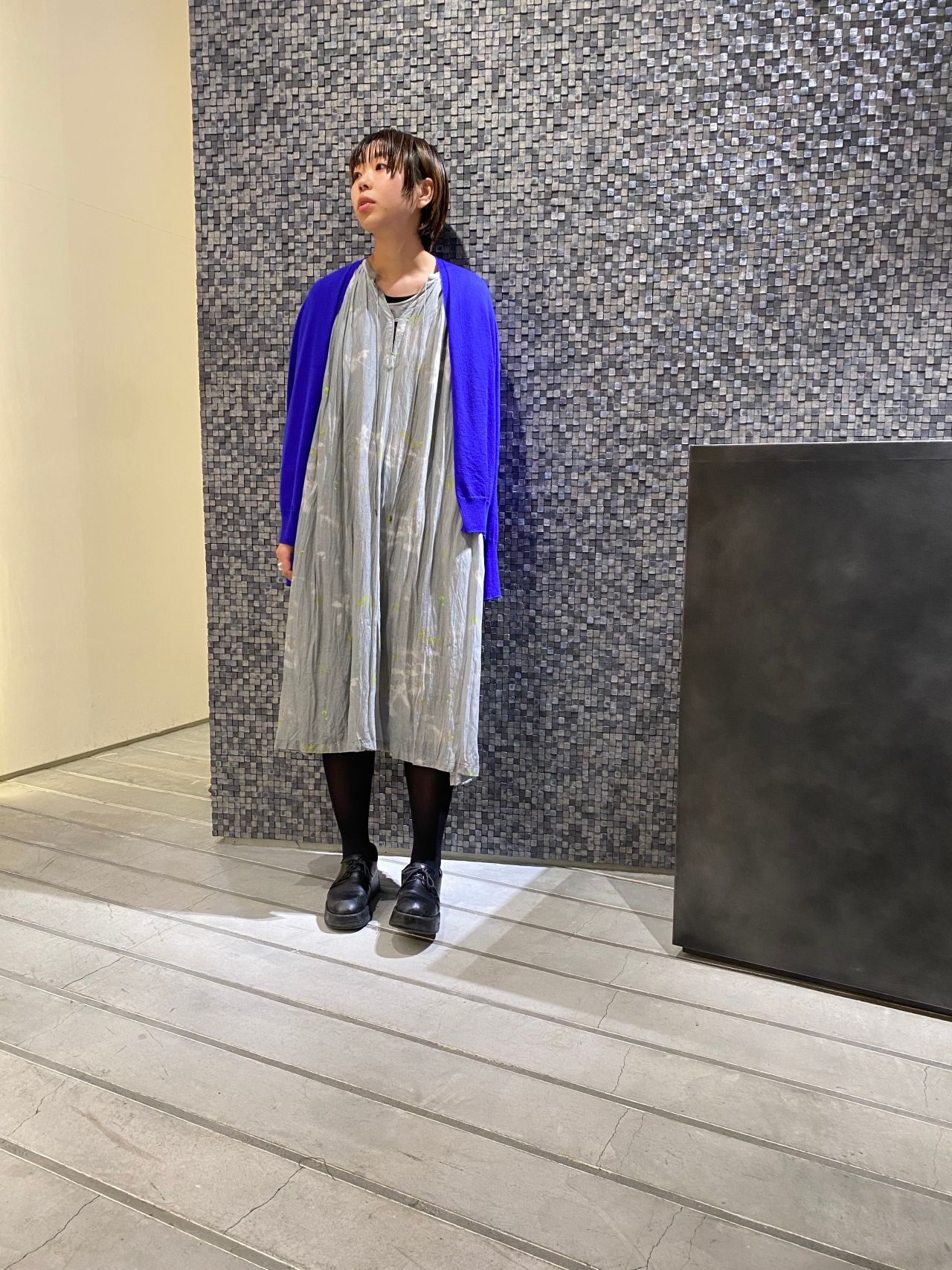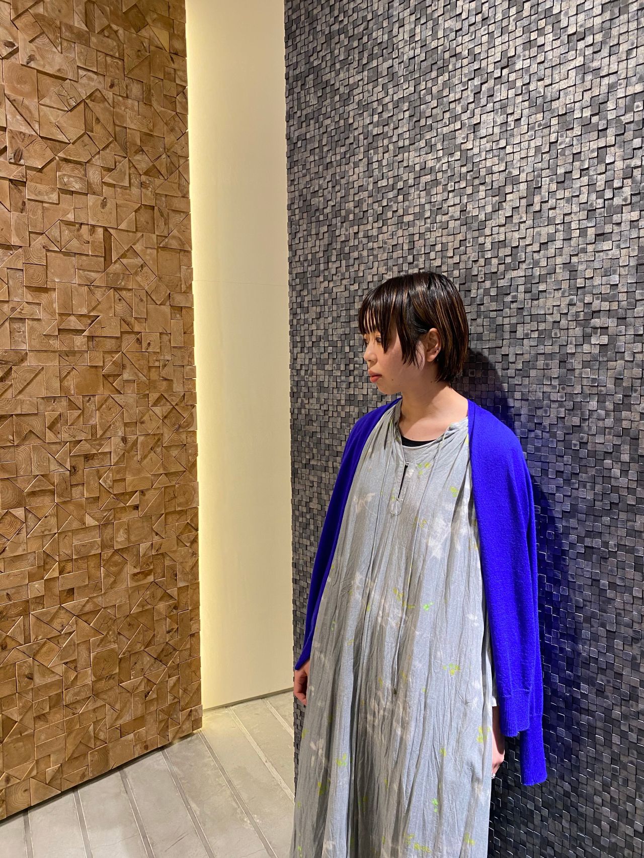 引き込まれそうなブルーのカーディガンには春のアイコンの淡いグレーのワンピースを合わせました。
