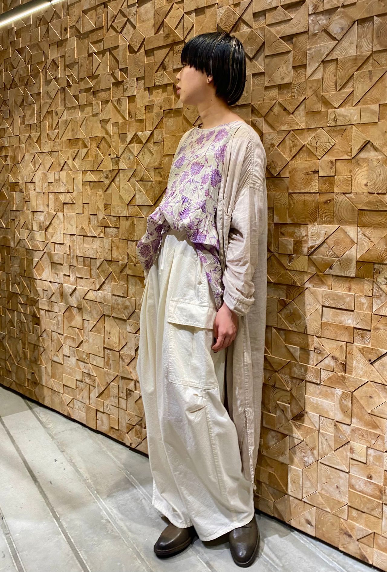 柄の存在感を活かすように、全身のトーンを合わせスタイリングしました。