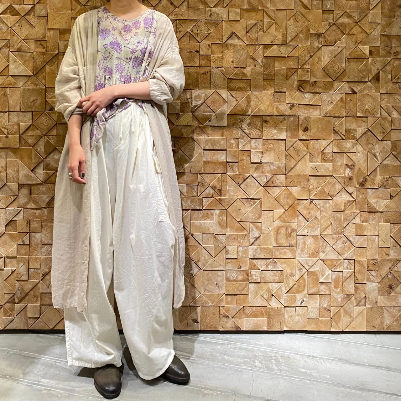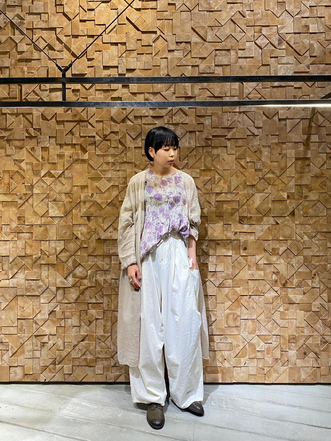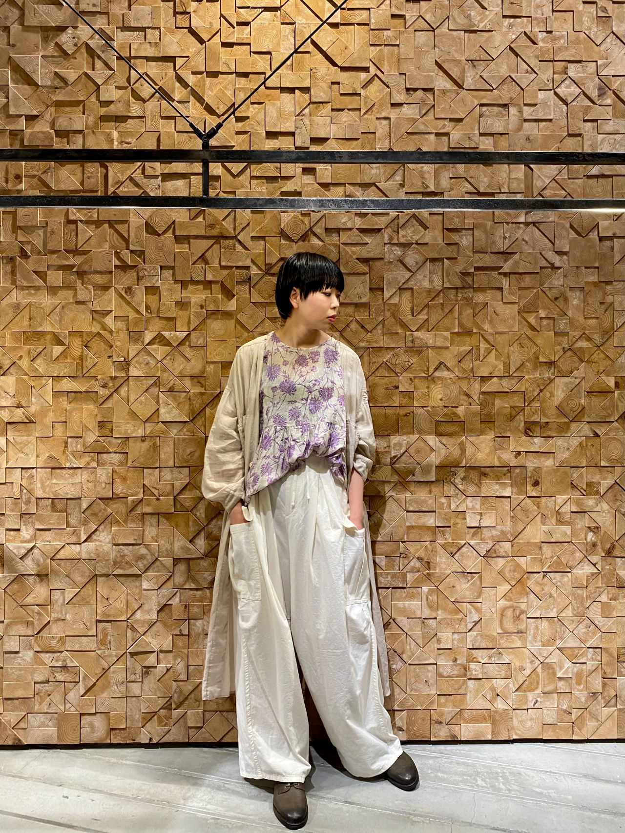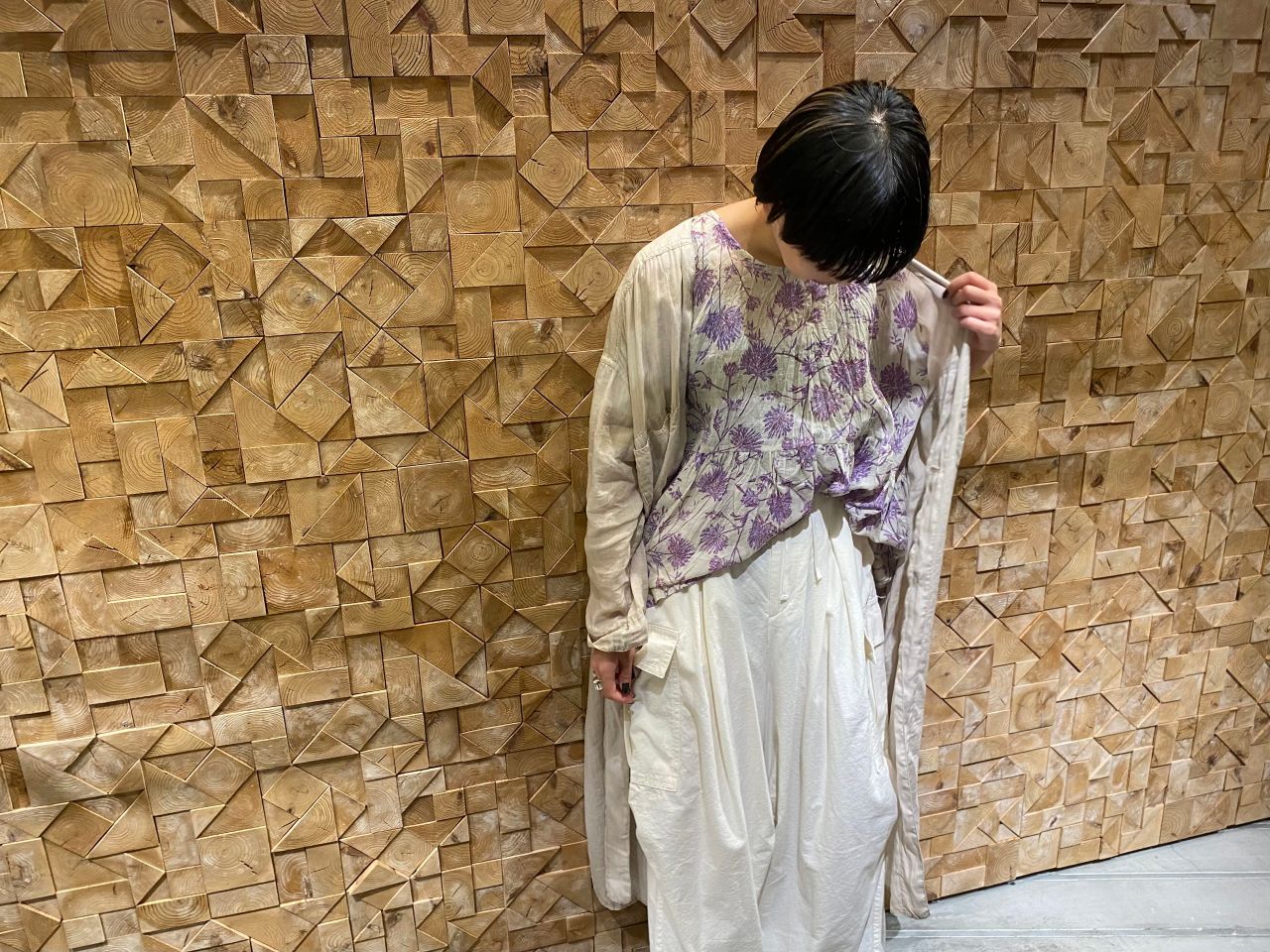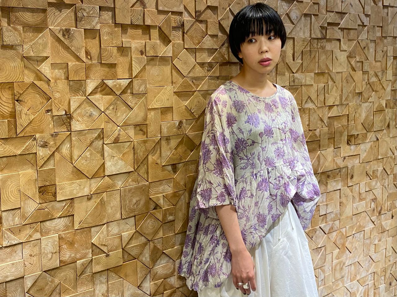 色味・デザインにこだわったフラワーモチーフの柄で1枚でも存在感があり様になるブラウスですが、ドライタッチな清涼感のある薄手の素材なので夏でもレイヤードスタイルを楽しむことができます。