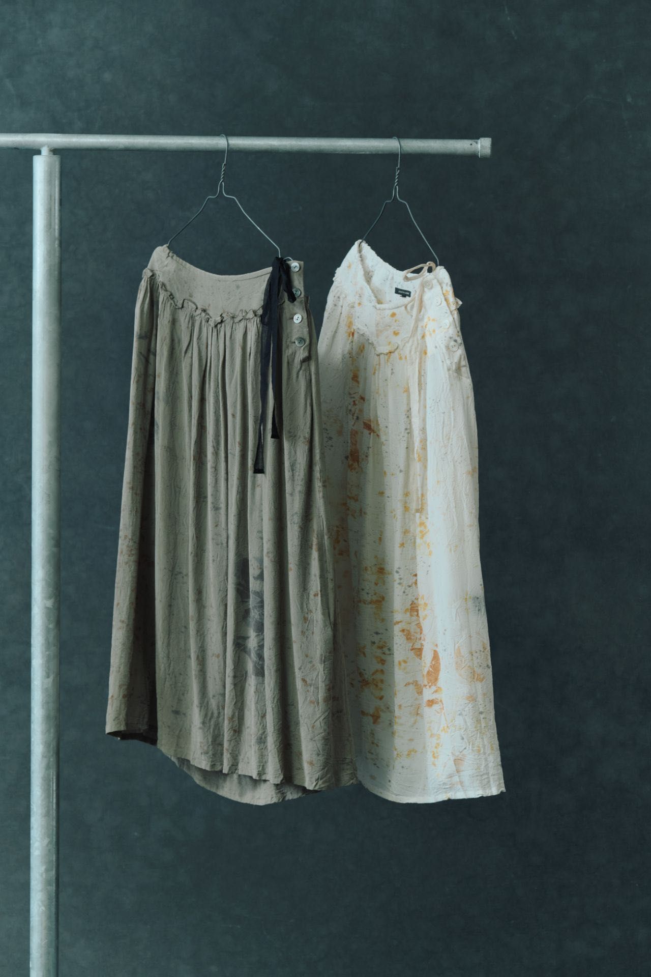 染料をふくませた擬似植物を並べて巻きつけるバンドルダイと、微細な点を描くスパッタリングのデザイン。