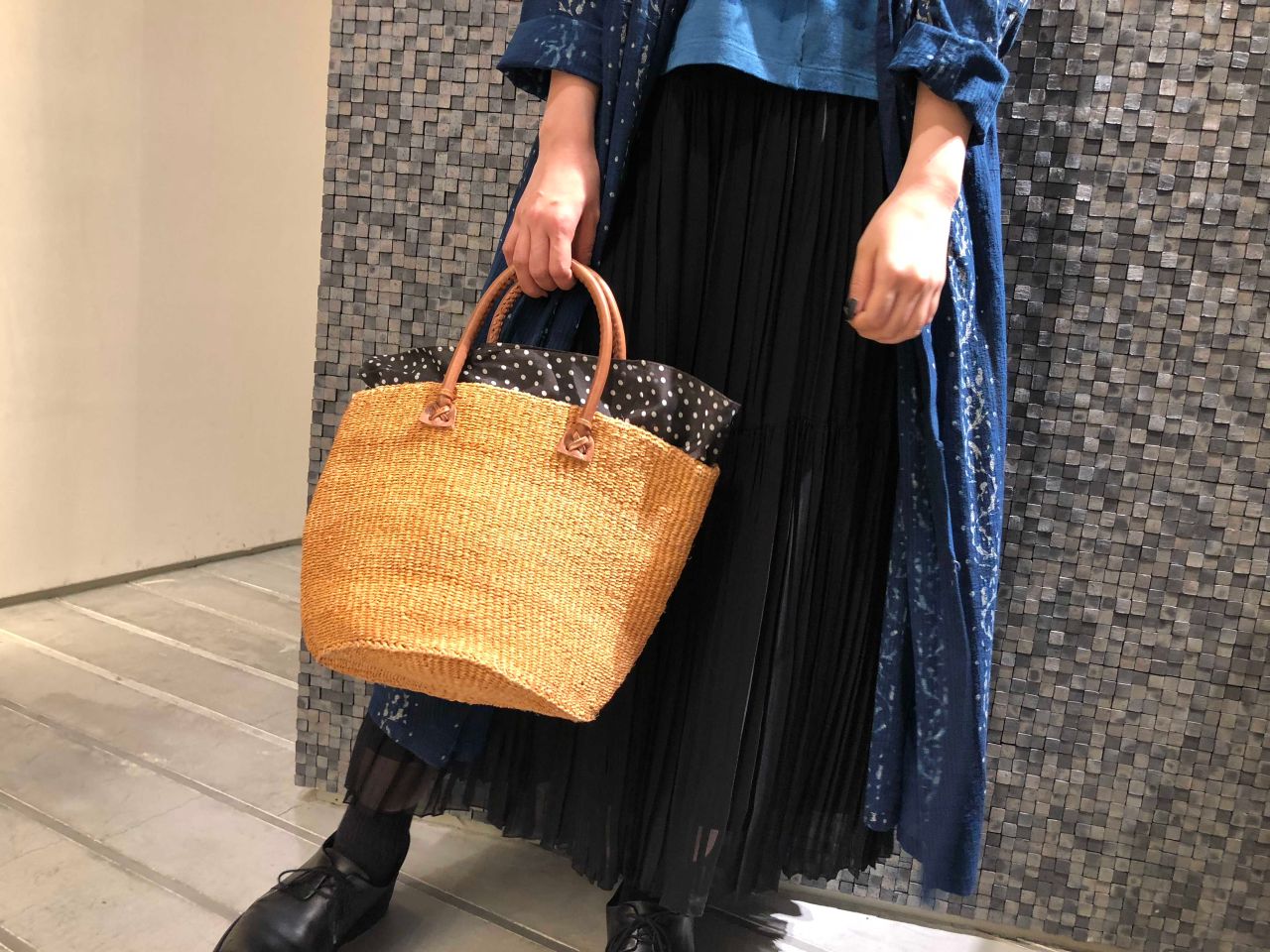 ノベルティのカゴバッグを合わせて。
