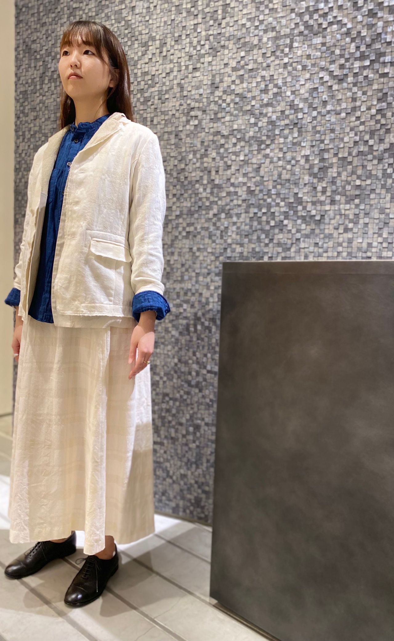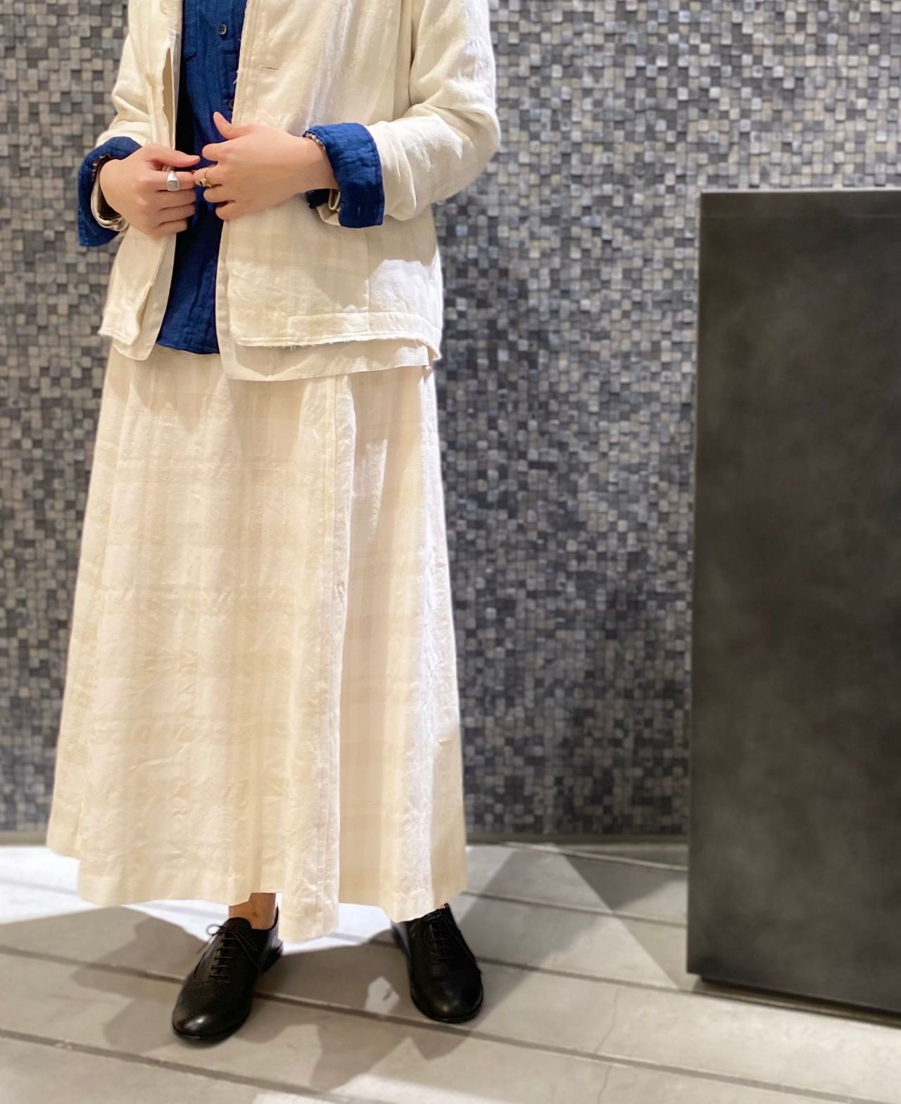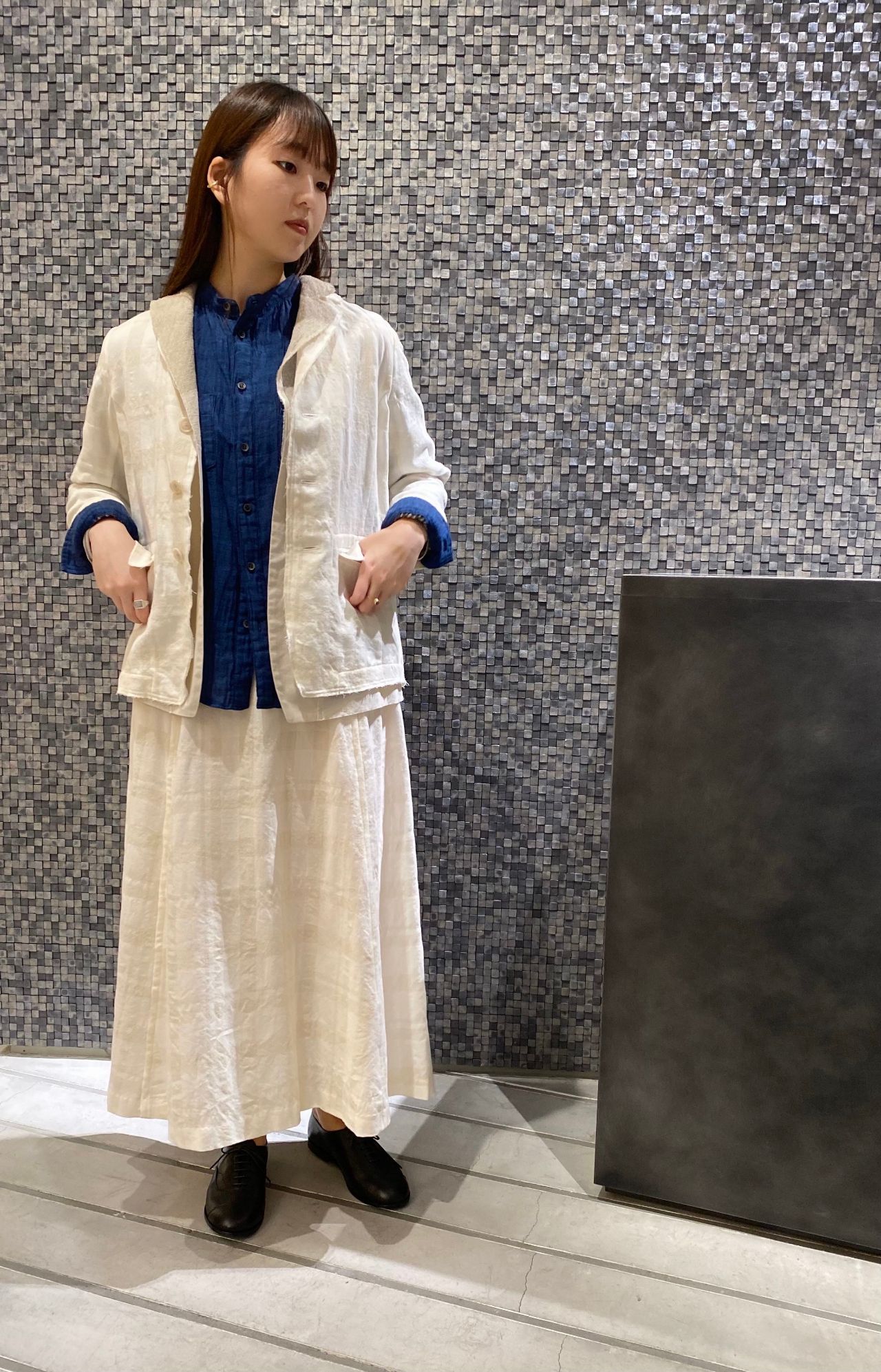 パドカレらしい素材感のある二枚重ねのジャケットが1枚あるだけで素敵な雰囲気を演出してくれます。