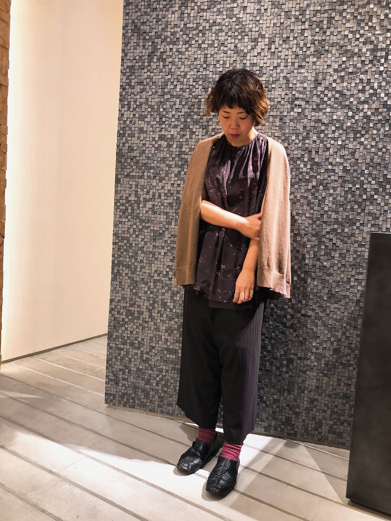 秋を先取り、優しいブラウンで統一したコーディネート。