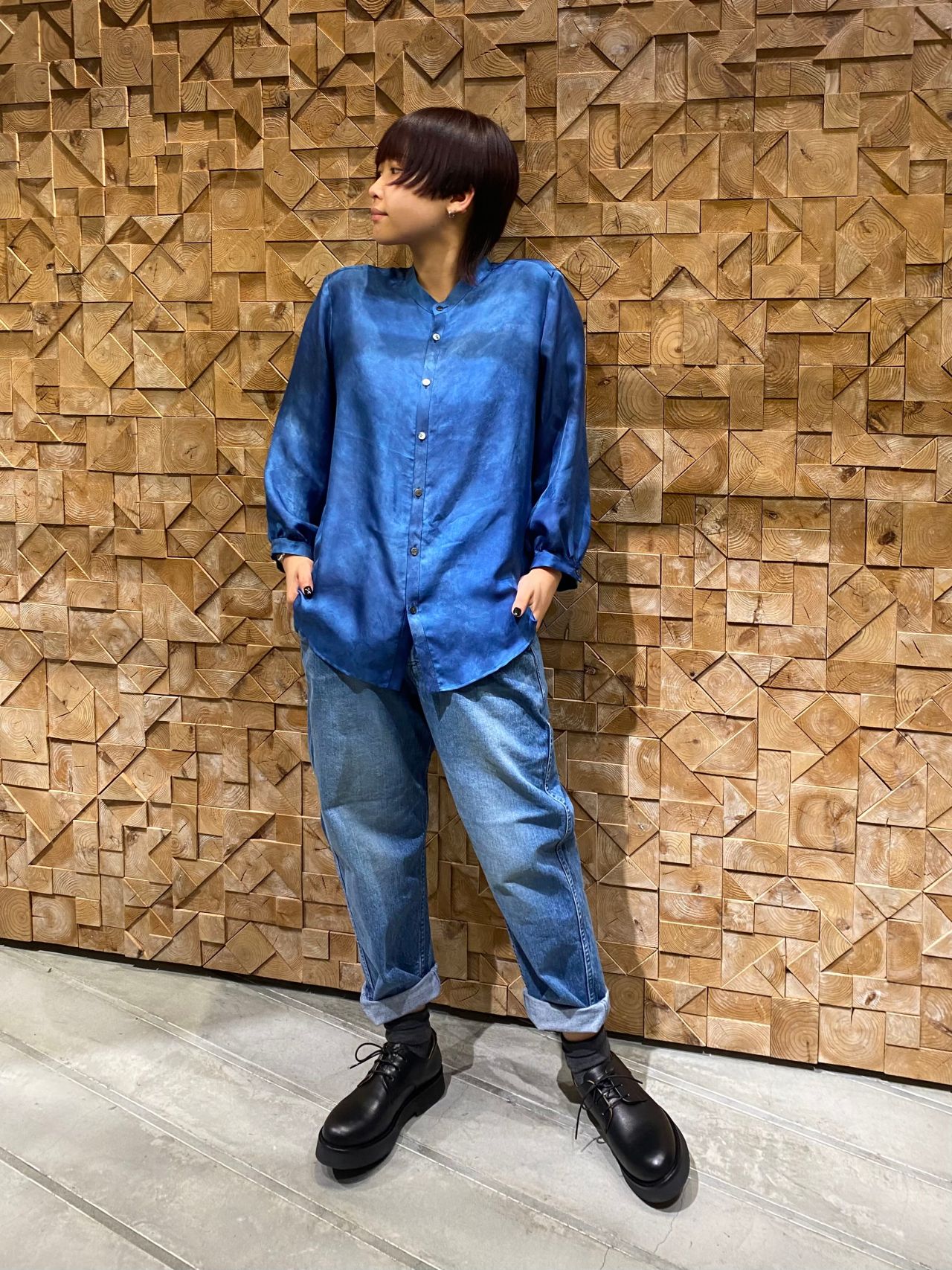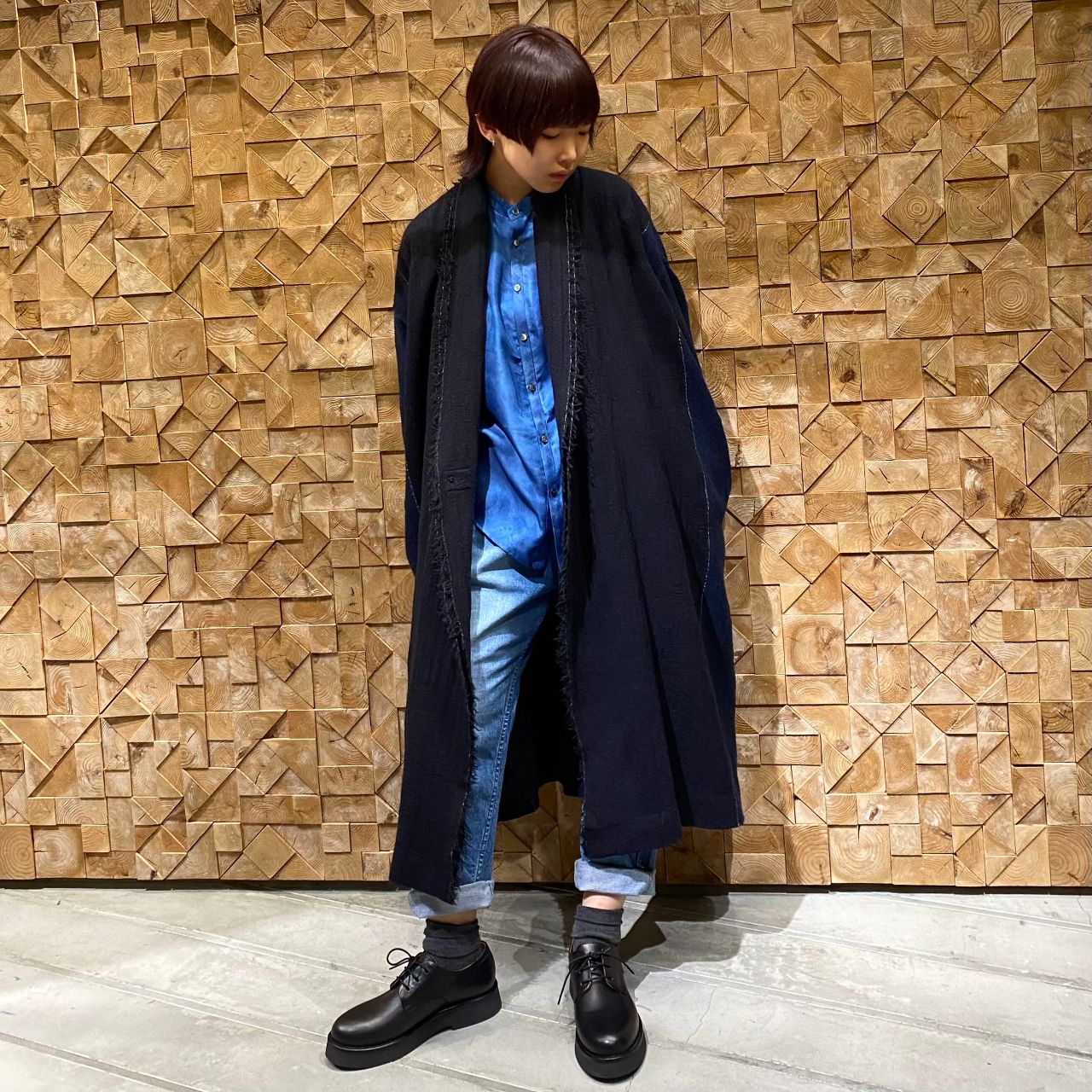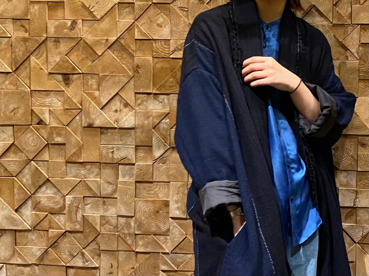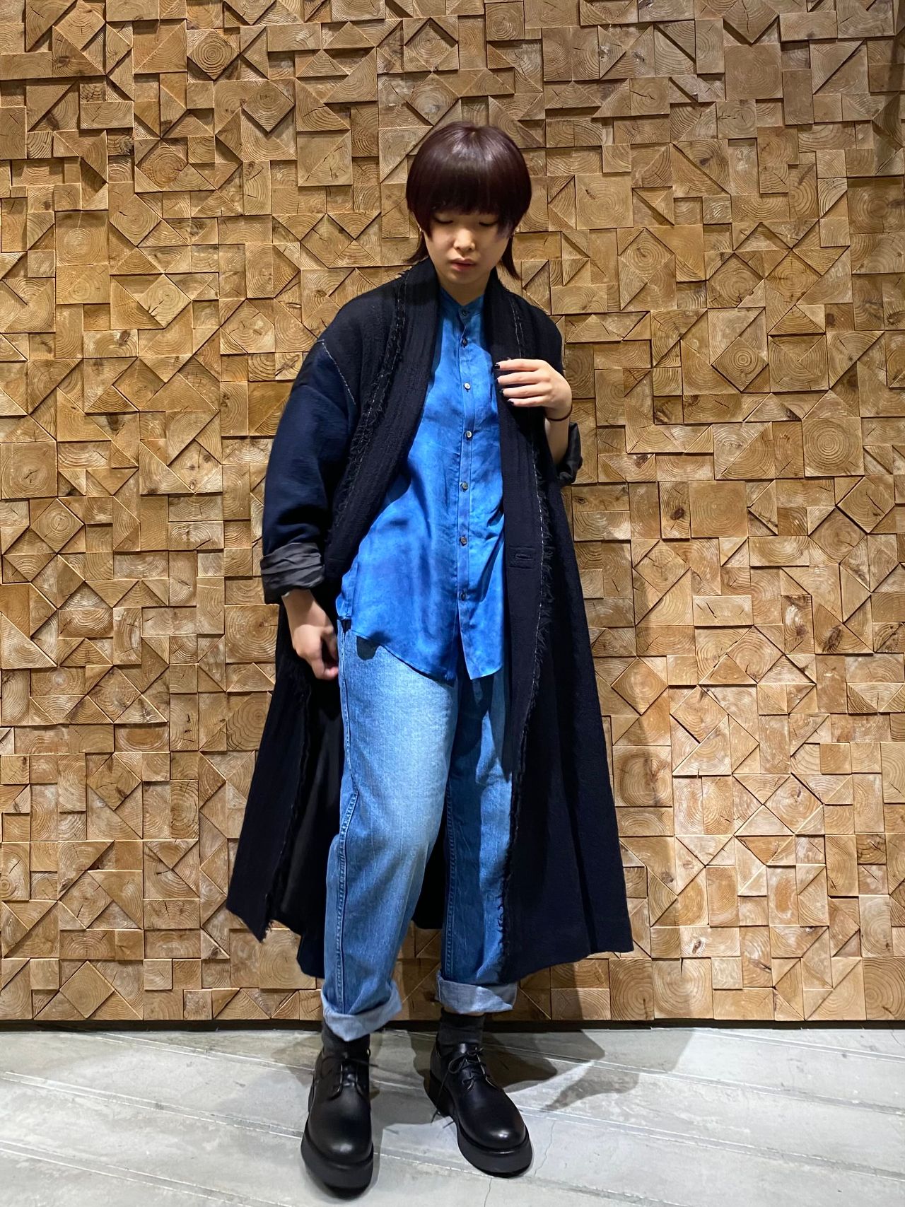ウール素材で温かみのあるコートと藍染のシルクブラウスの組み合わせで高級感を持たせつつ、コートのブルーに合わせたデニムを着用しカジュアルに落とし込みました。