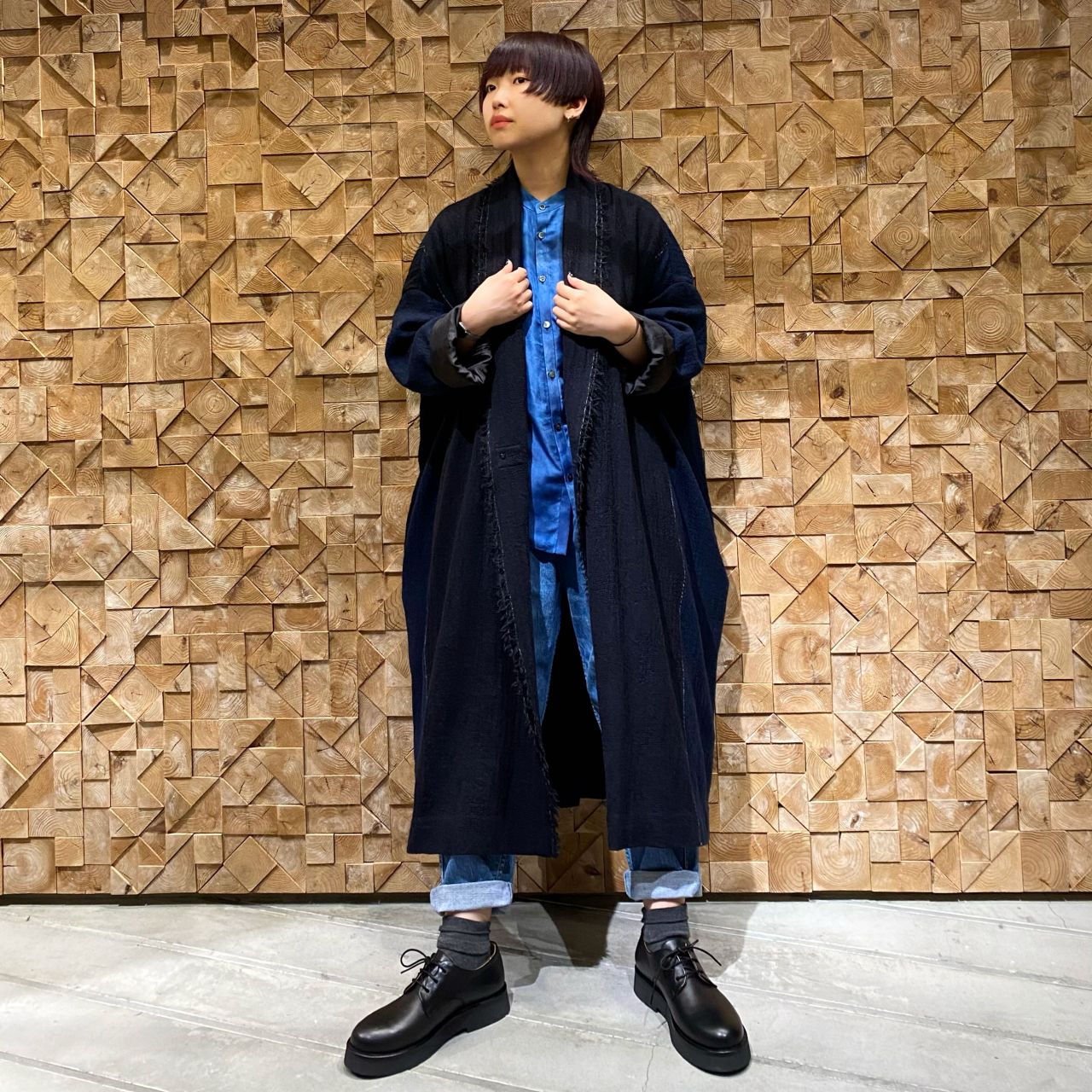 色の切り替えを意識したカラー表現と耳端の糸の色まで意識して作成したこだわりの素材で仕立てたコートです。立ち上がり襟から前端の耳使いがパドカレらしい仕上がりになっています。