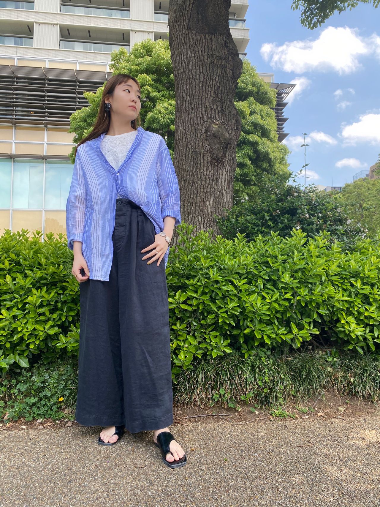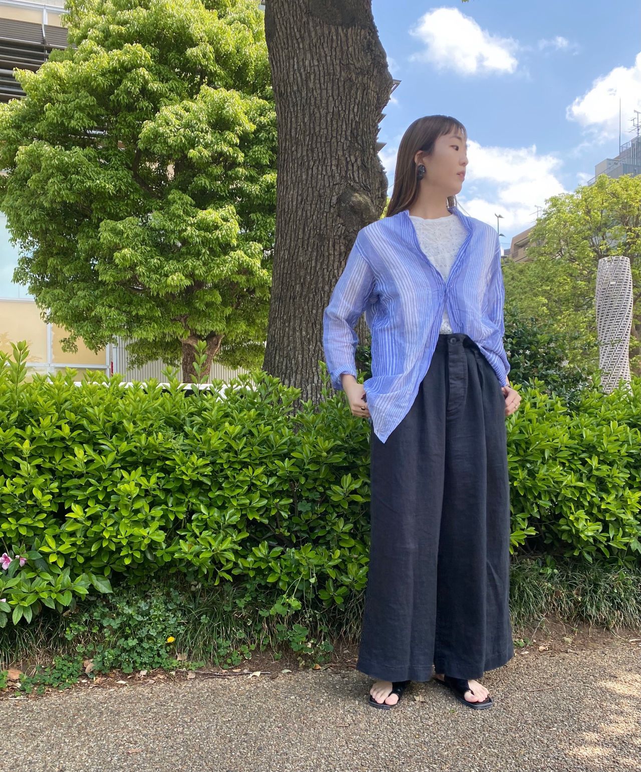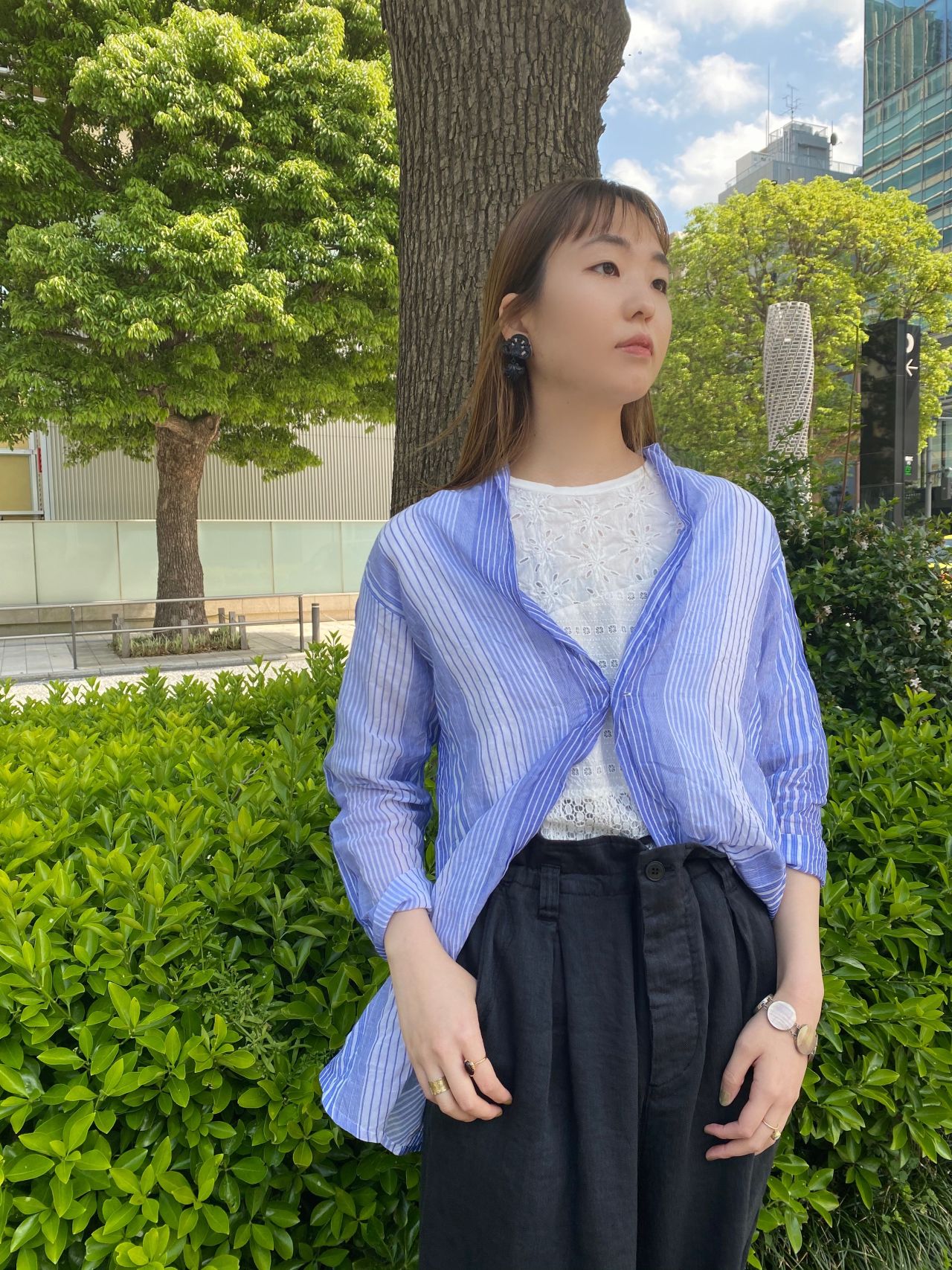 外に出ての撮影が新鮮で天気にも恵まれ、ブラウスの青と空の青や自然と溶け込んでより一層素敵に見えます。