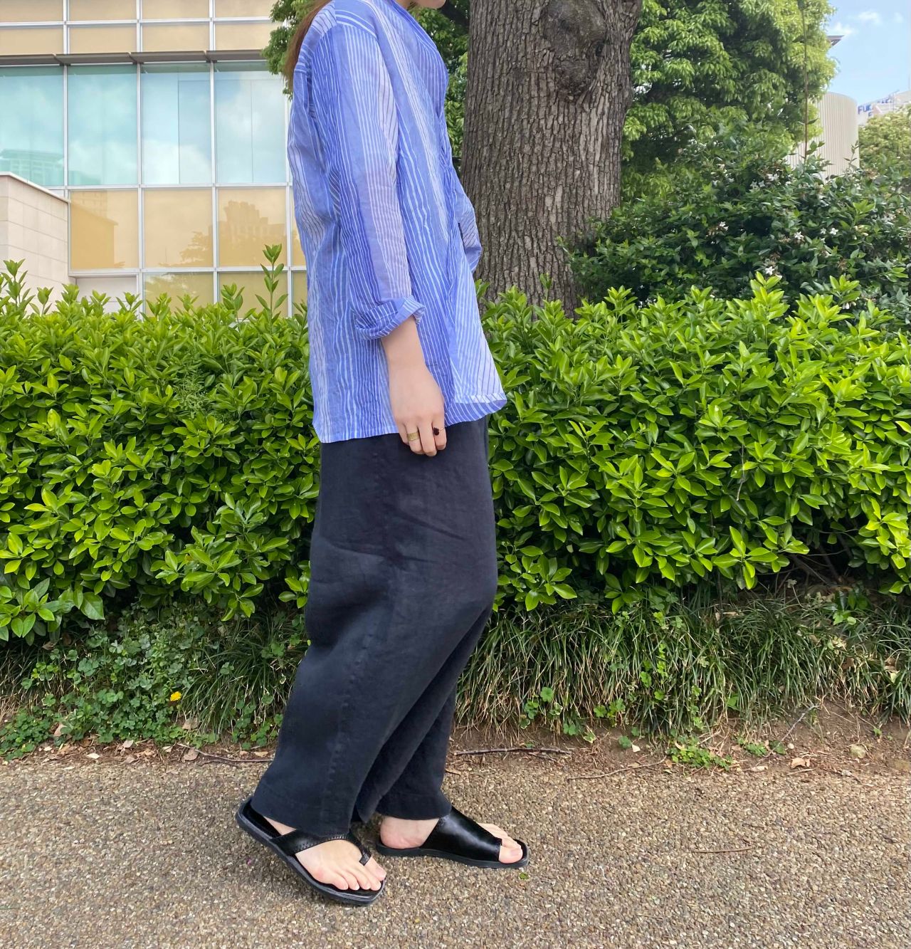 私は肩幅が広いのがコンプレックスなので首が詰まりすぎていない程よい襟ぐりのカットソーと、ブラウスは少し肩を落として抜け感を出すことにより首もとをスッキリとさせ肩幅が気にならないようにしました。