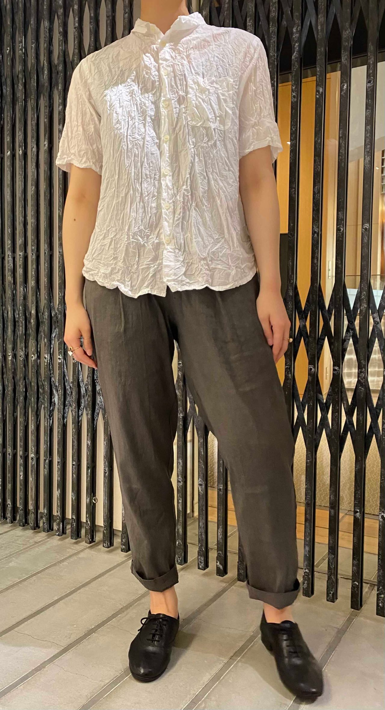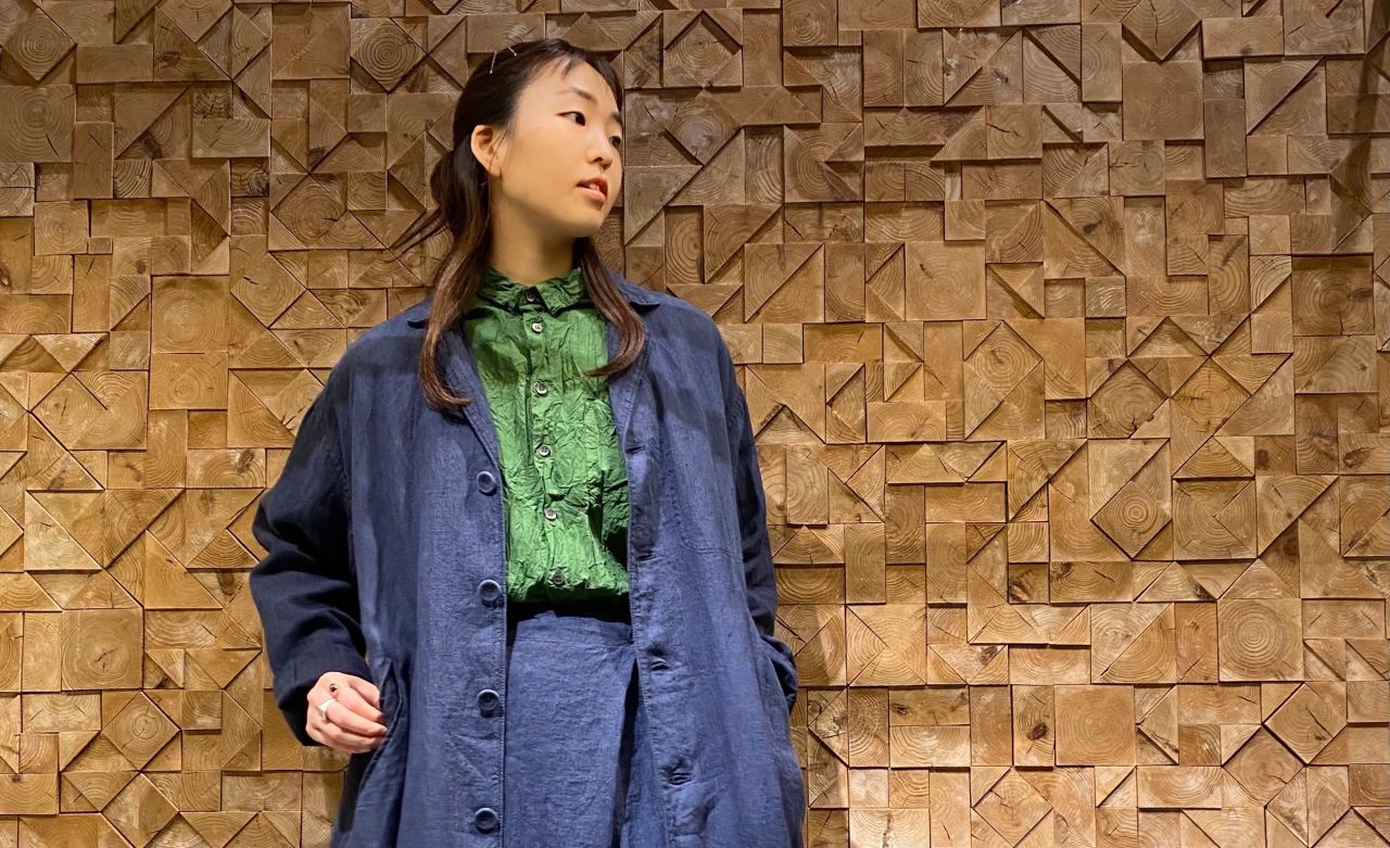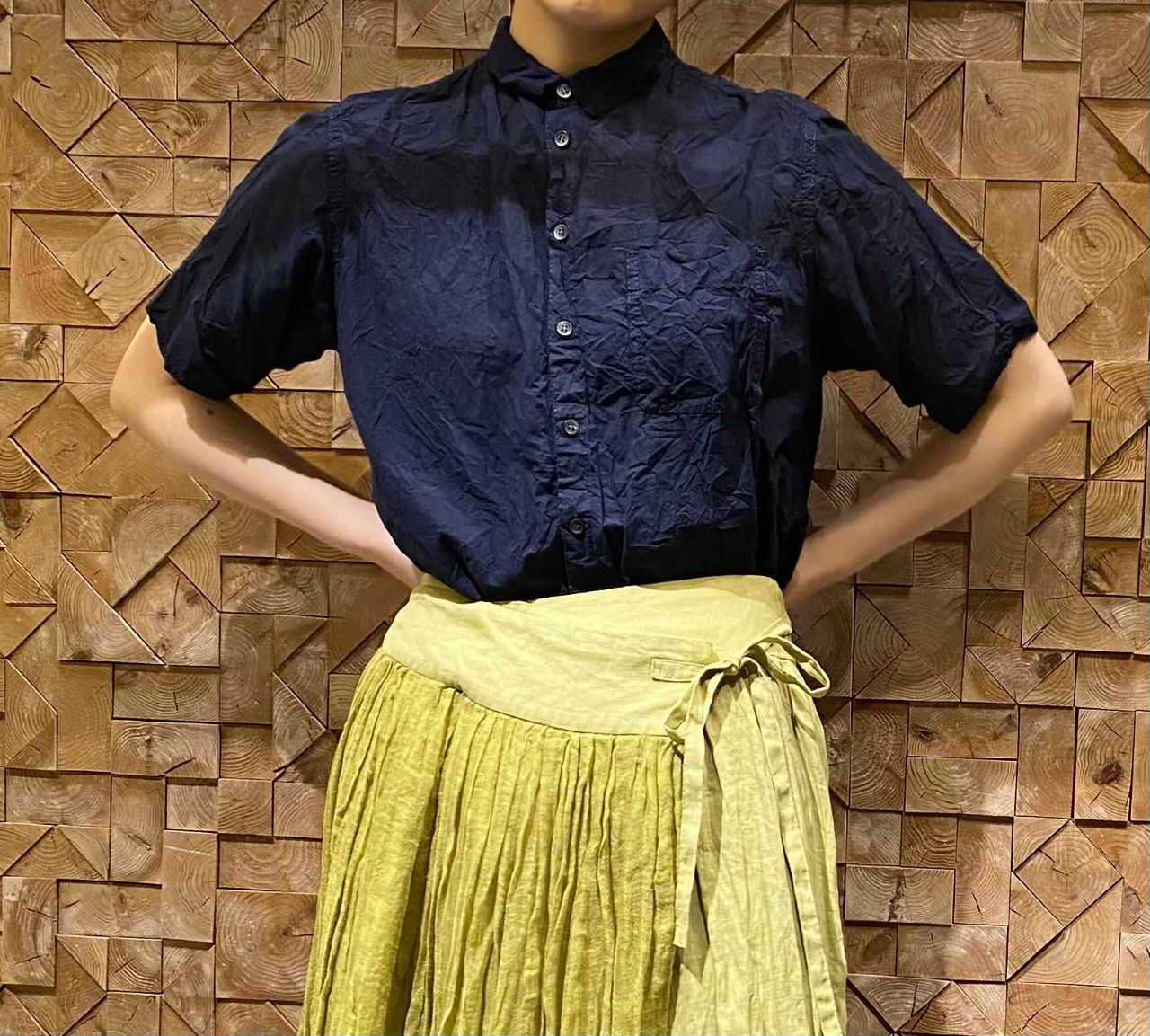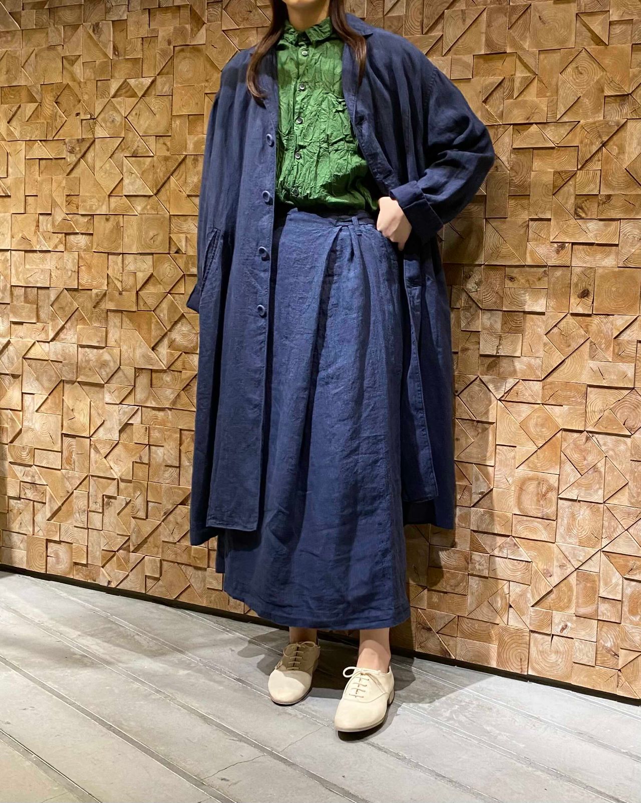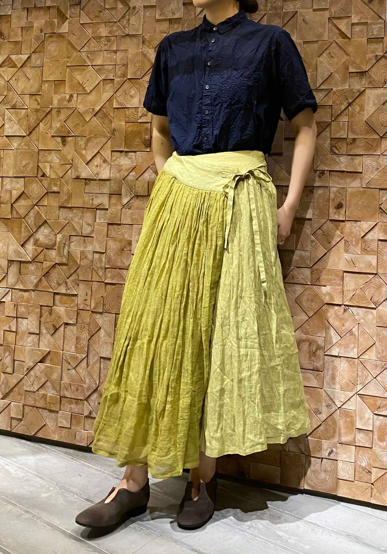 麻のシャリ感が感じられる緑茶染めのスカートと合わせたらいつもと違う少し個性的なコーディネートに。