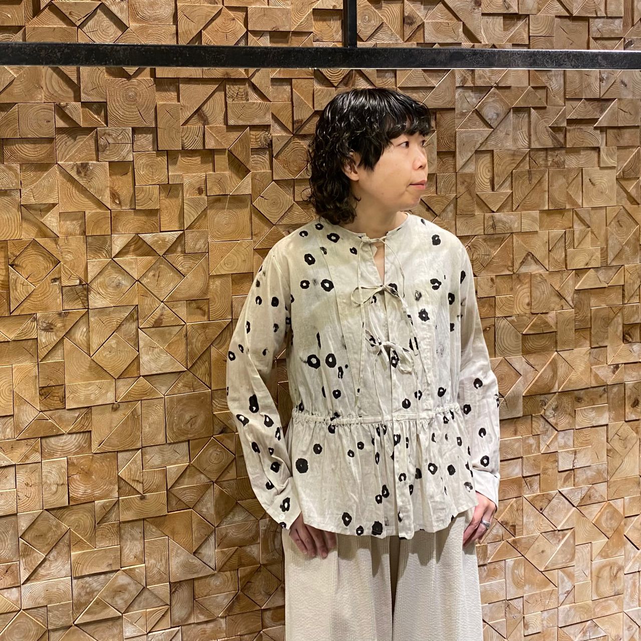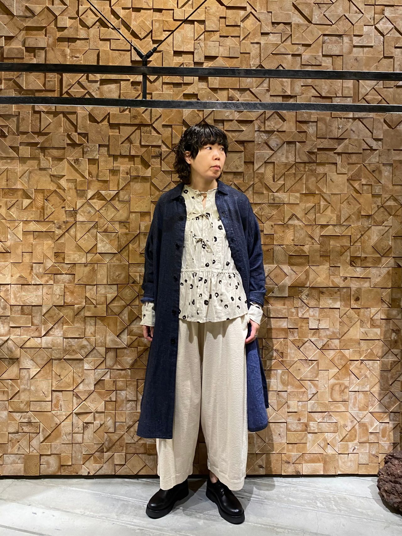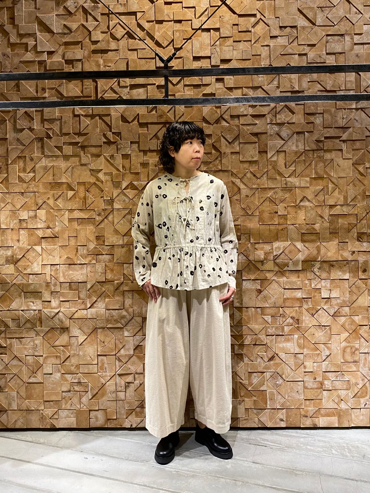 綿麻素材のブラウスに温かみのあるコーデュロイパンツを合わせました。