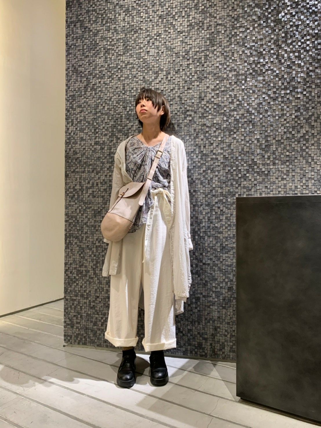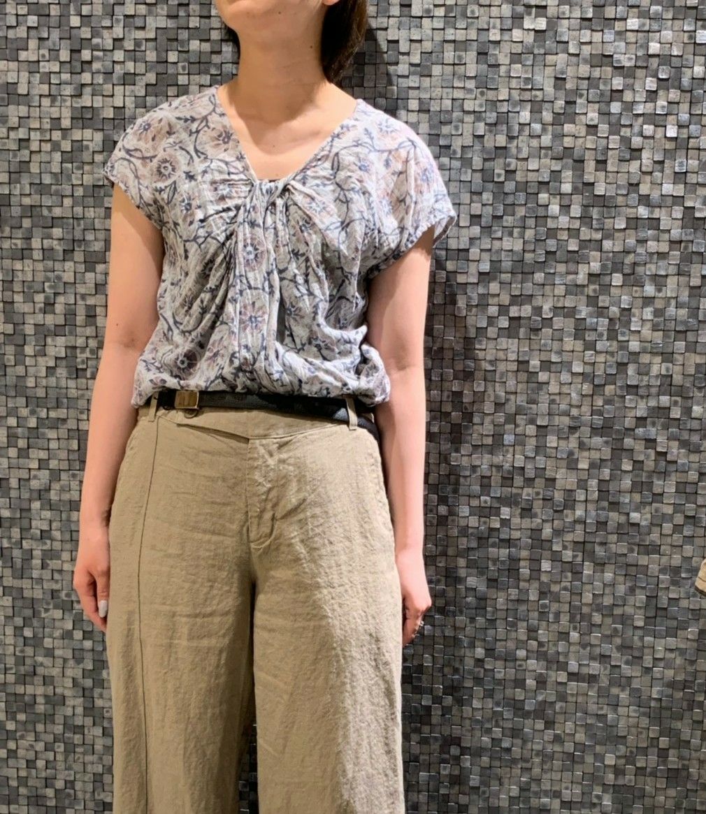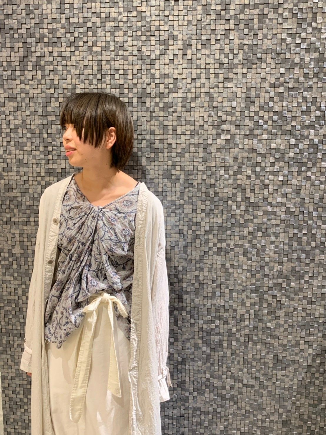 淡い色のブロックプリントのブラウスを淡いトーンでコーディネートし統一感を出します。