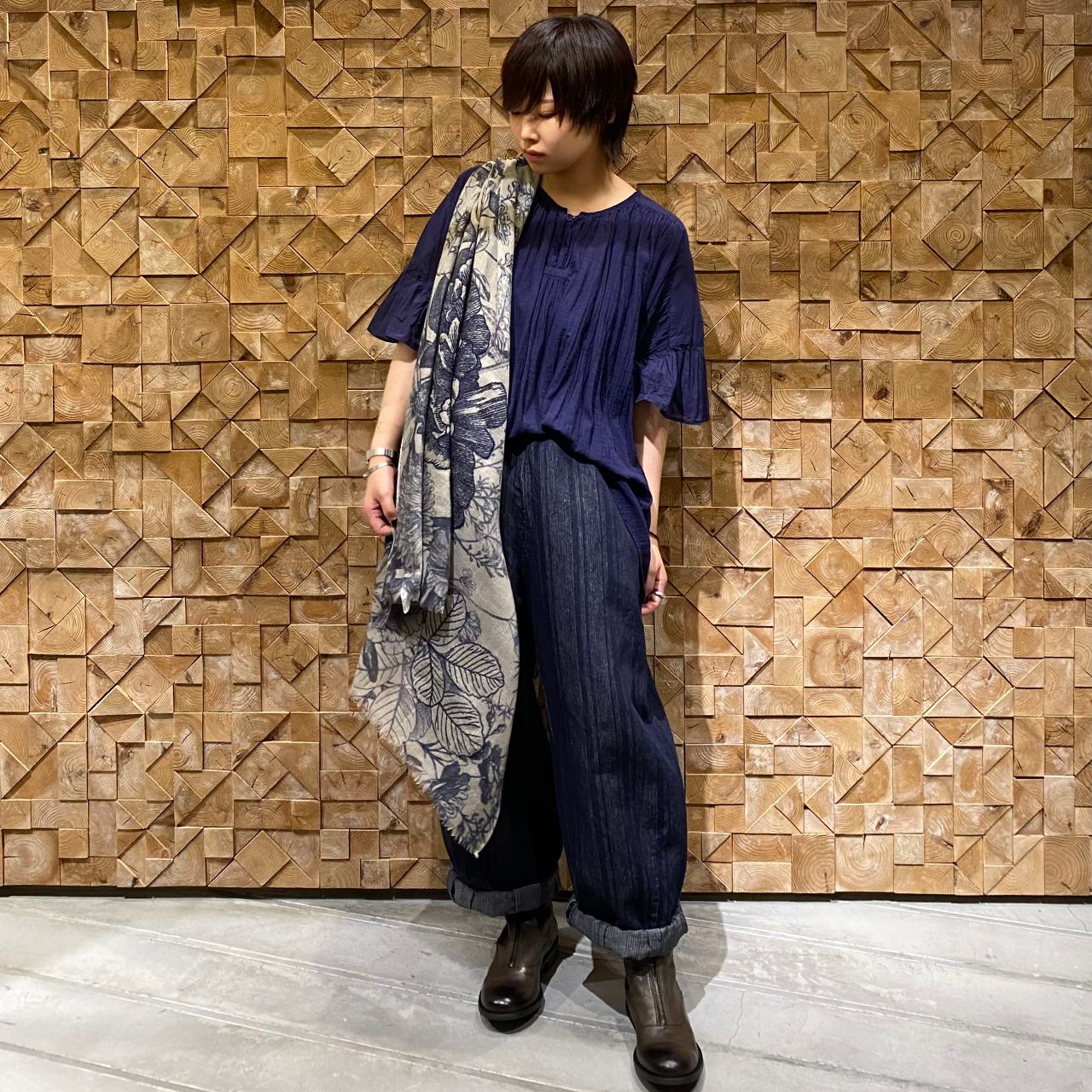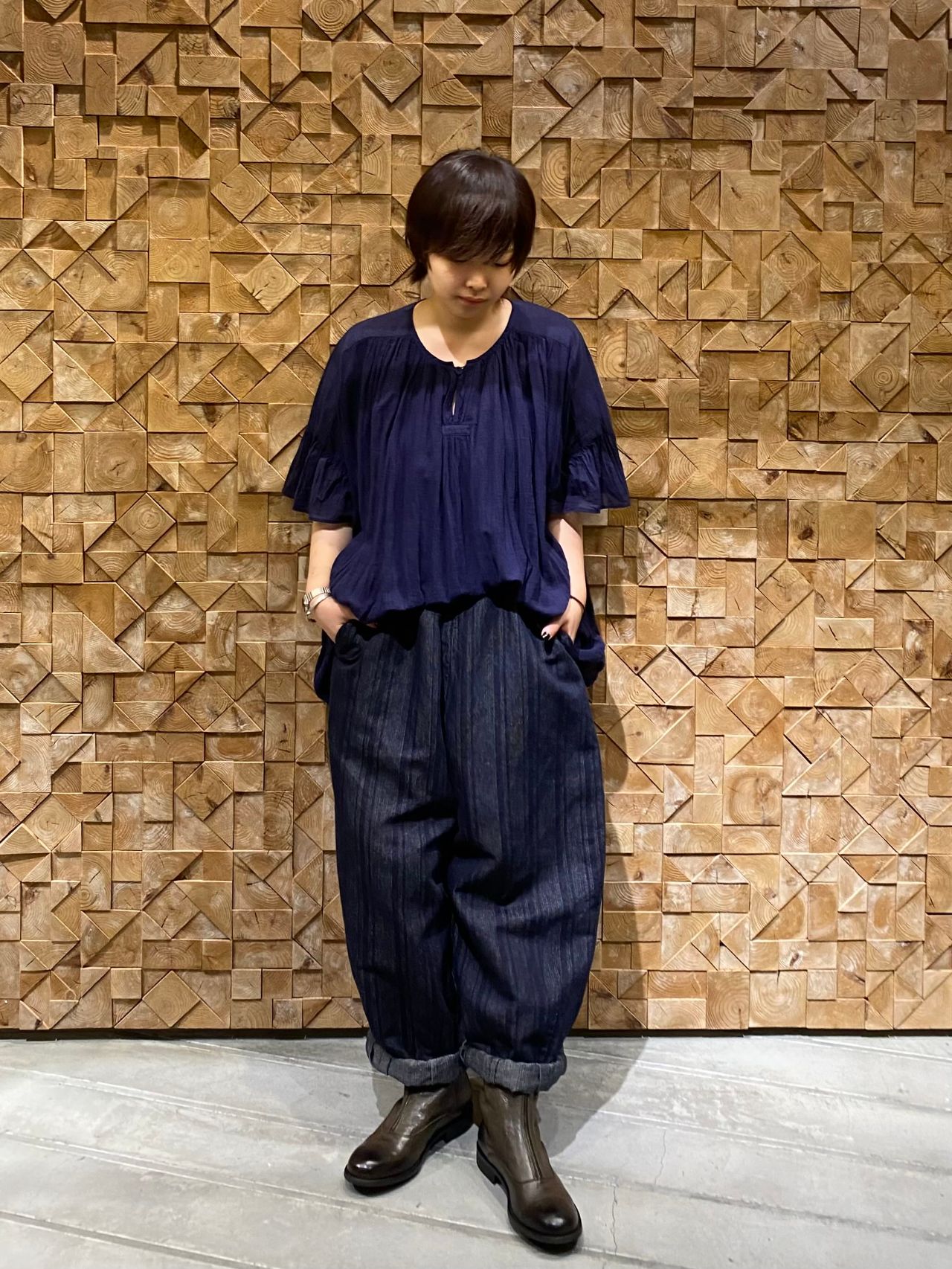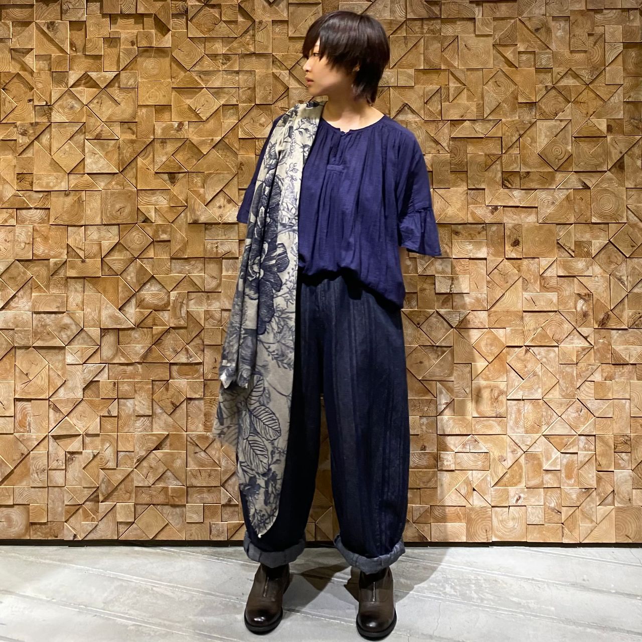 古代より高貴な存在とされた鉱石・アズライトで染めたのネイビーカラーのブラウスとインディゴ染めのデニム風パンツを合わせました。