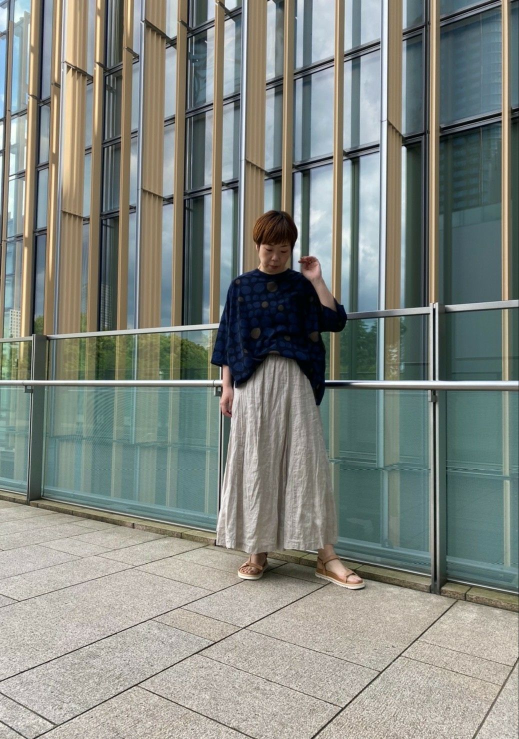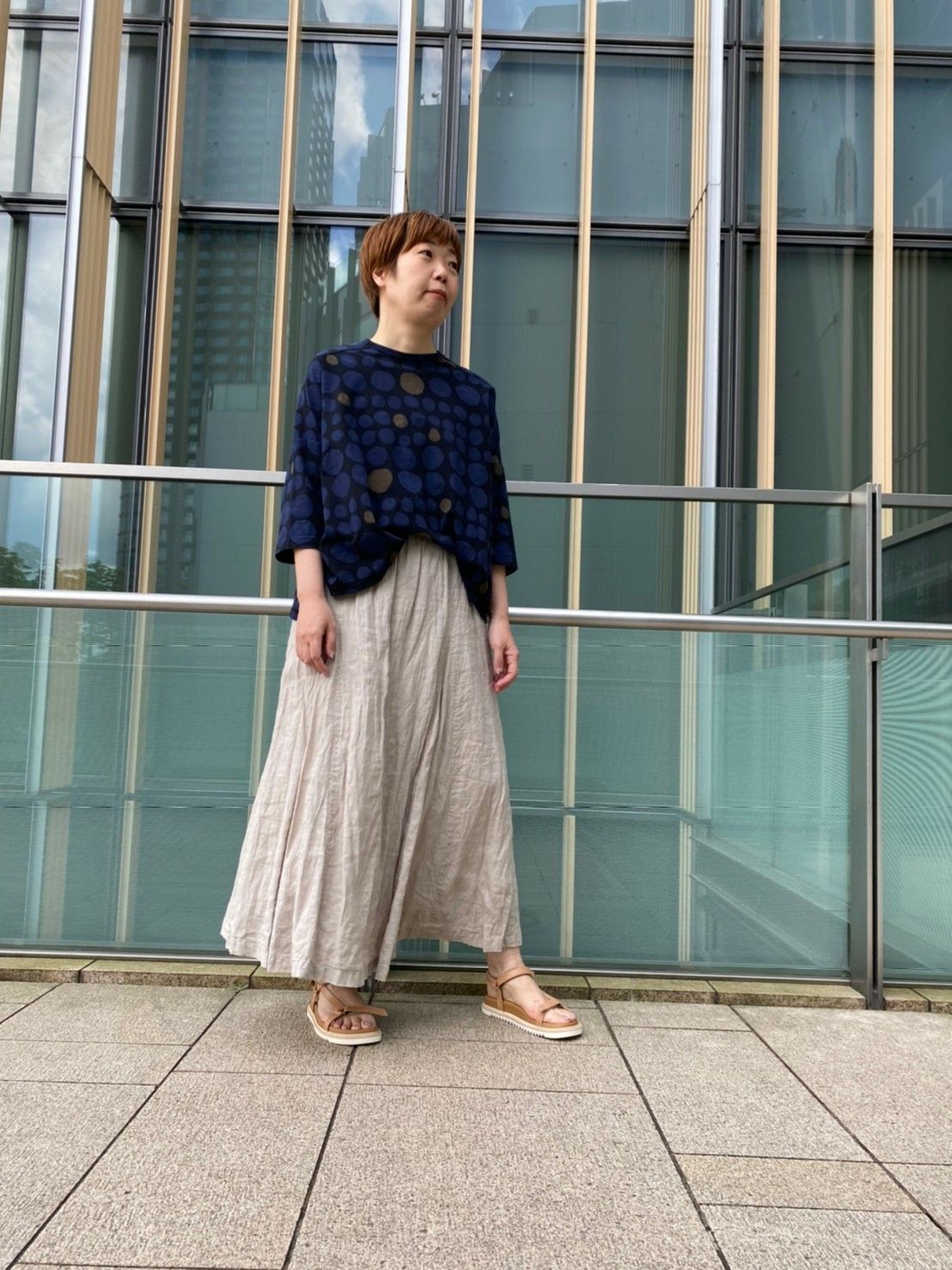 足下に何を合わせるか考えるのも楽しいですね。これからならサンダルもいいですし、カジュアルに着たい時やお散歩などにはスニーカー合わせもオススメです。