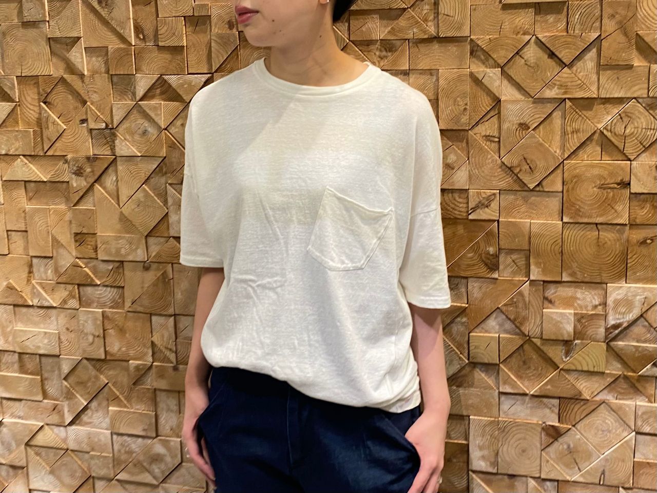 プレーンな胸ポケット付きドロップスリーブTシャツ。