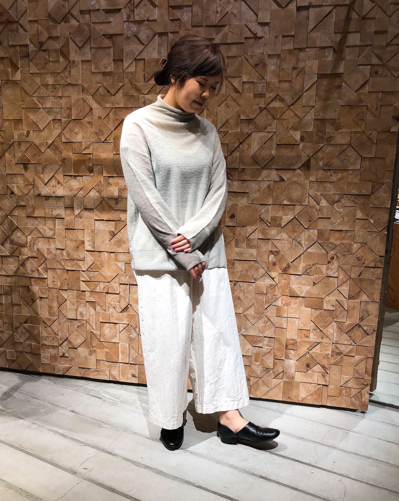 ワントーンの優しい色合いで統一感のあるコーディネートに。