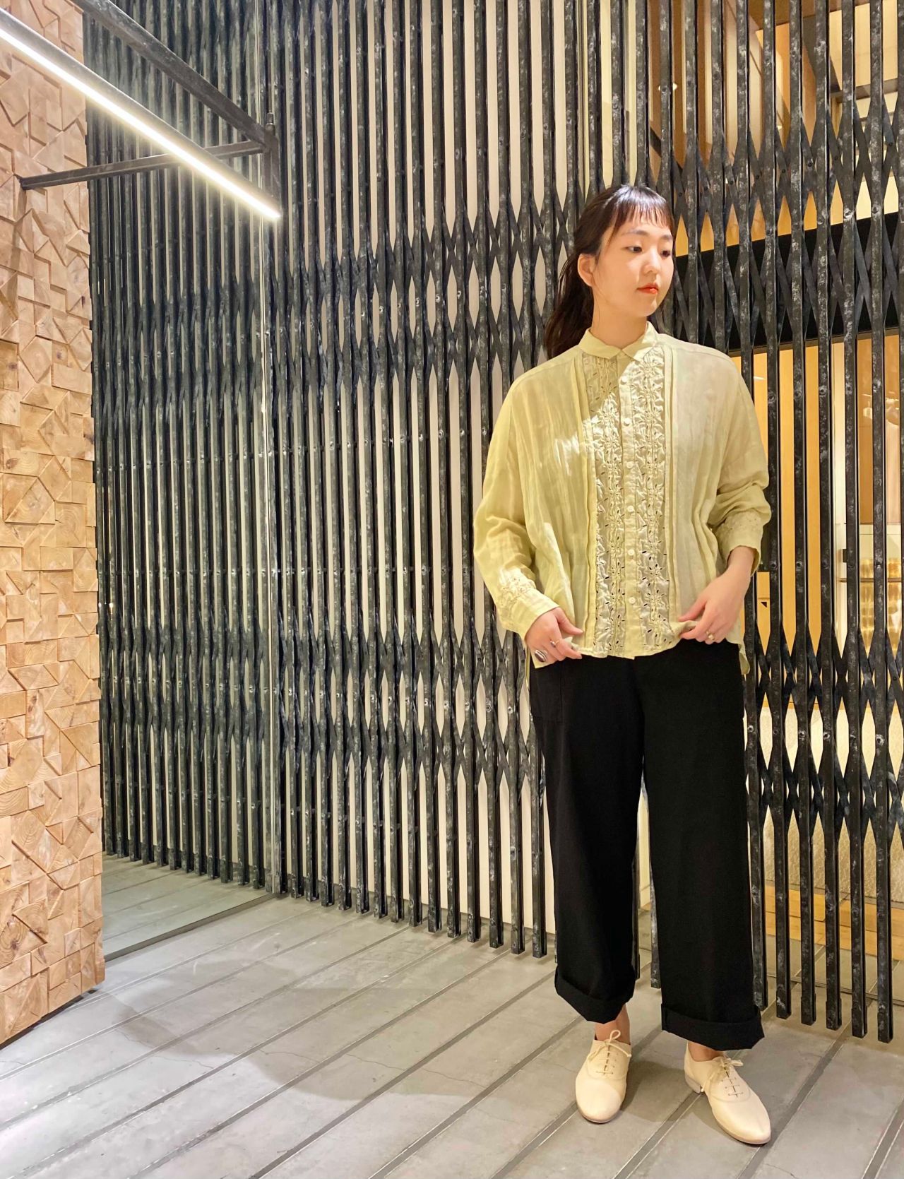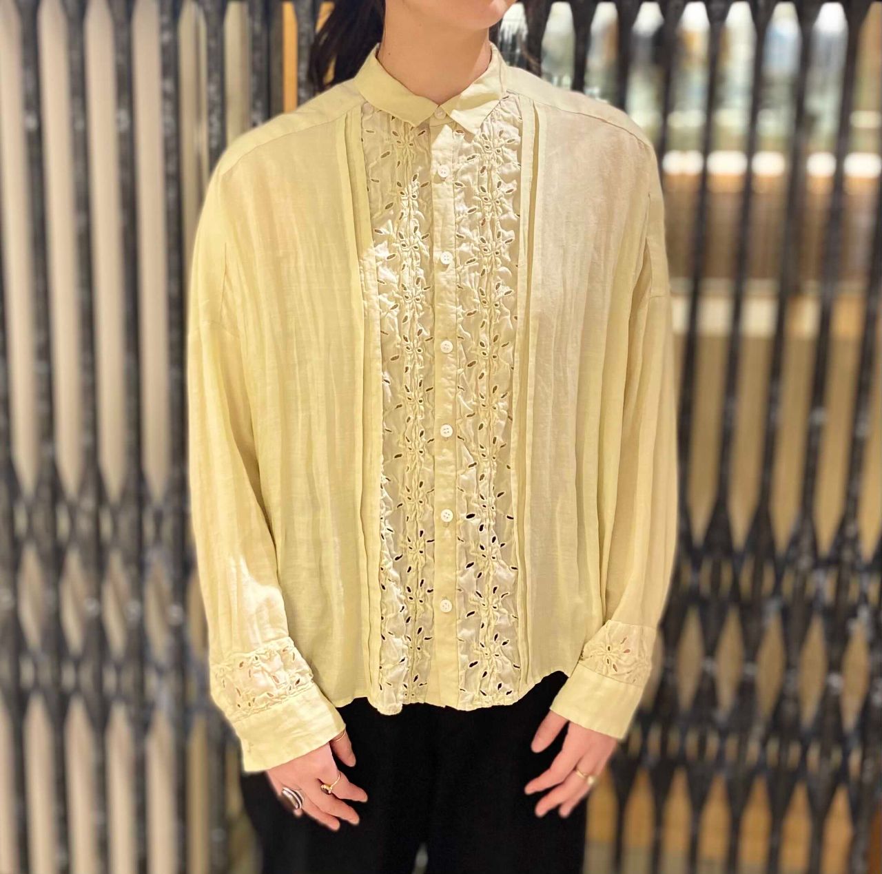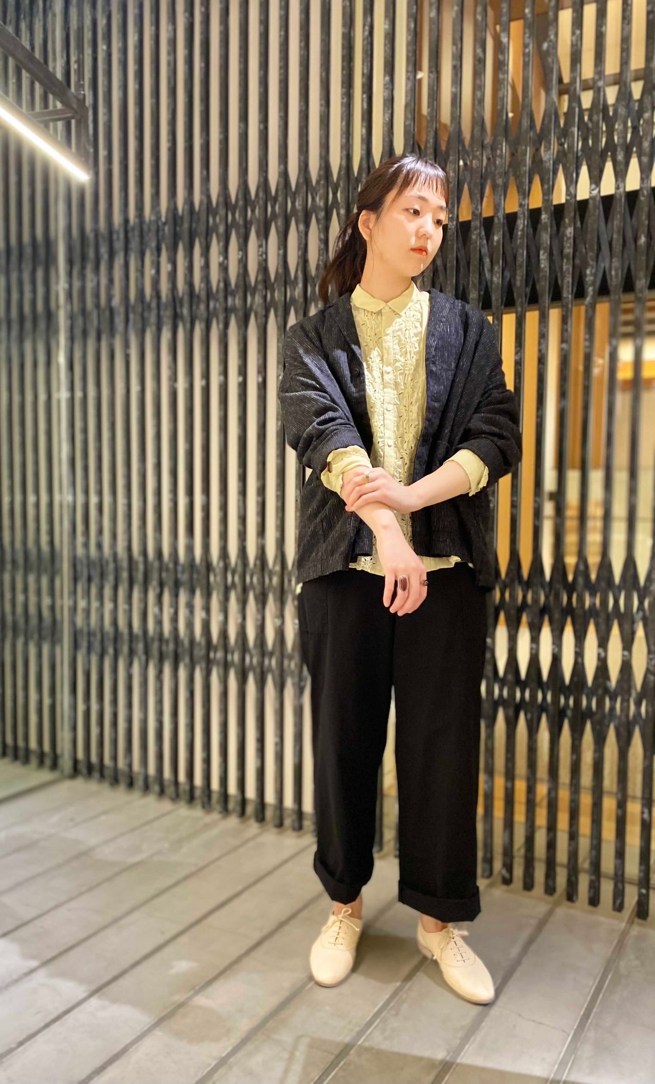 合わせたブラウスの黄色と黒の色味で大人かっこいい着こなしに。