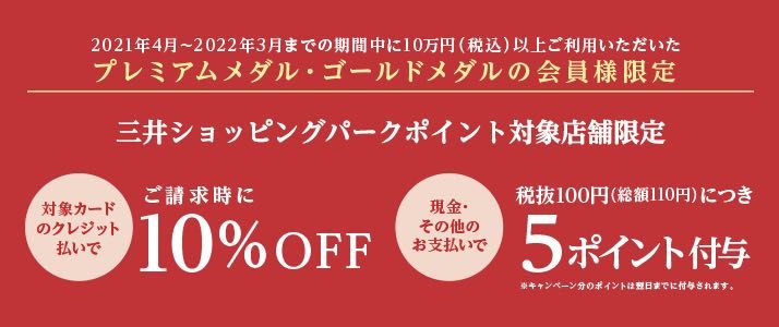 東京ミッドタウンの三井ショッピングパークポイント対象店舗で期間中に対象のカードをご利用いただくとお支払方法により、ご請求時に10%OFFもしくは税抜100円につき5ポイントが付与されます。