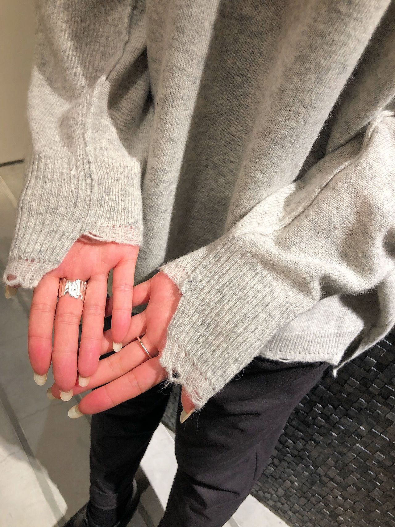 リブ部分にはわざとほつれた様な柄編みを表現。