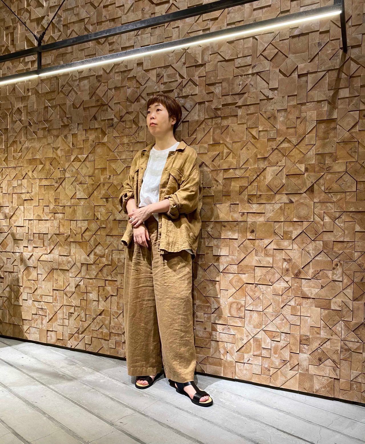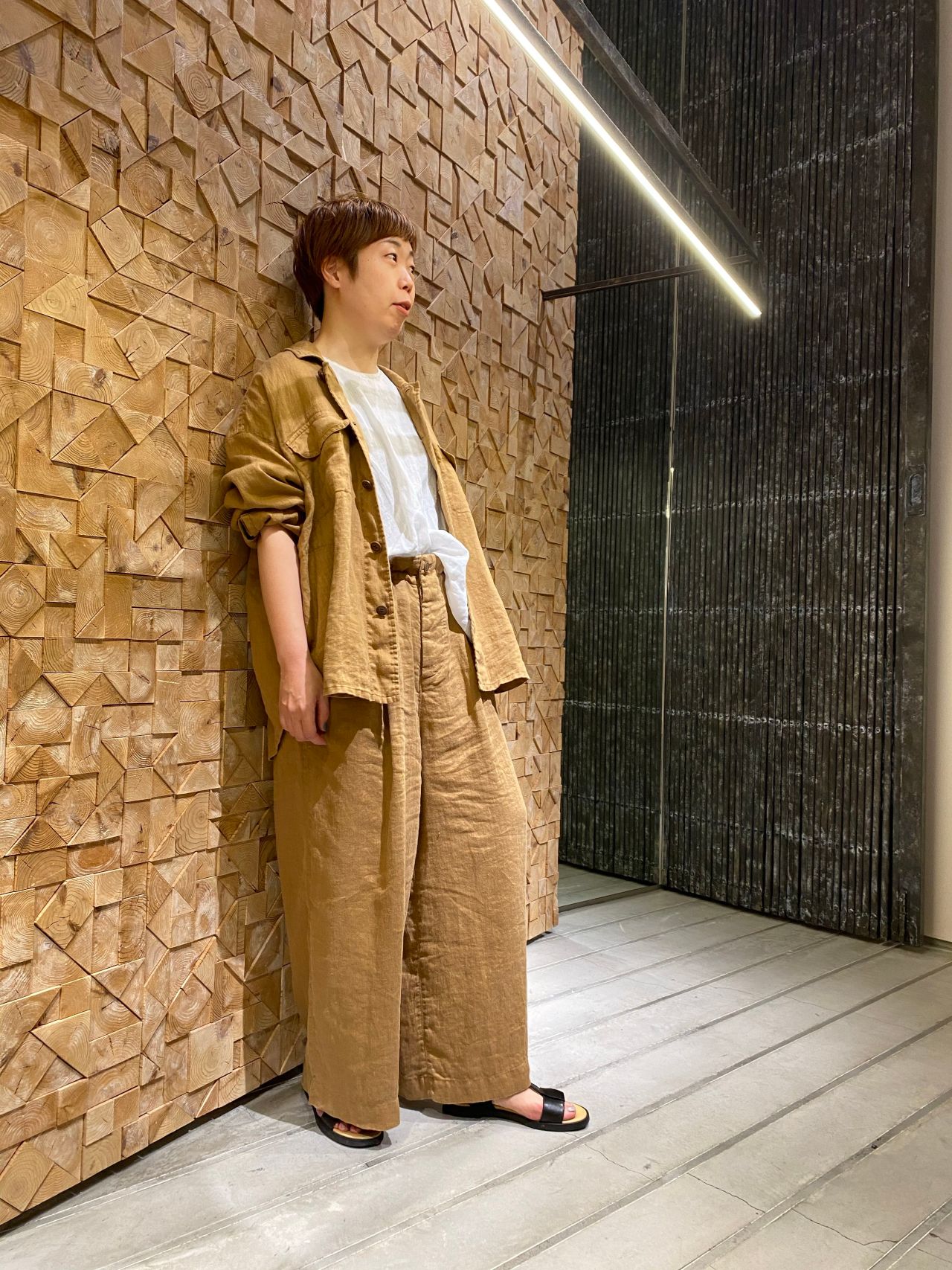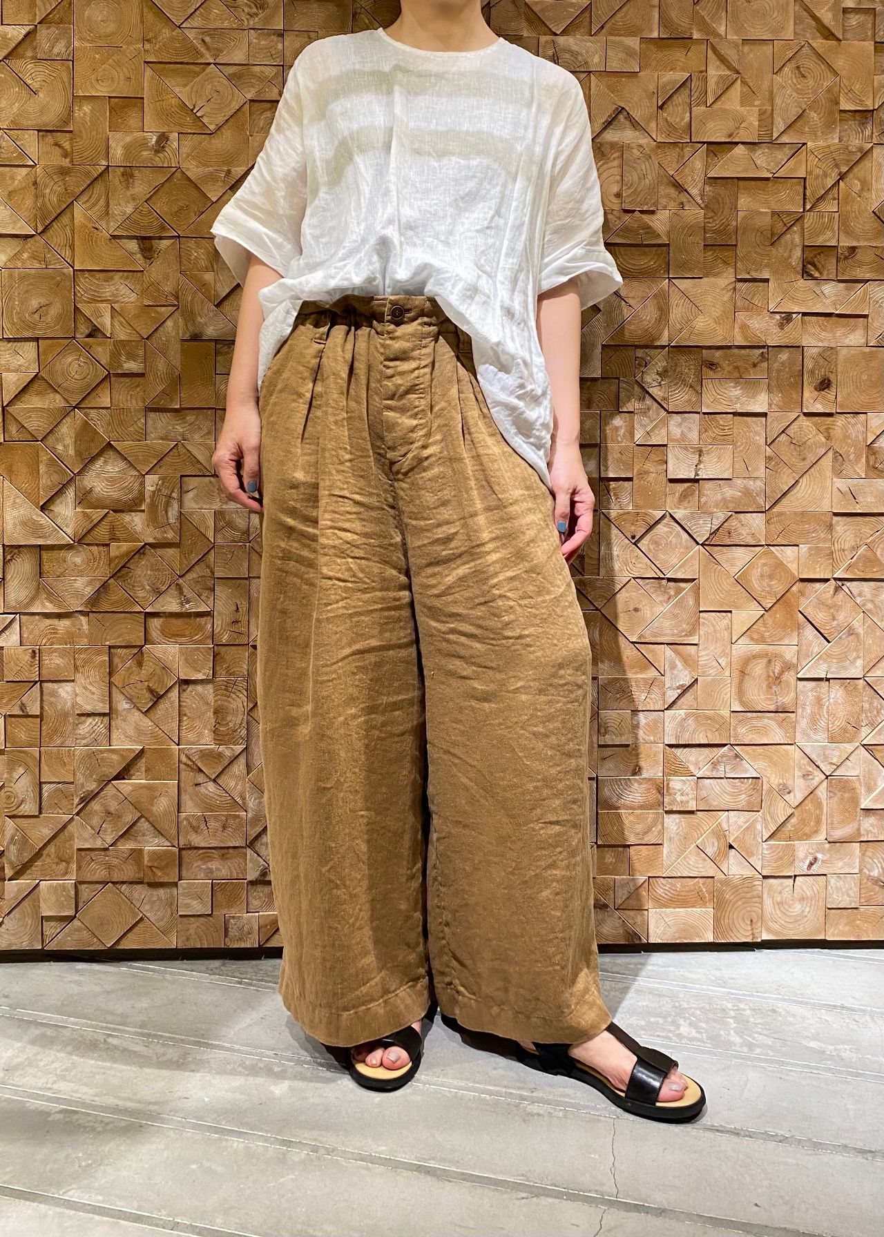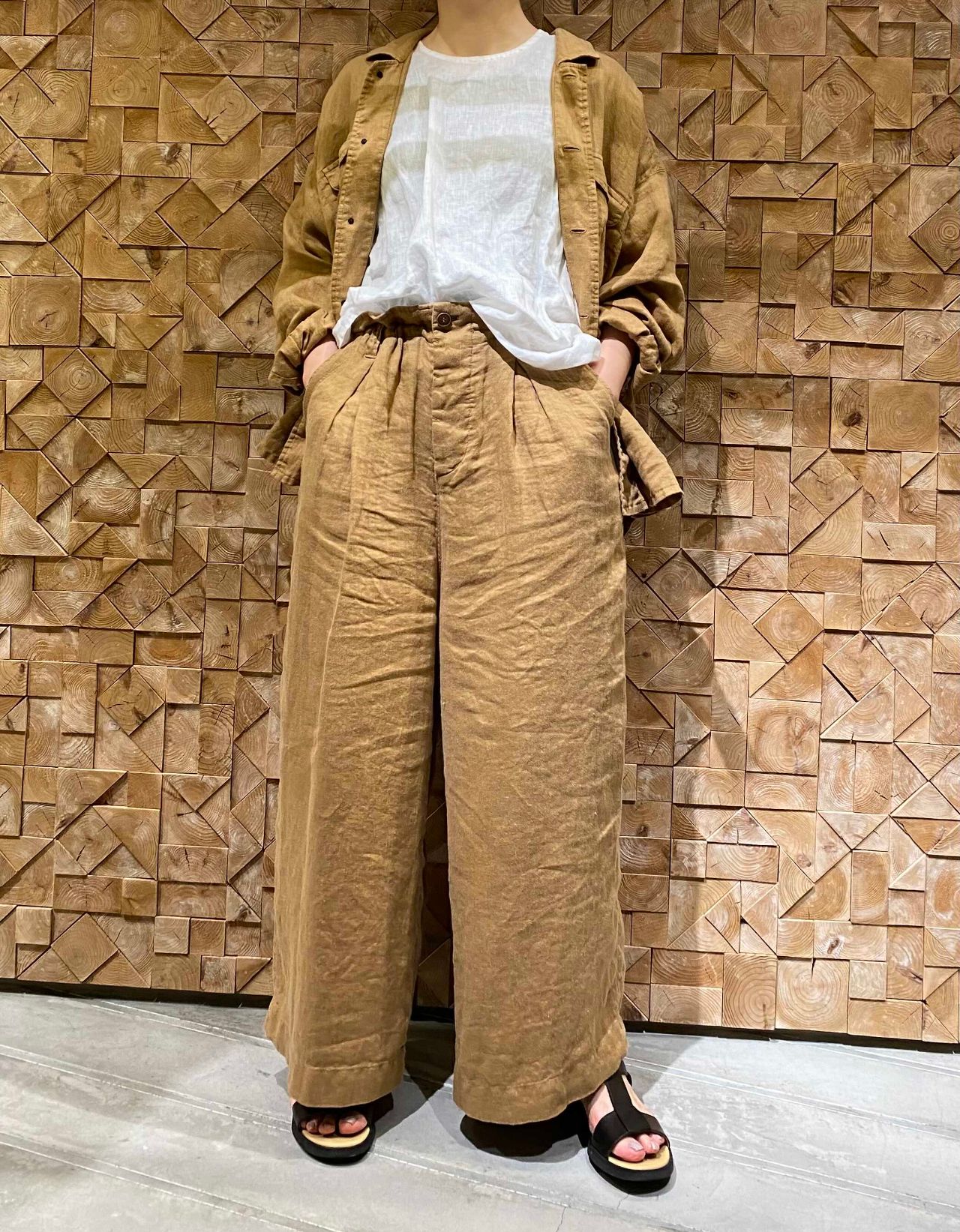 ウエスト部分の紐で好きな太さに調節できて、くしゅっとしたシルエットが目を引くパンツはセットアップで着ることでとても素敵な雰囲気がでます。
