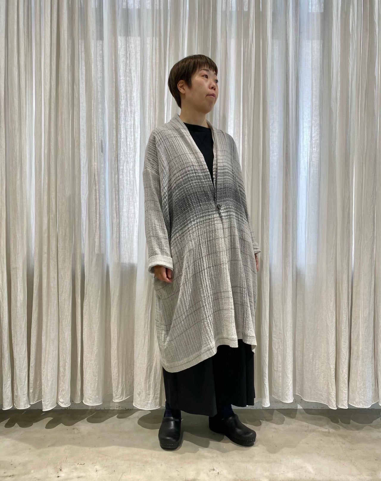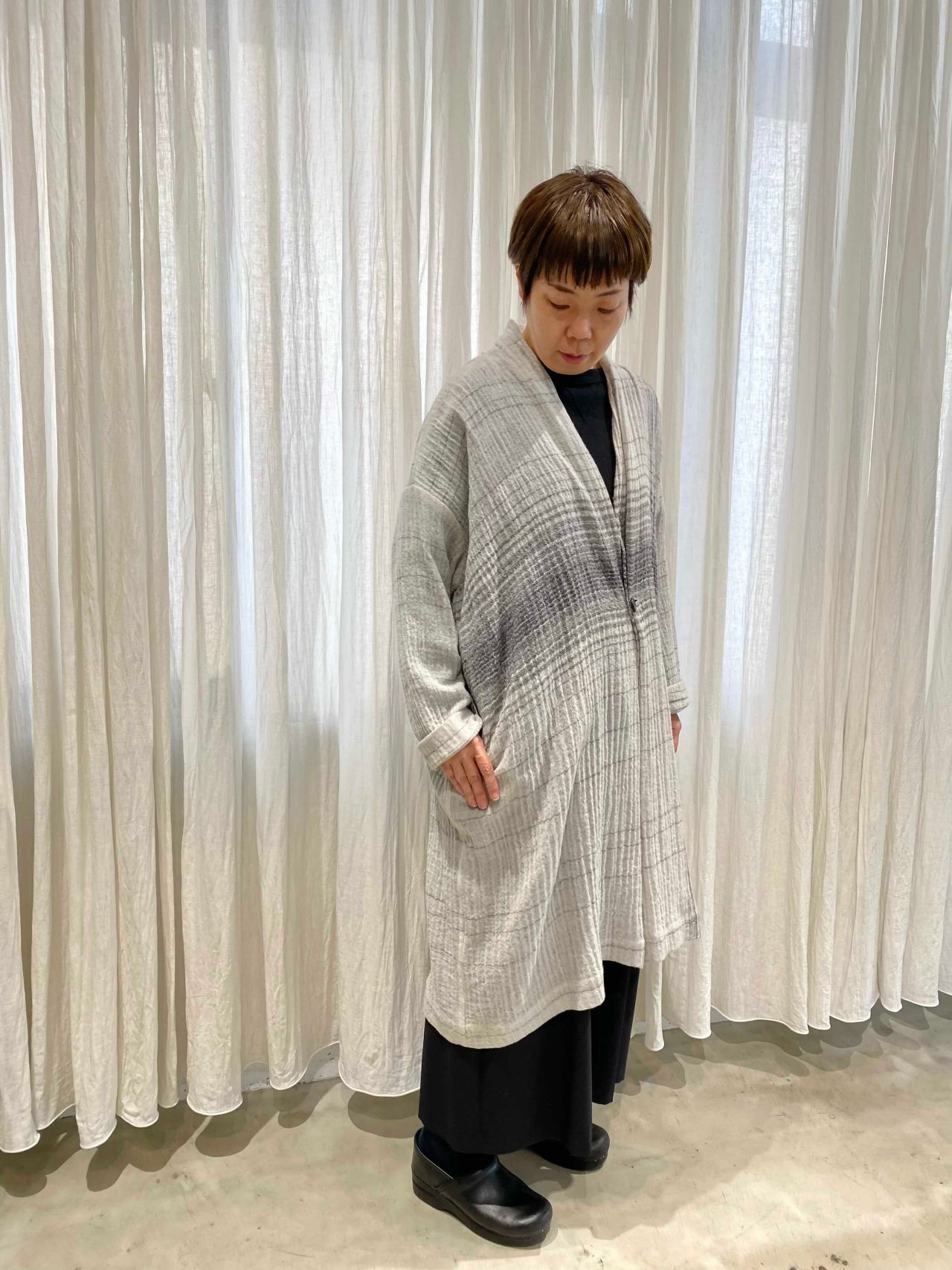 ふんわりと柔らかくガウンのように羽織れるコートはとても軽く着ていて気持ちの良いアイテム。色合いや柄が品のある雰囲気を演出してくれます。