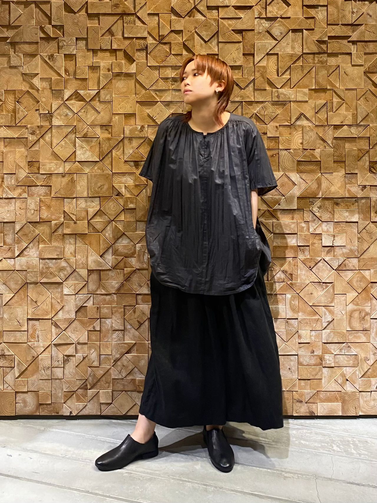 たっぷり生地を使ったブラウスでも、細身のパンツにフロントタックインでスッキリ見せができます。