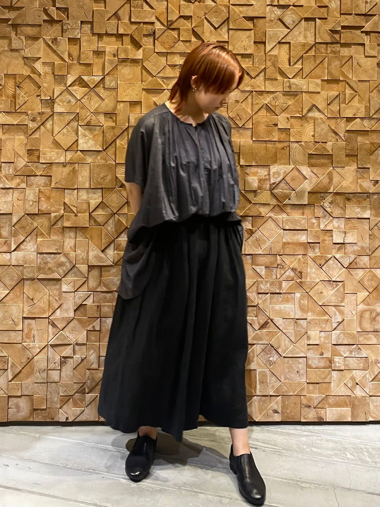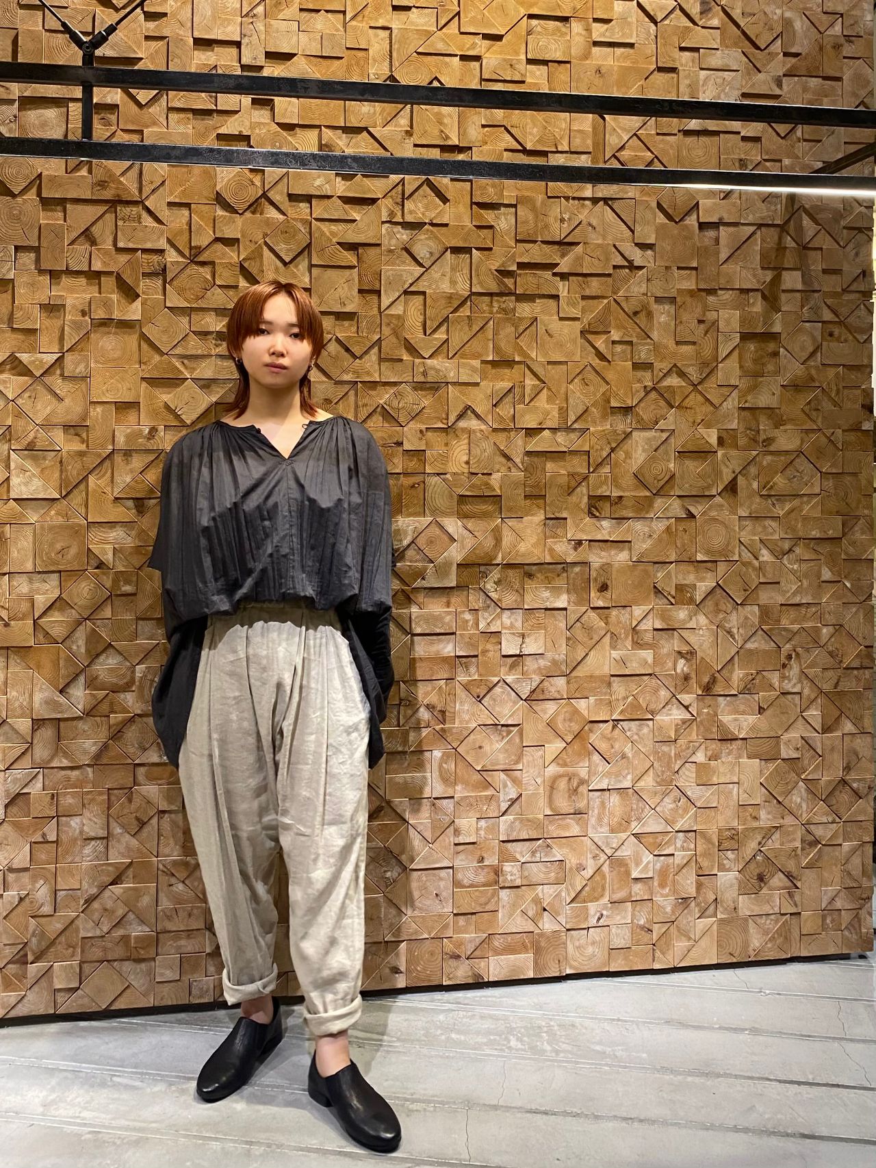 麻素材のワイドパンツと合わせリラックスシルエットに。