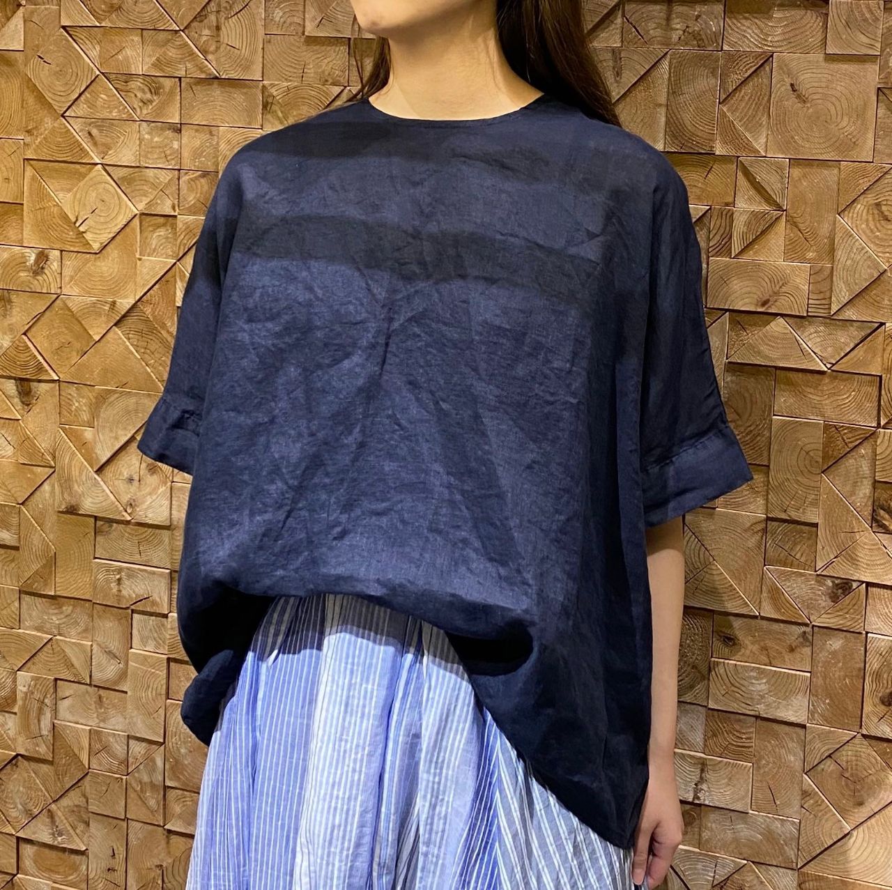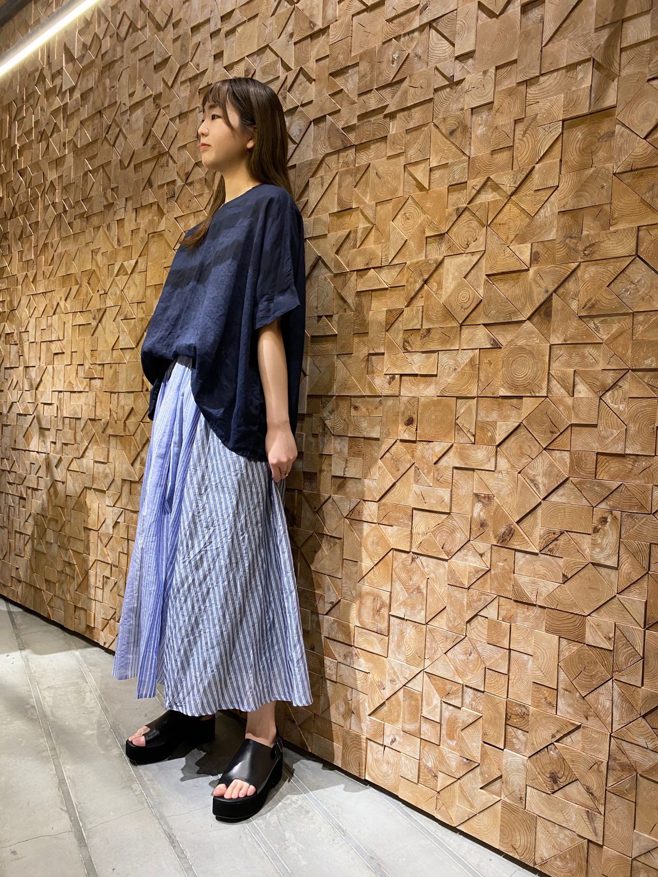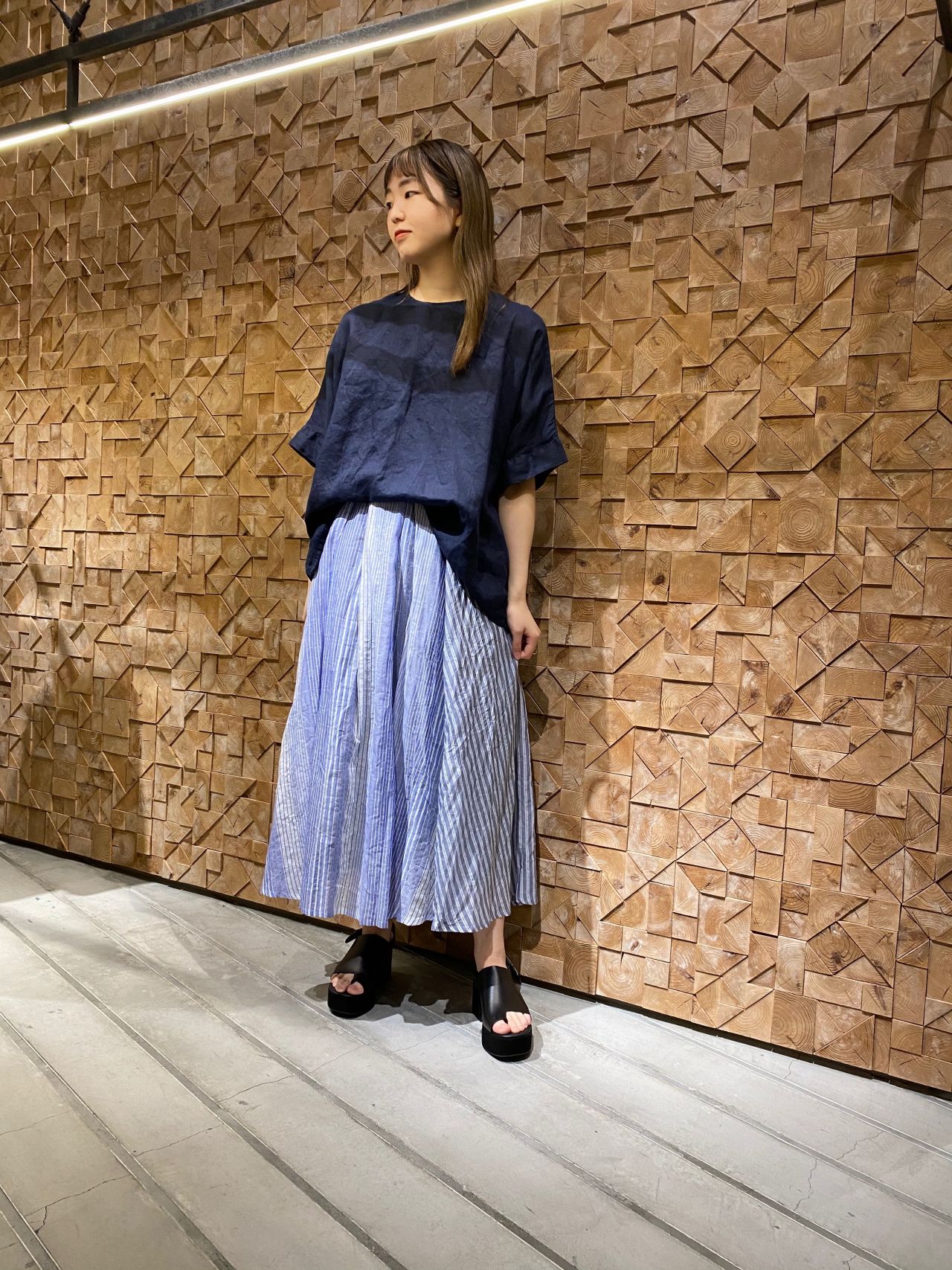 Tシャツ感覚で着れる麻のネイビーのブラウスと合わせるとスカートが映えて、爽やかな大人の女性をイメージしました。