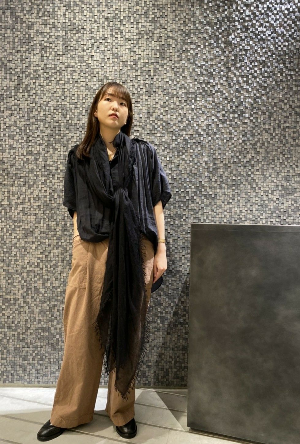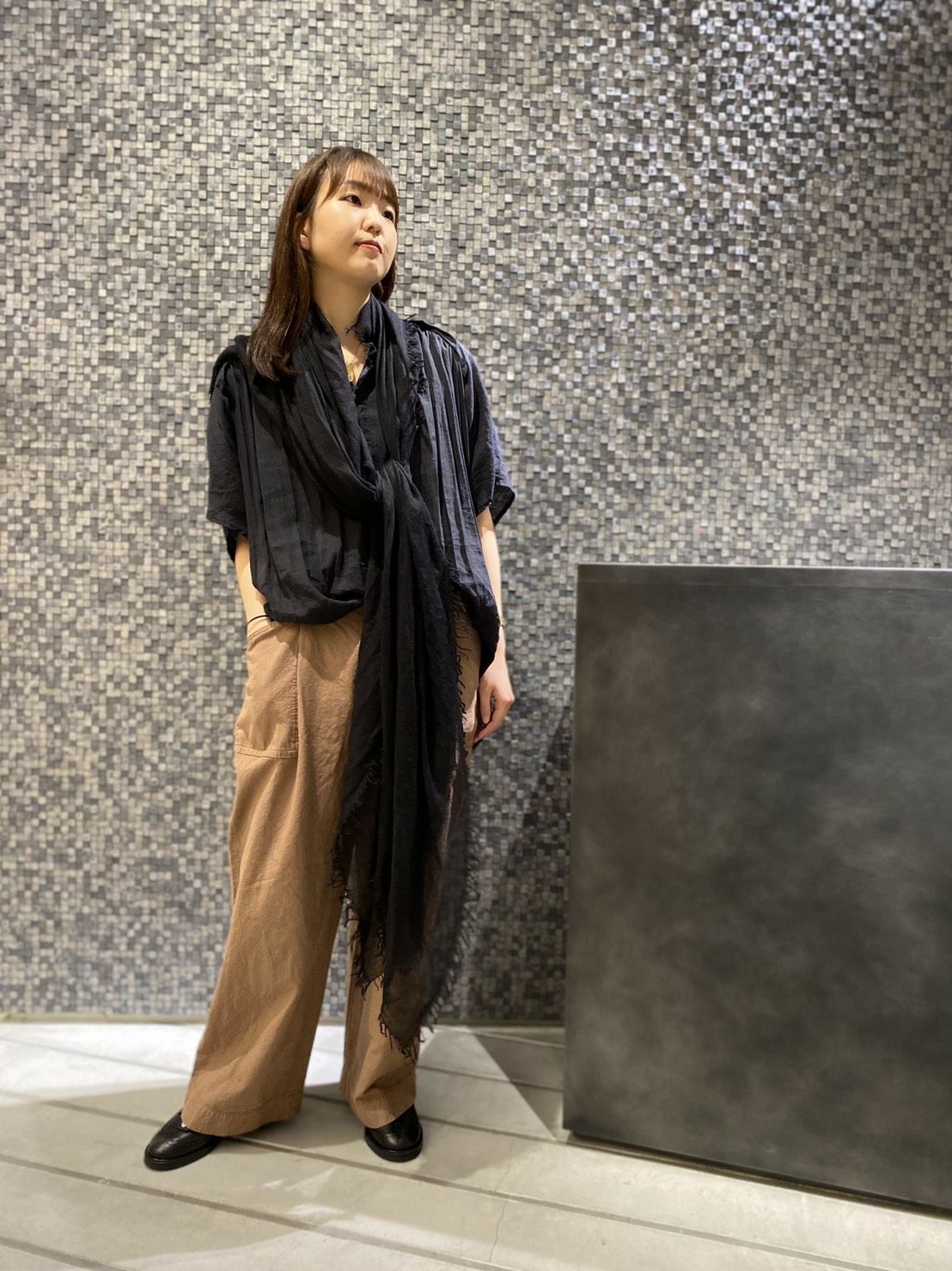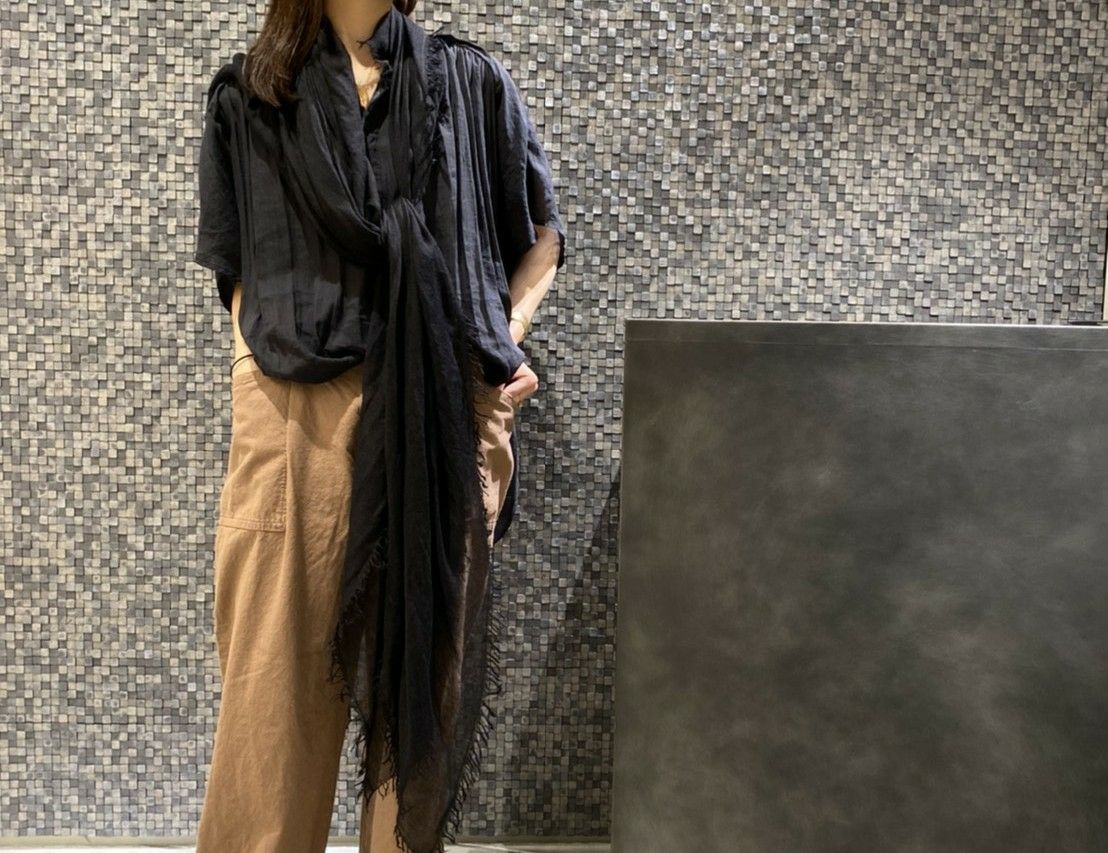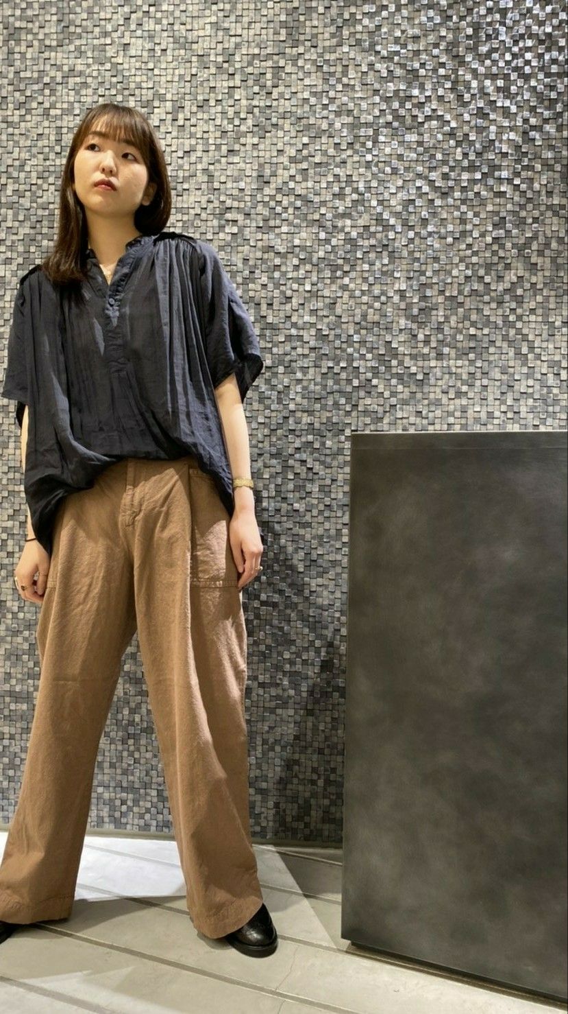 ブラックシリカという天然の石を使って染め上げたブラウスを合わせる事で、芯のある力強いコーディネートに。