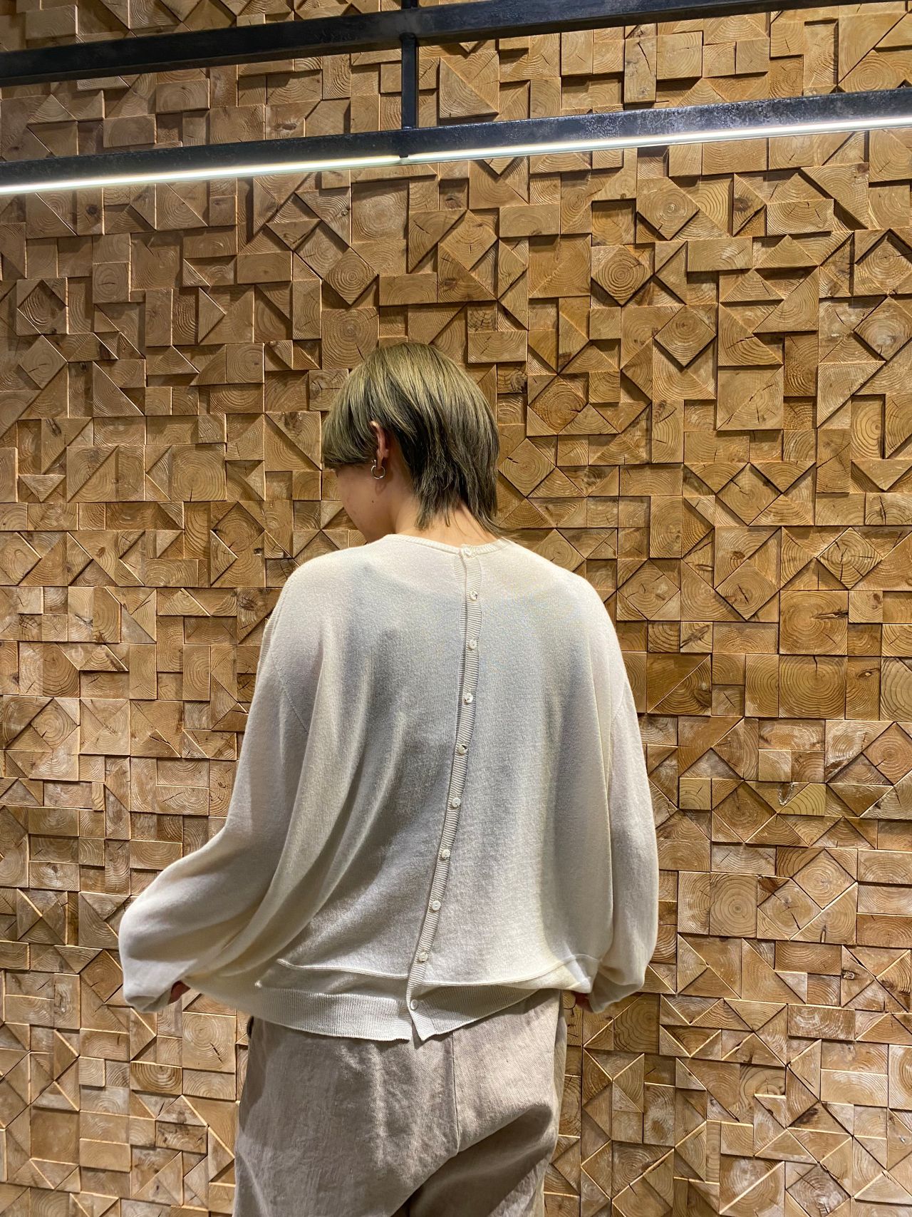 カーディガンの前開き部分を背中側にして、クルーネックプルオーバー風に着用していただけます。