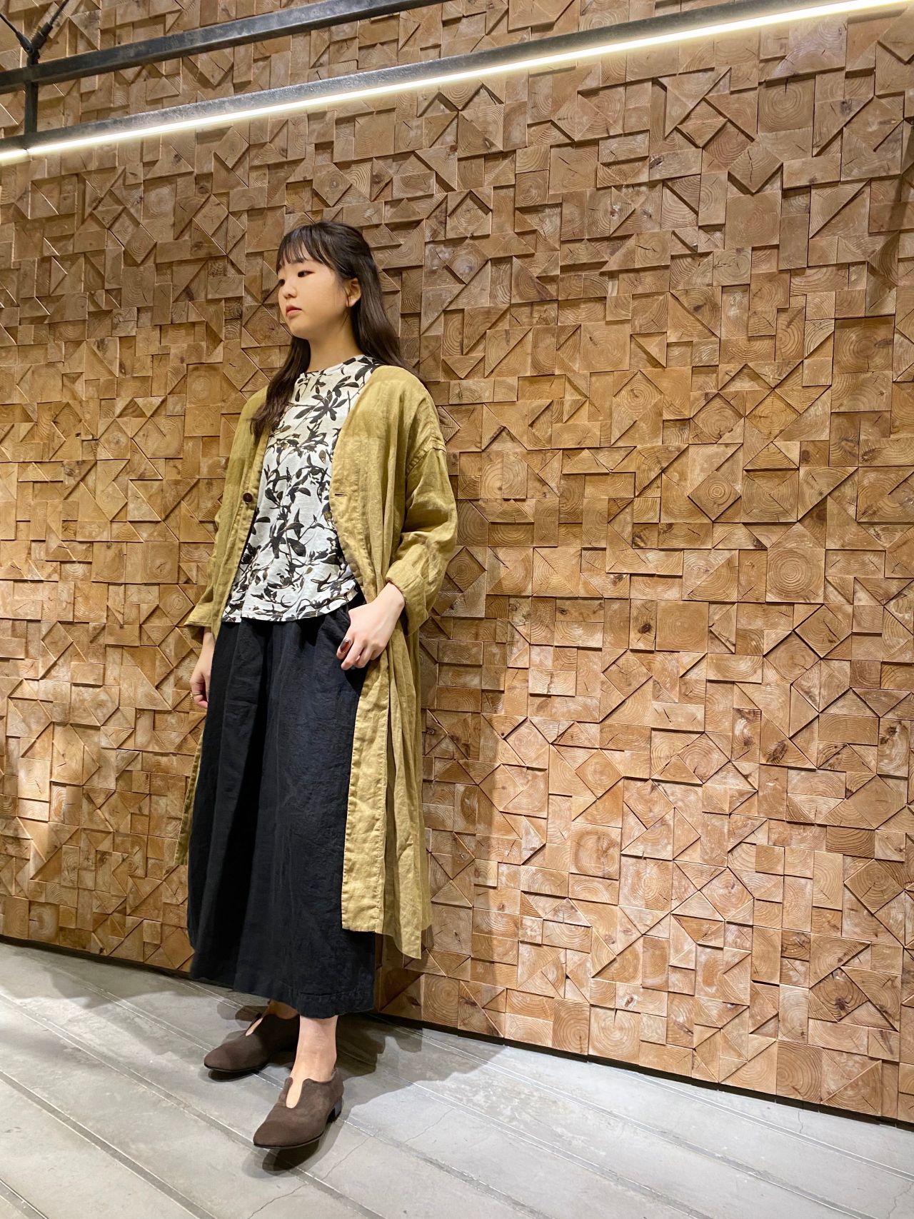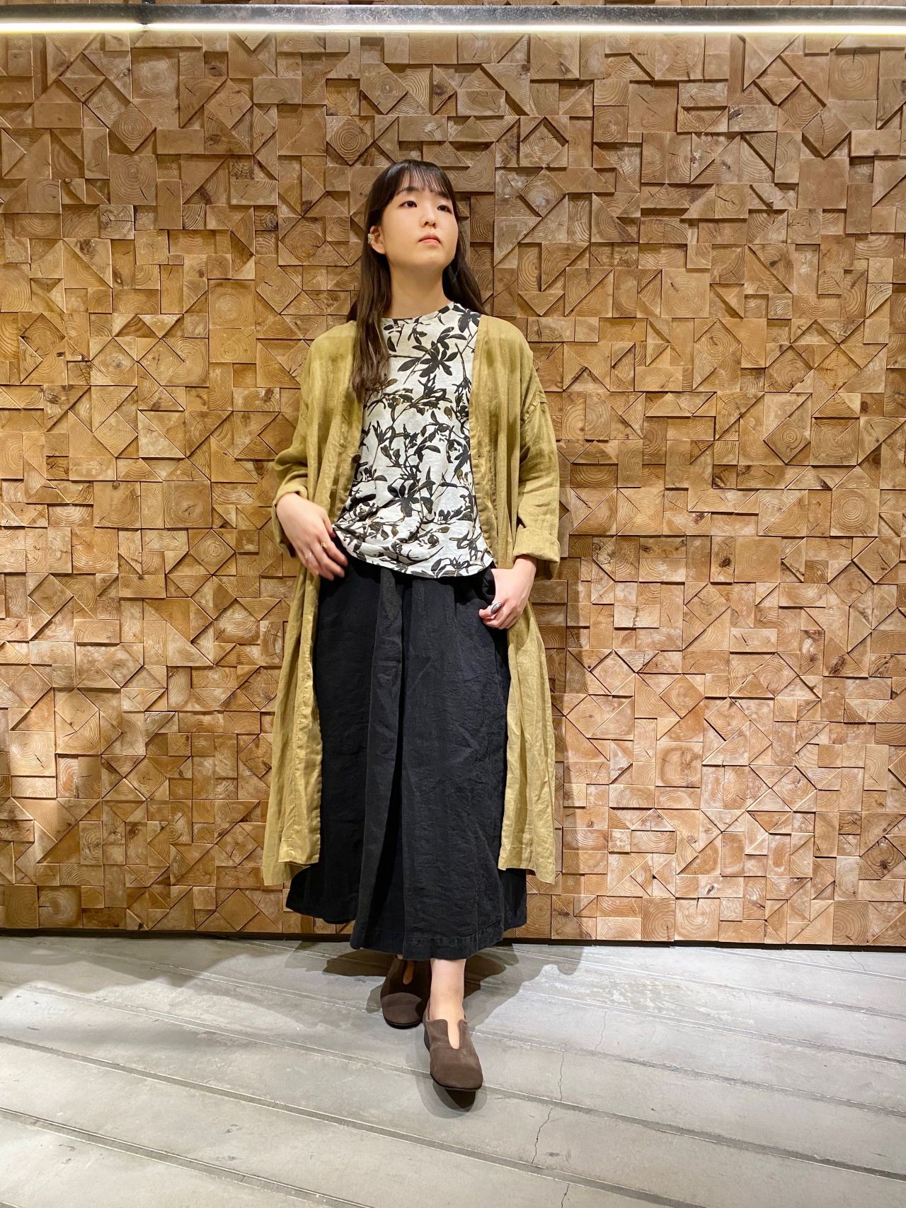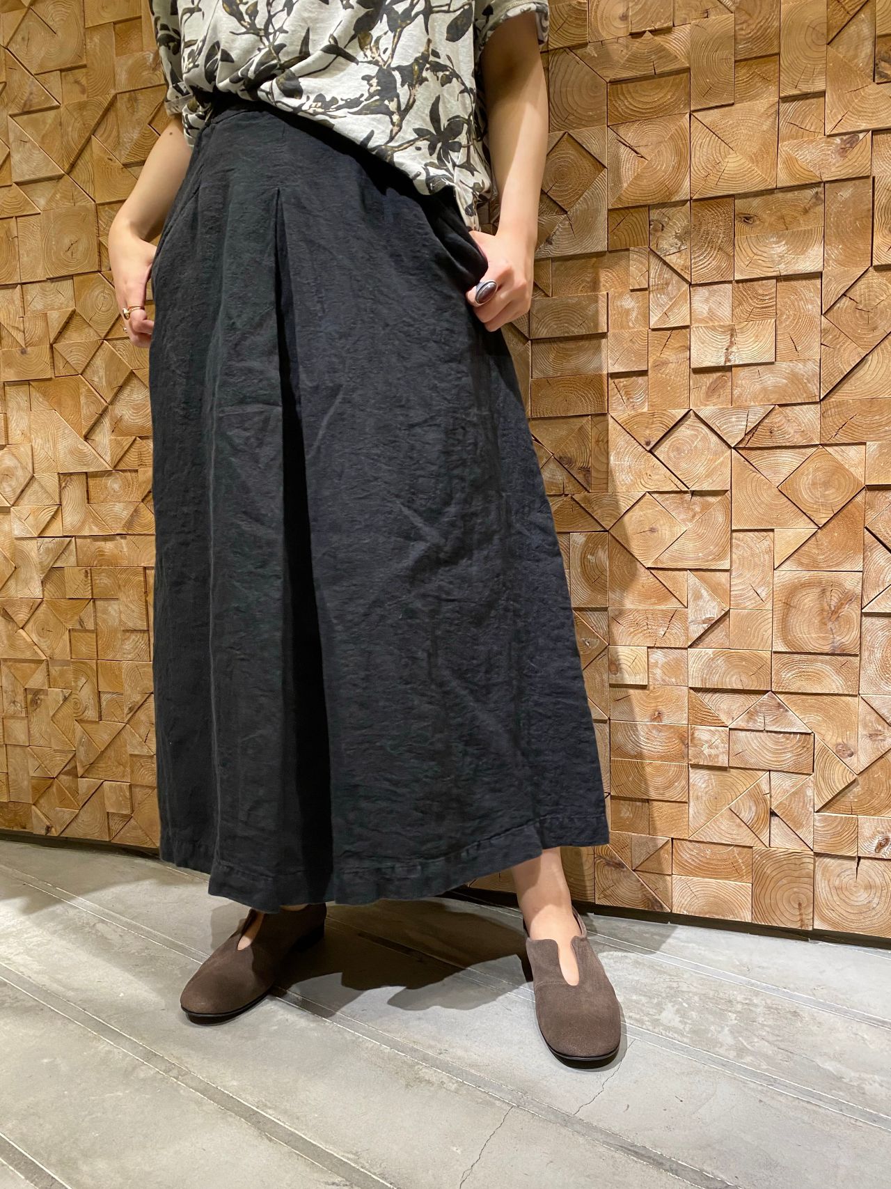 センターのタックがパンツのようにもみえるリネンのスカートと合わせ、スカートにインしやすいデザインなのであえて斜めにインしました。