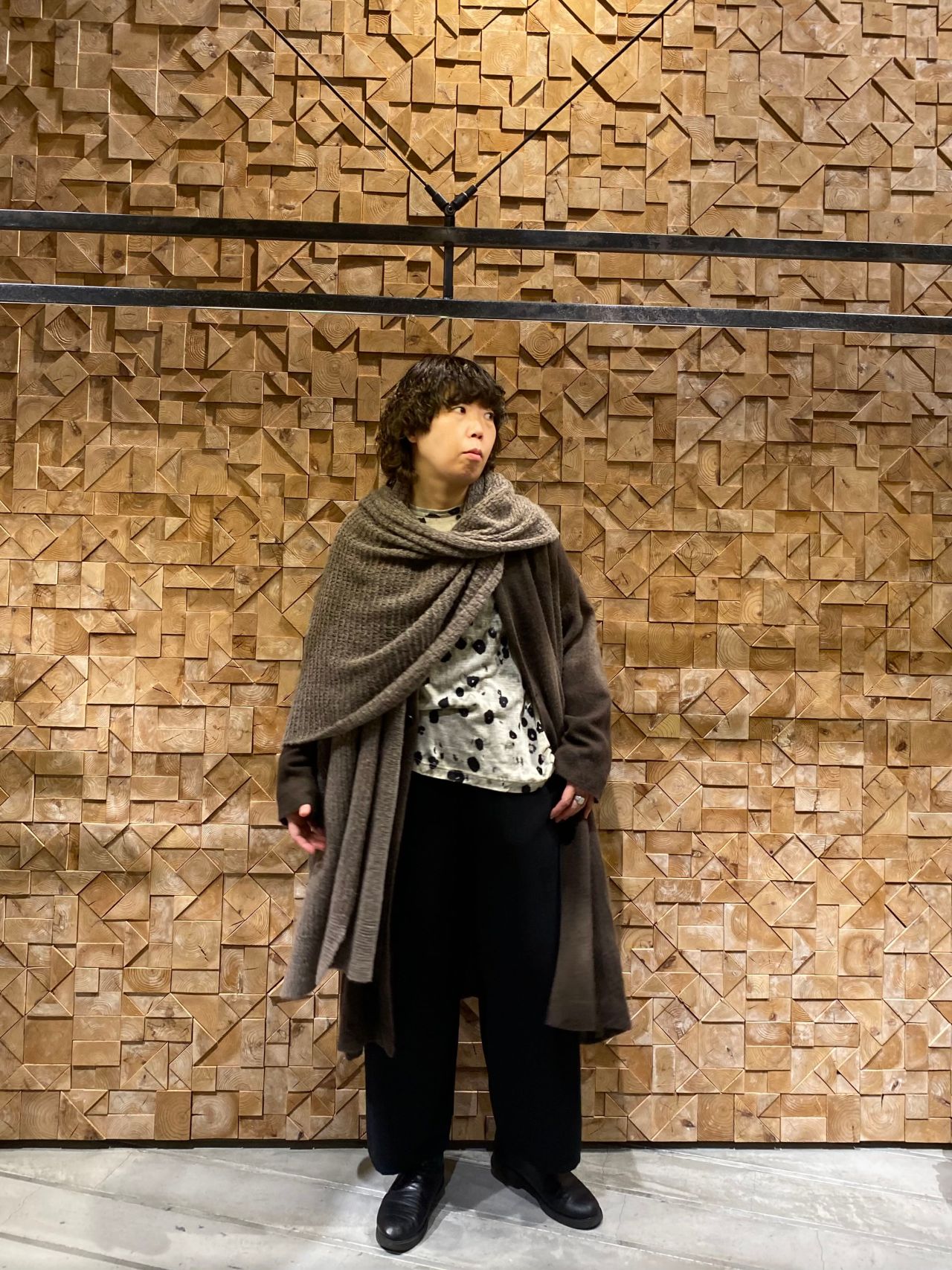 首元はヤク・アルパカ素材のニットストールで暖かさをプラス。