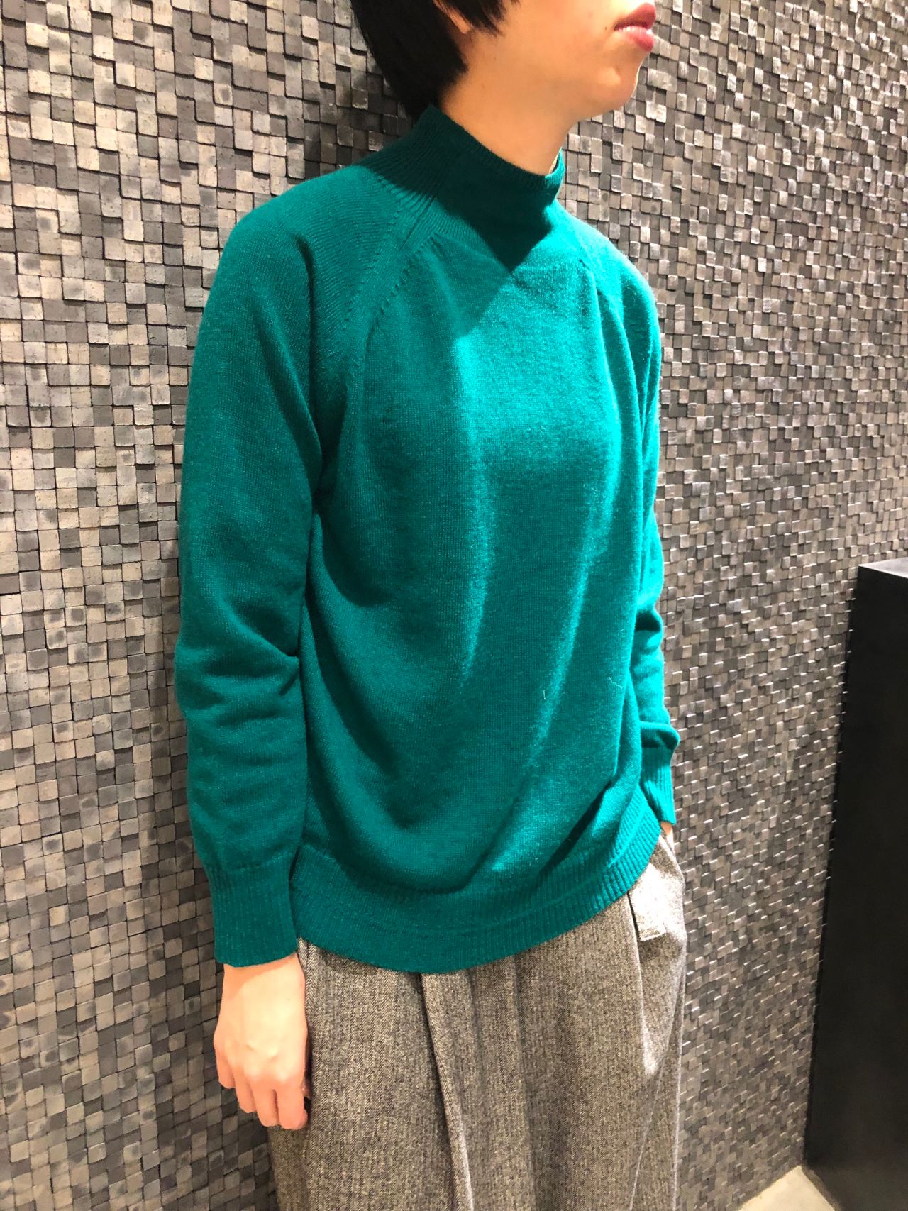鮮やかなグリーンが目を惹くニットはウール100%で軽い着心地。ほどよいハイネックでシンプルで流行問わずお使い頂けます。