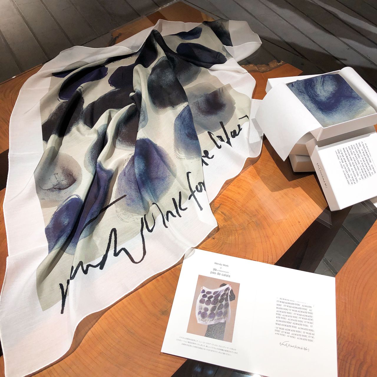 ウェンディ・マーク氏とコラボレーションしたスカーフを合わせてより華やかに。