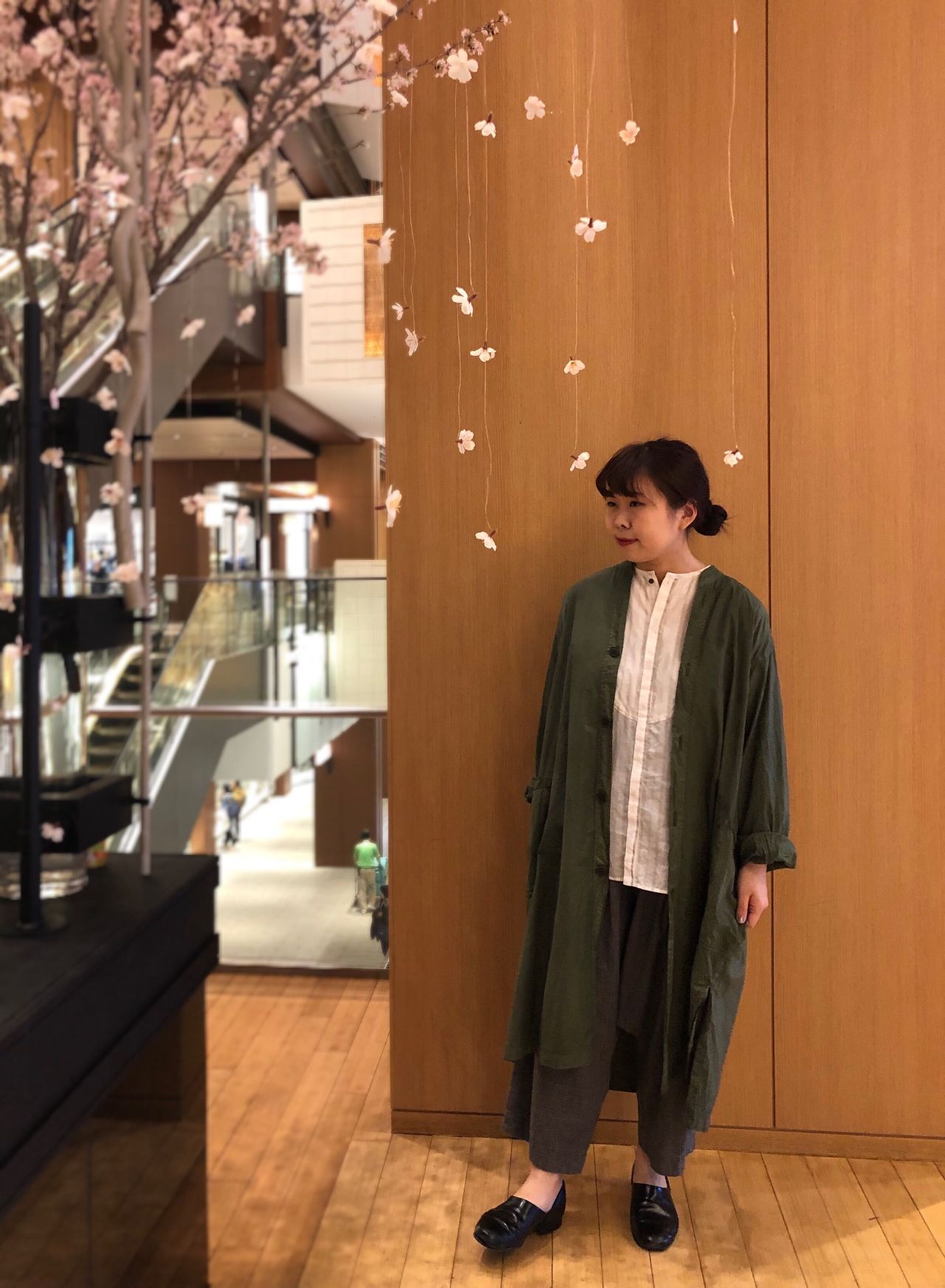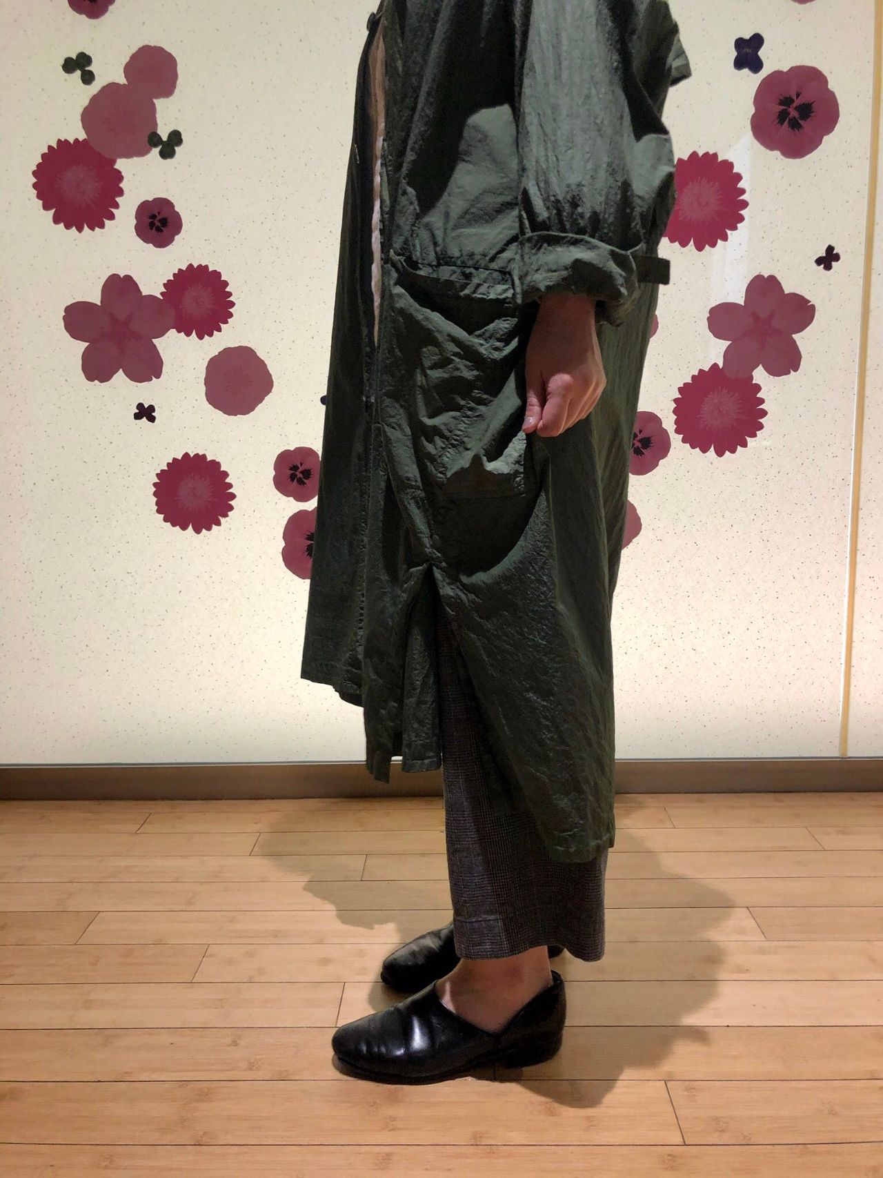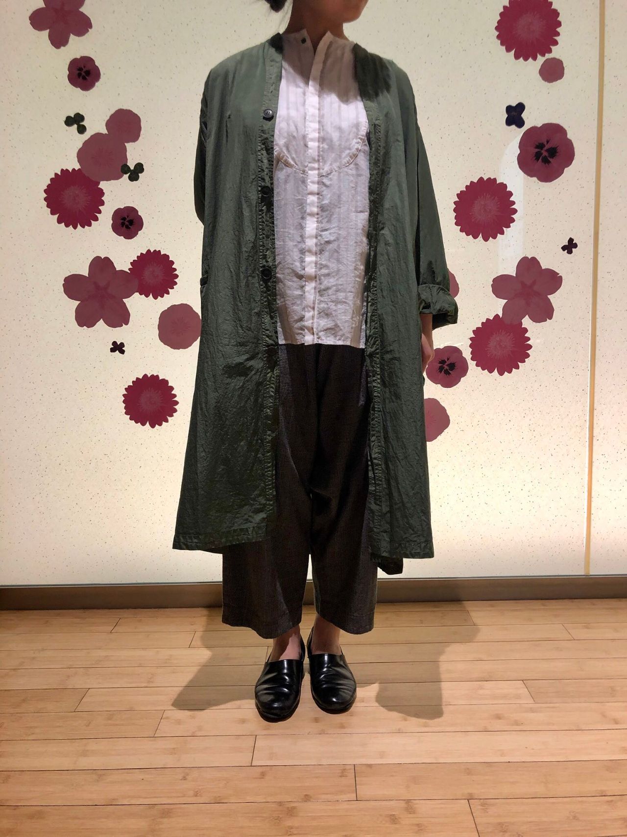 とても軽い生地でシャツ感覚でお召しいただけます。タマネギの皮の色素など天然色素を使用し、優しい色味で表現されたカーキが春の装いにぴったりです。
