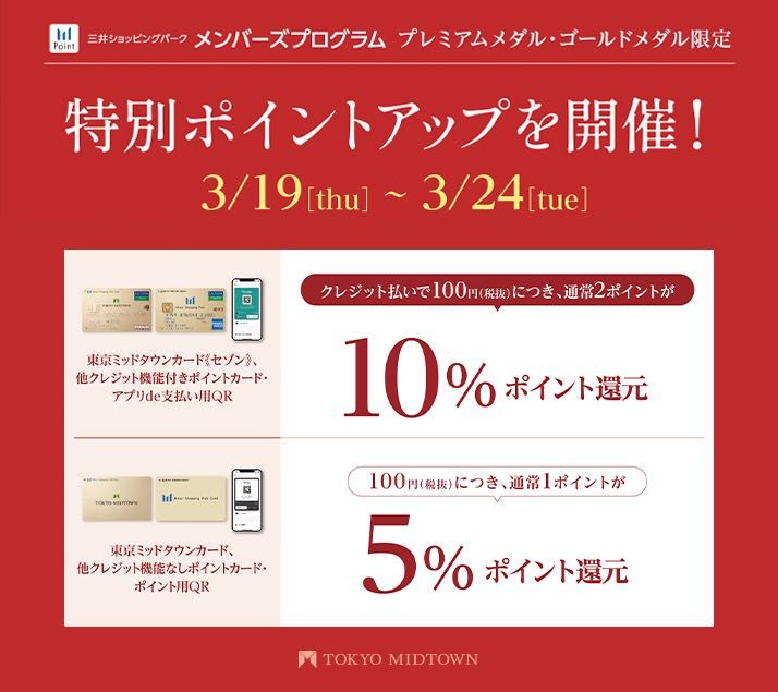 三井ショッピングパーク プレミアムメダル/ゴールドメダル会員様限定ミッドタウンポイントアップキャンペーンを開催いたします。