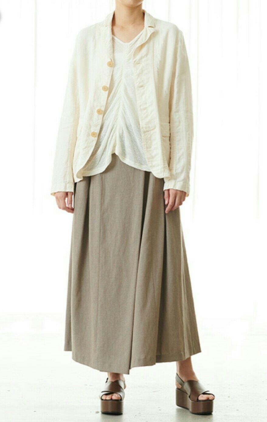 お色はアイボリー、グレーの2色でどんなアイテムにも合わせやすく、生地は兵庫県西脇のジャガード織機を使い低速で織ることでリネンの風合いと膨らみを実現しています。更にワッシャー加工と製品染めする事で柔らかさと程よいムラ感が生まれます。
