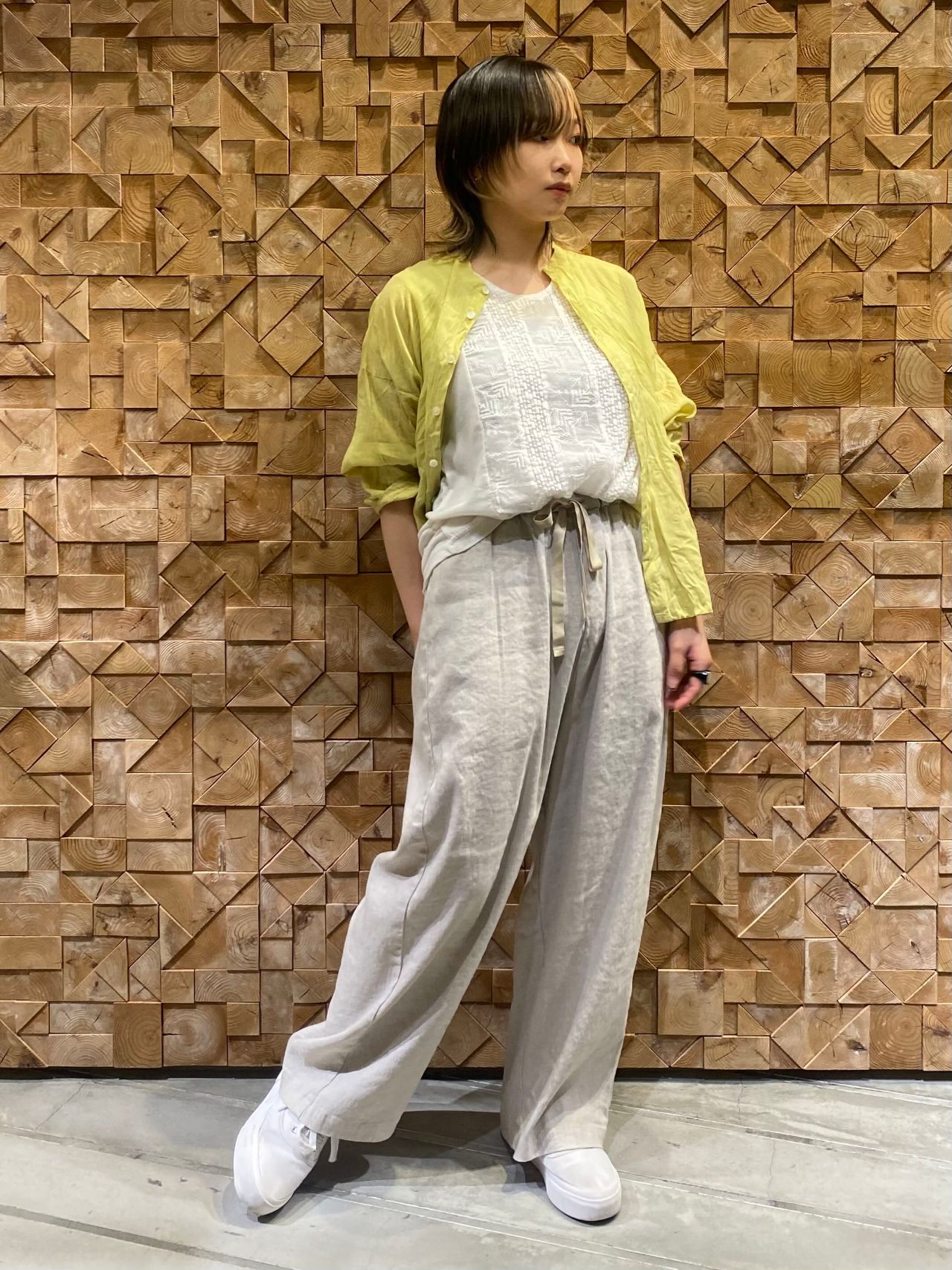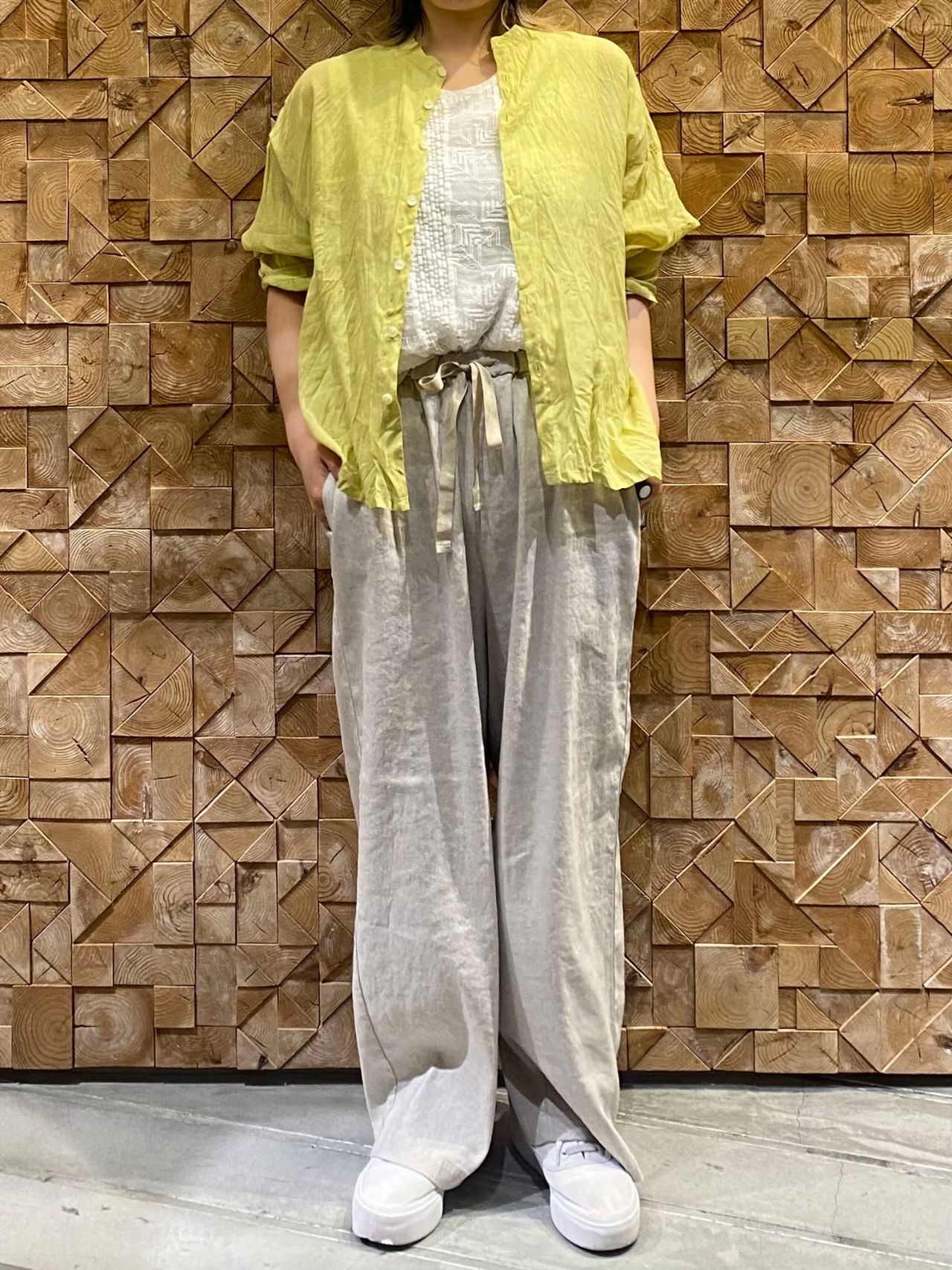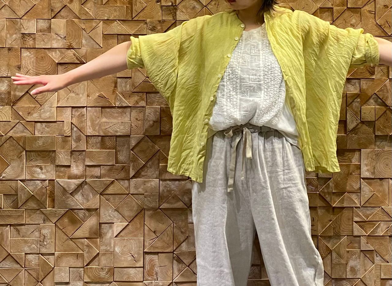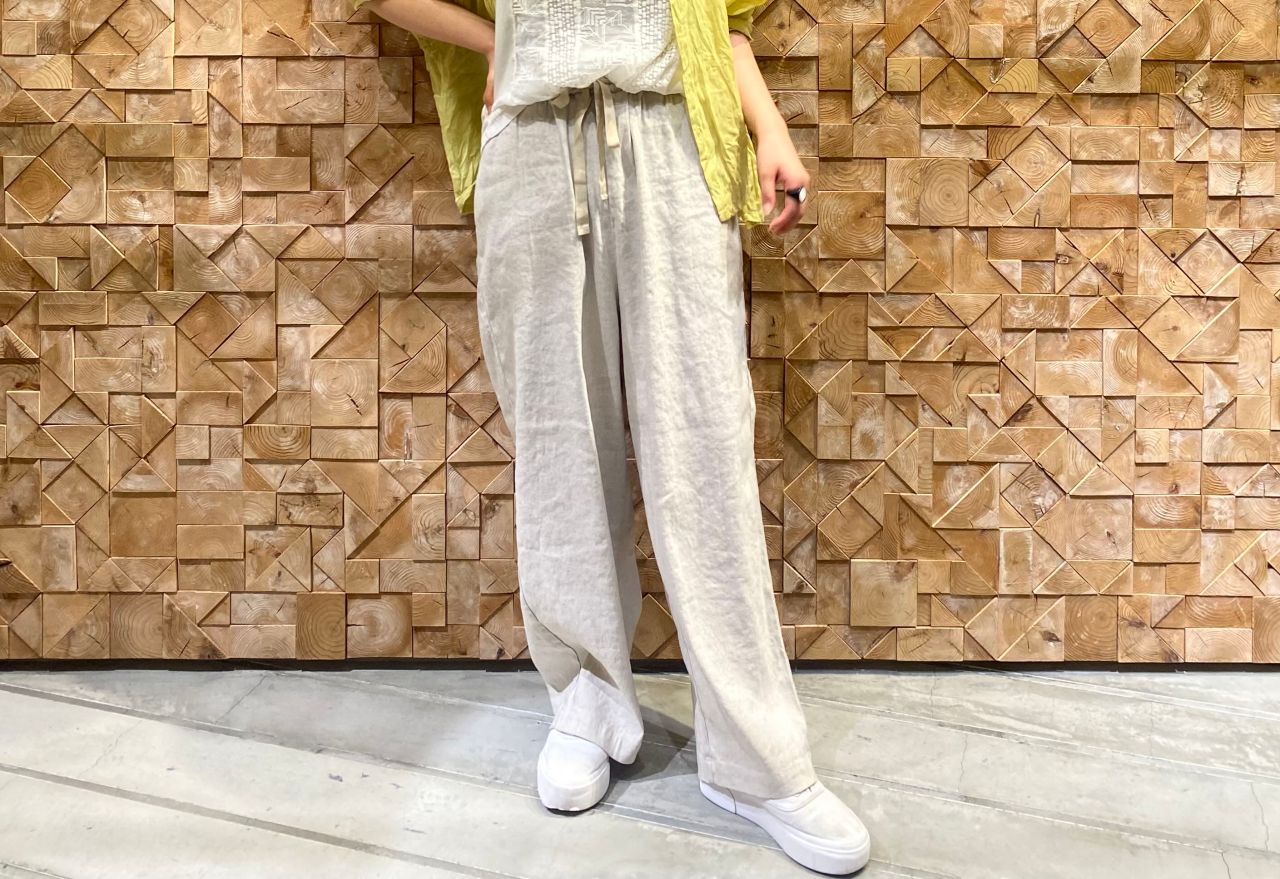 ラミー(苧麻)のシャリ感と光沢を残しつつ、コットンによるソフト感も表現していて、カジュアル感の中にも高級感を併せ持つ素材です。