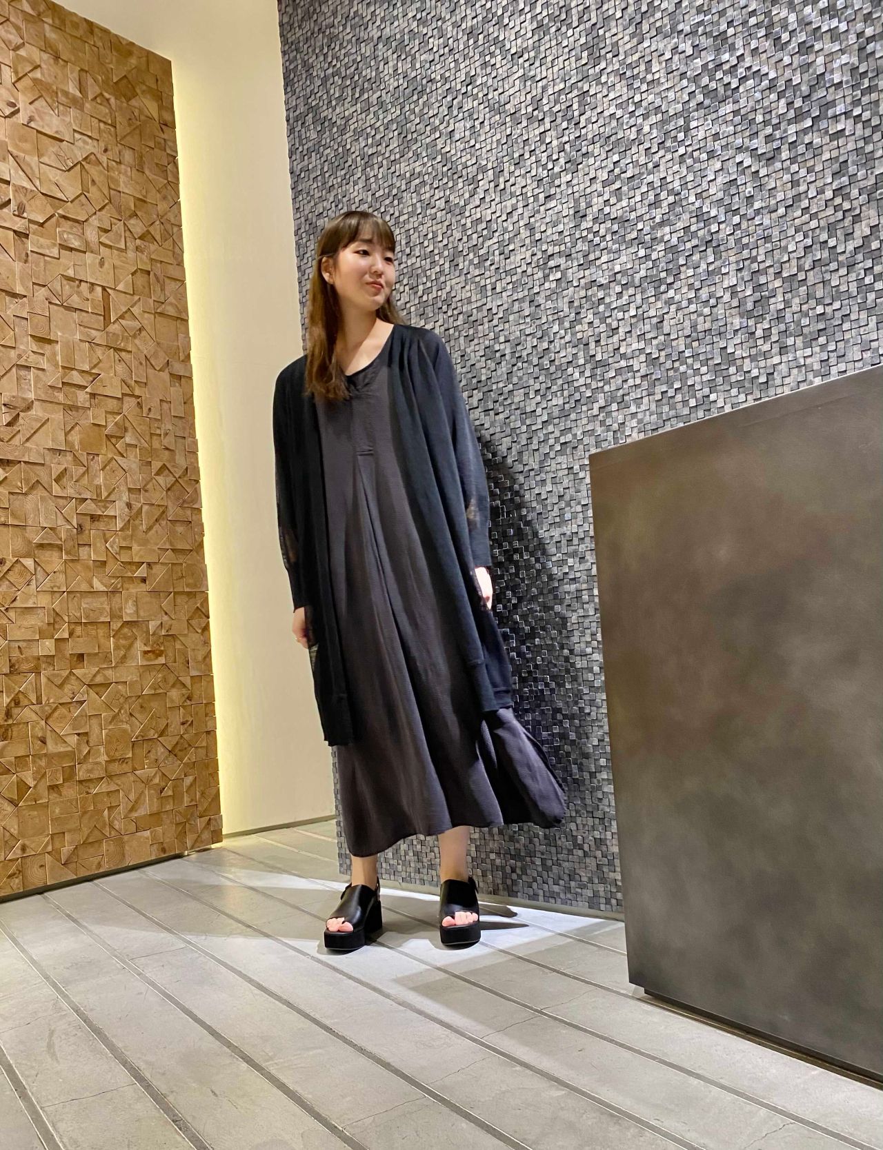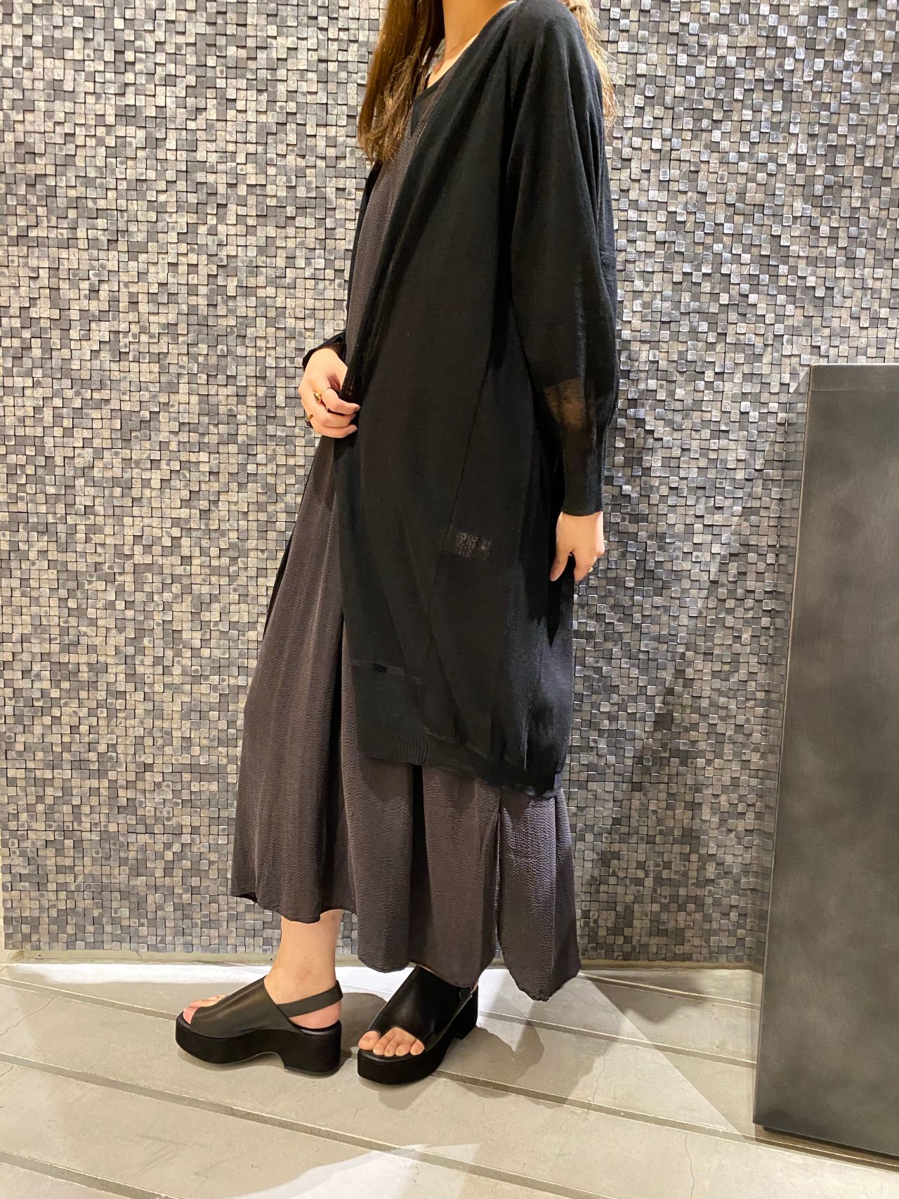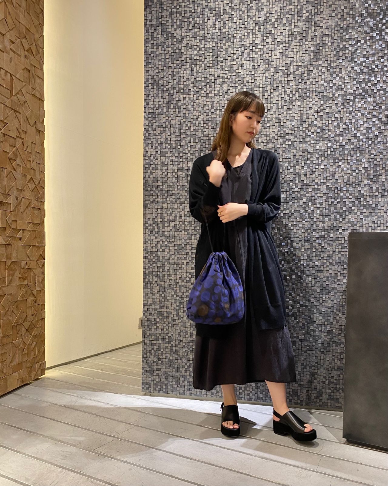 少しヴィンテージ感も感じられるこの巾着を大人な女性が持つイメージをして、ロングニットのサラッとした透け感やワンピースの炭黒っぽい優しい雰囲気が巾着を素敵に引き立たせてくれて大人っぽいコーディネートに。
