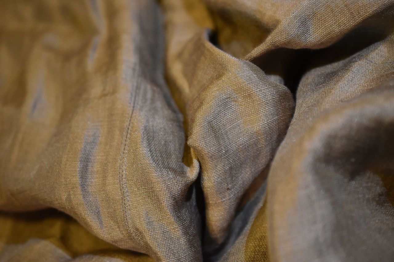 麻70%シルク30%のシルクの程良い光沢感と、綺麗目になり過ぎない縦のシワ感のバランス。
