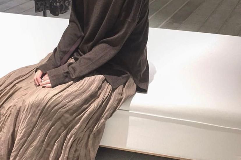 ベージュ系のスカートは、個人的に野暮ったく見えやすいため難しく感じあまり持ってないのですが、この程良い光沢×深みのあるこのベージュの組み合わせはその当時一目惚れ。
