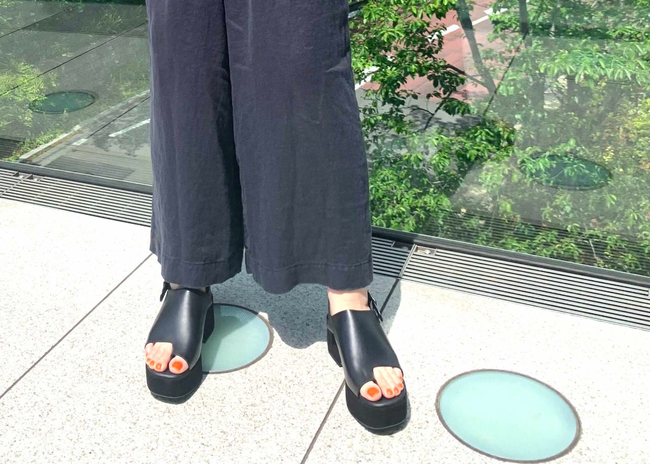 黒スタイリングの足元は、サンダルとオレンジネイルで抜け感を。