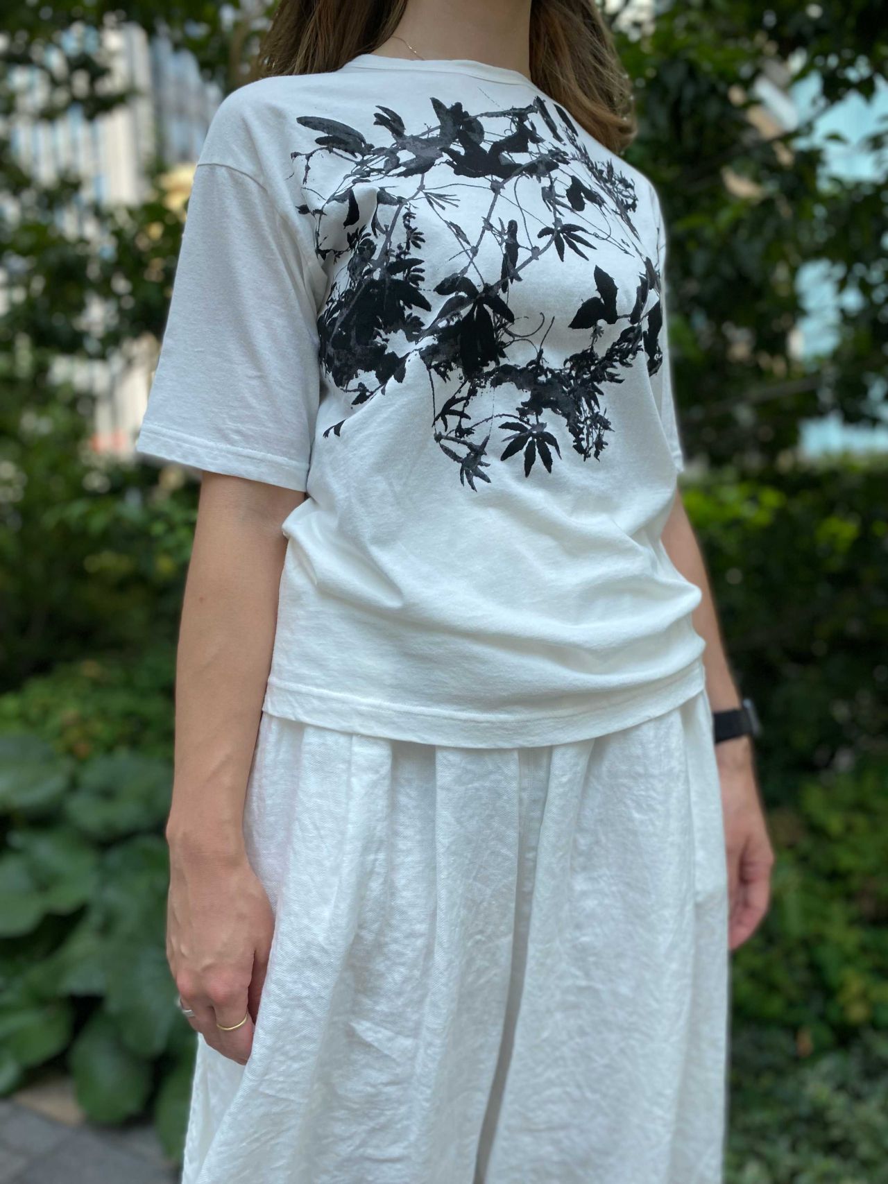 1枚でも存在感のあるプリントは、ワントーンスタイリングのアクセントにもなり、より上品な雰囲気に。