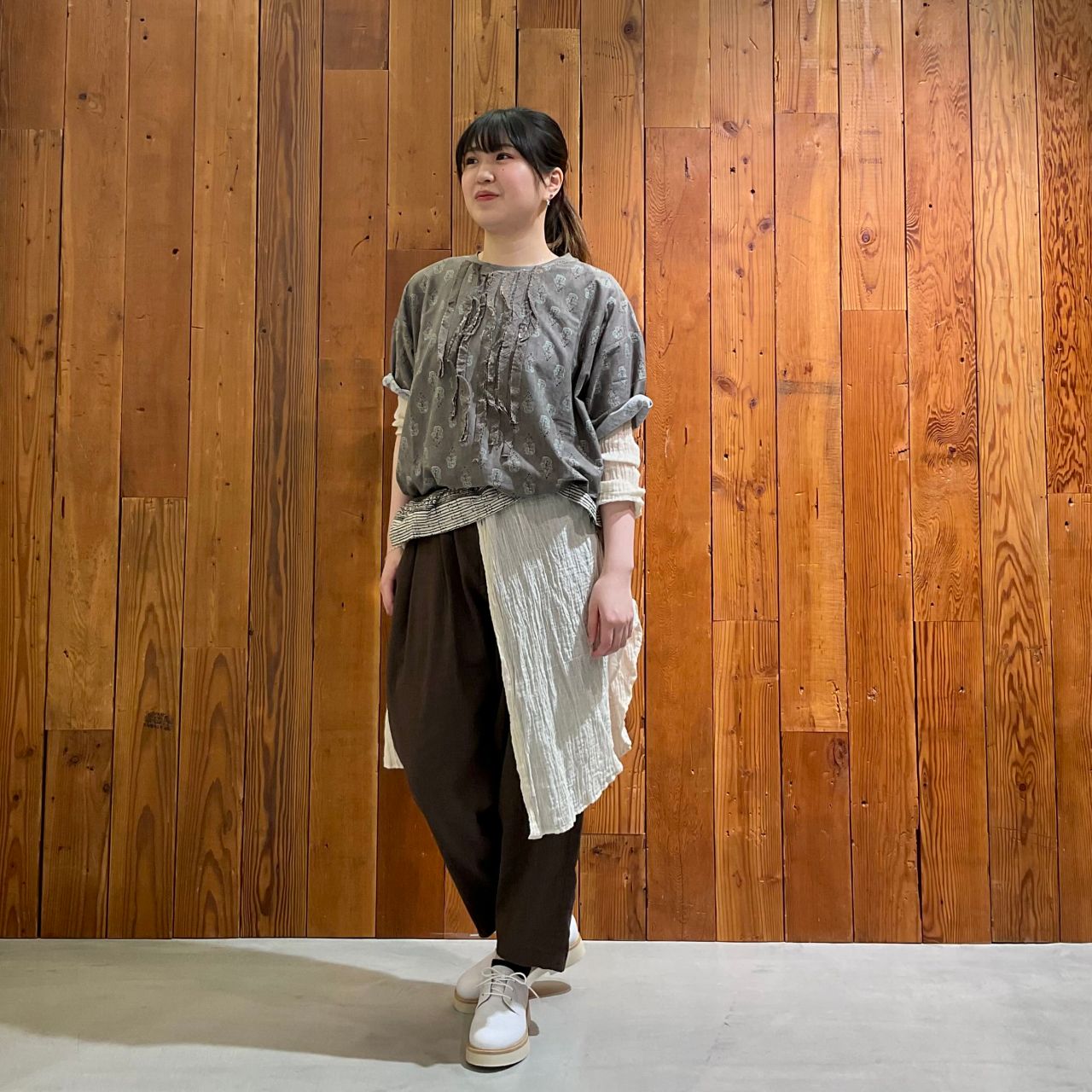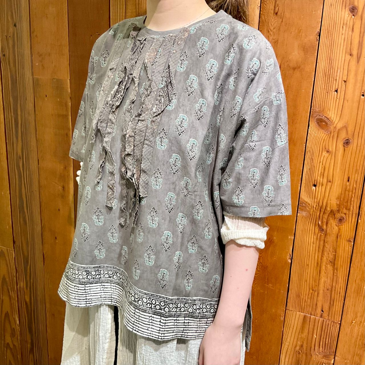 一つ一つ手作業で行うブロックプリントのムラ感をプリントで表現し、更に別地のブロックプリントを胸元にあしらいアクセントのあるデザインです。