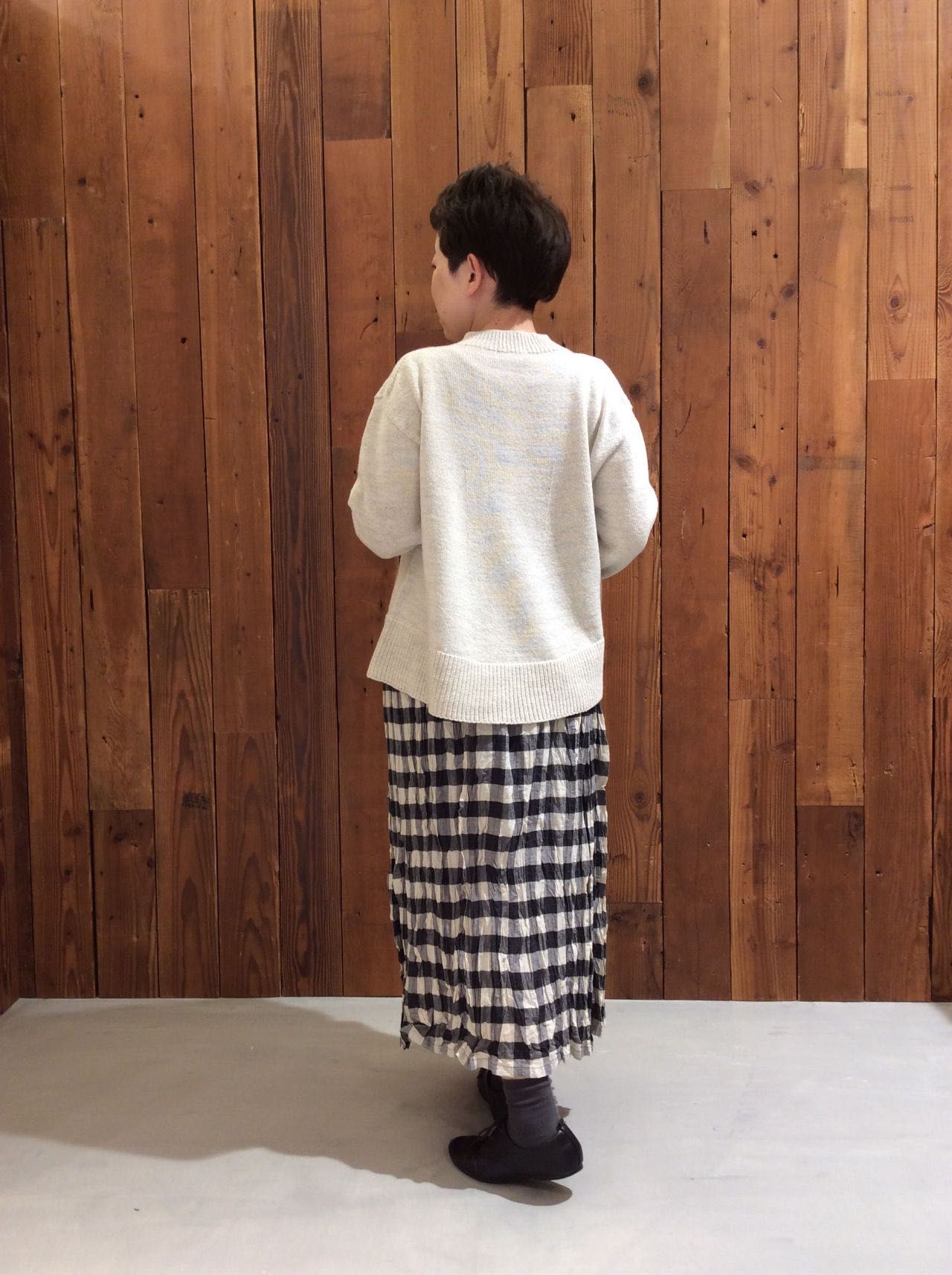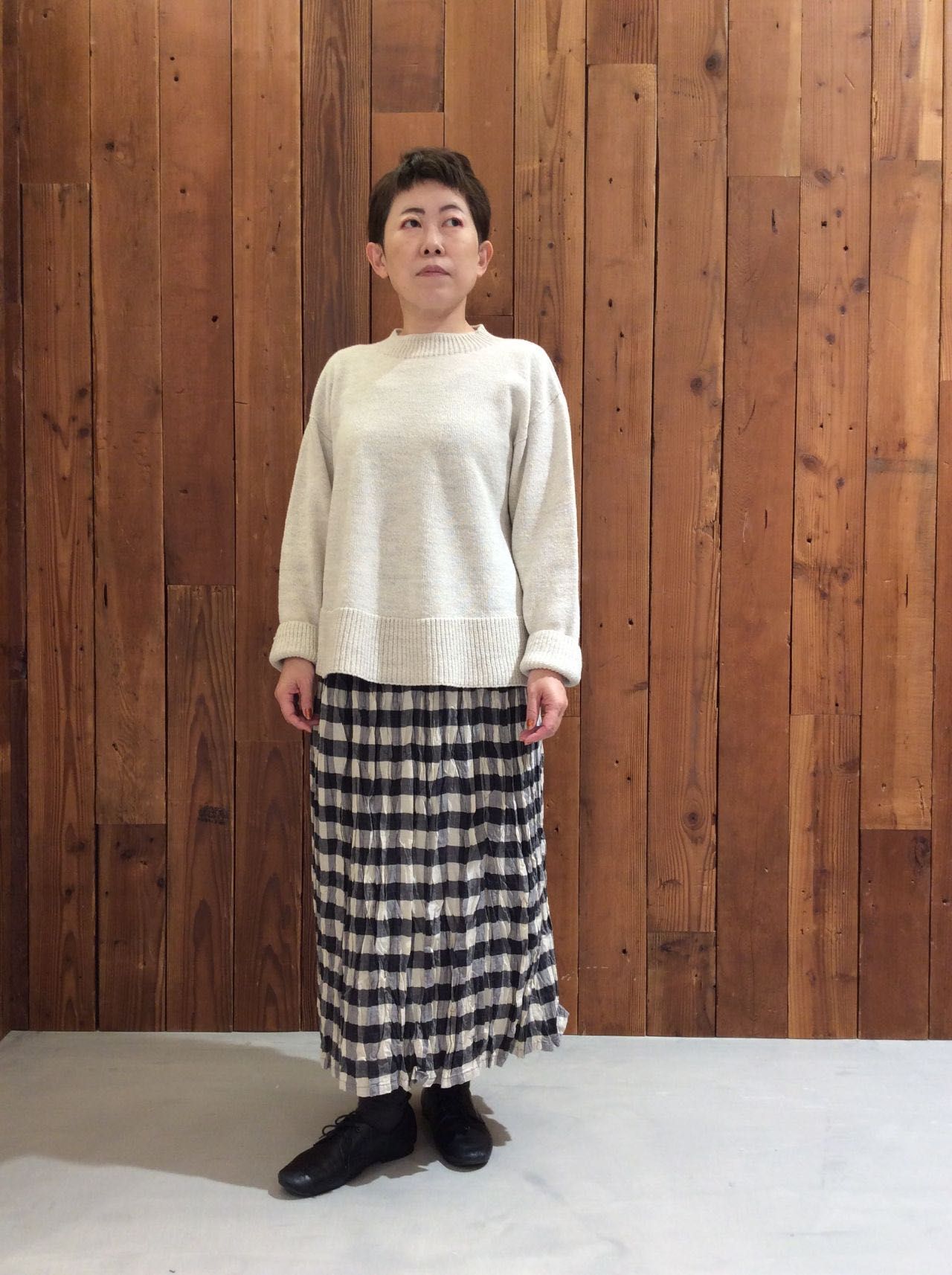 こちらはシンプルなコットンウールのニットとのコーディネート。