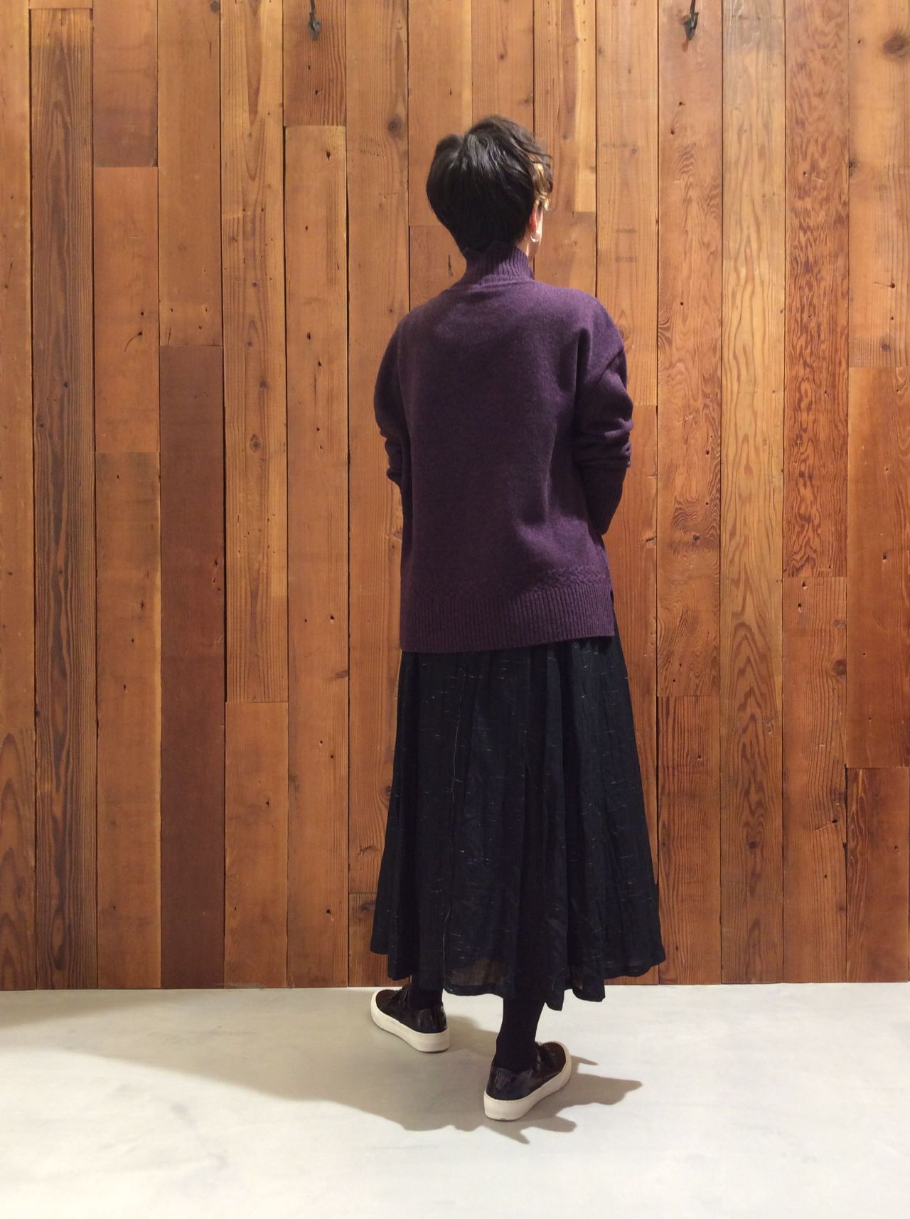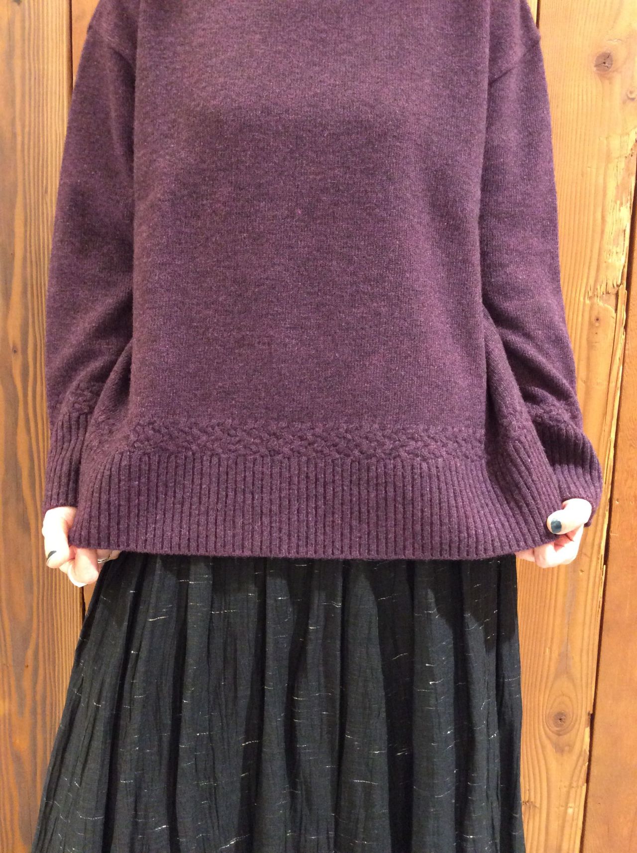 形はシンプルですが、裾や首の後ろ部分に入れたスリットや袖や裾の柄編みなど、パドカレらしい小技をきかせています。