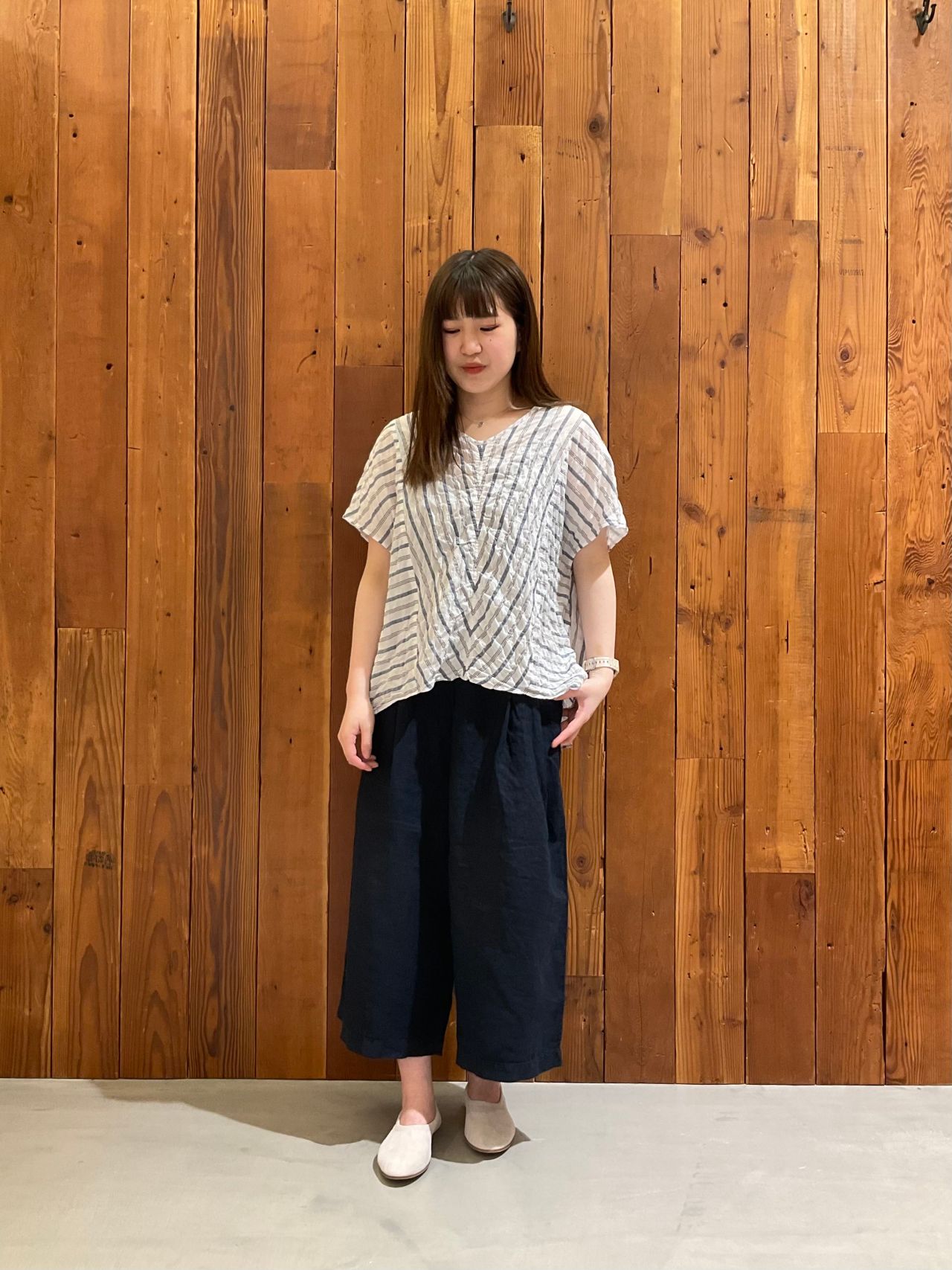 フレンチスリーブのコンパクトなサイズ感なので、ワイドパンツやスカートとも合わせやすいです